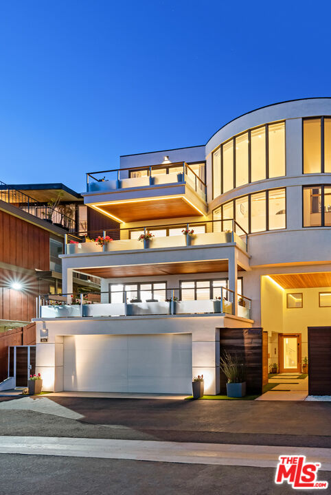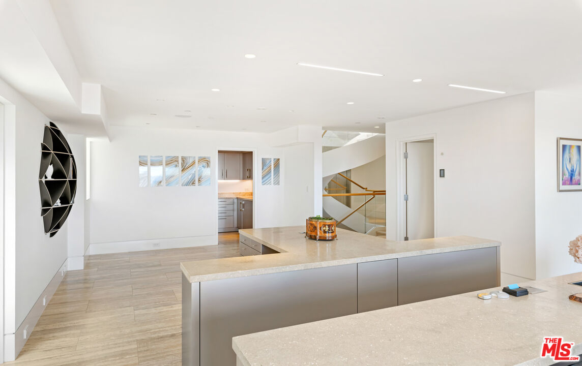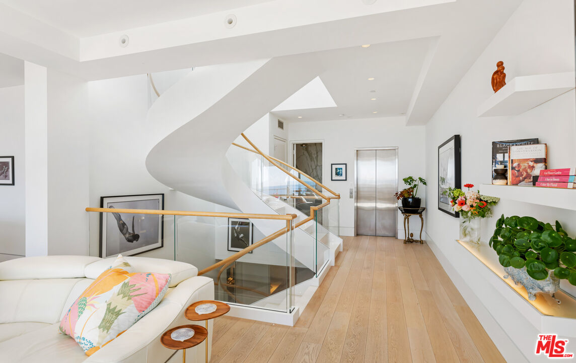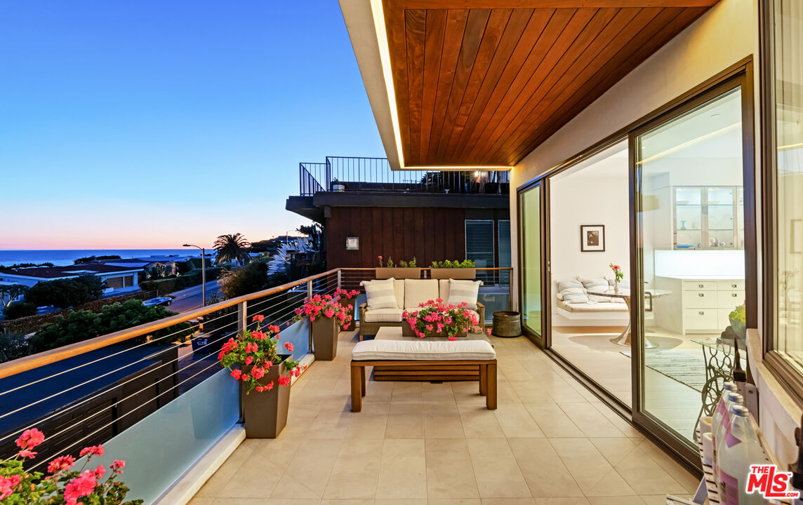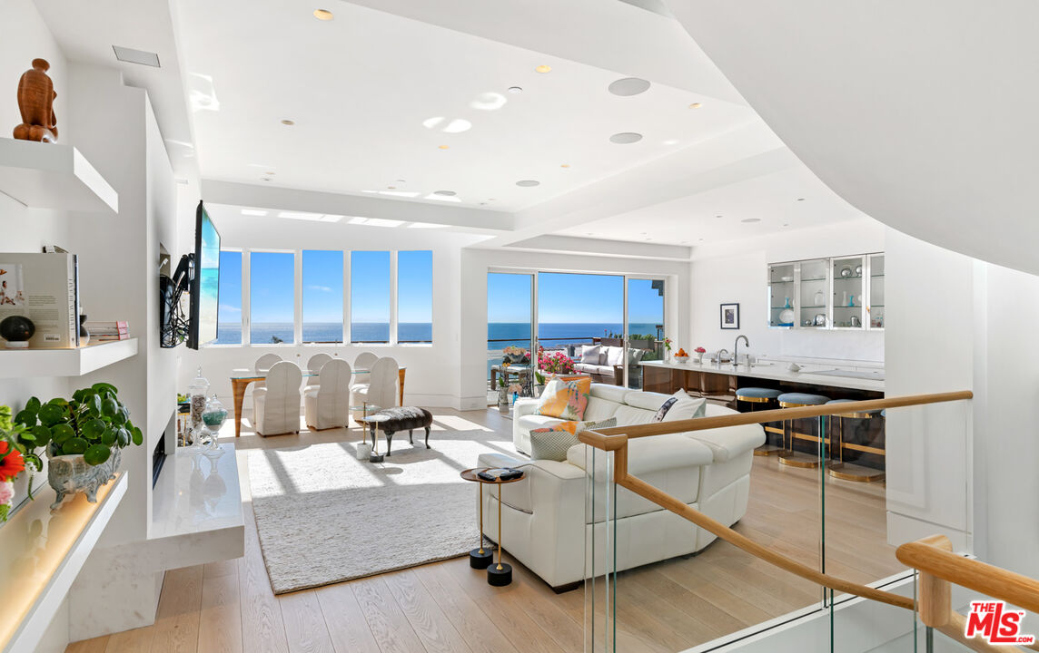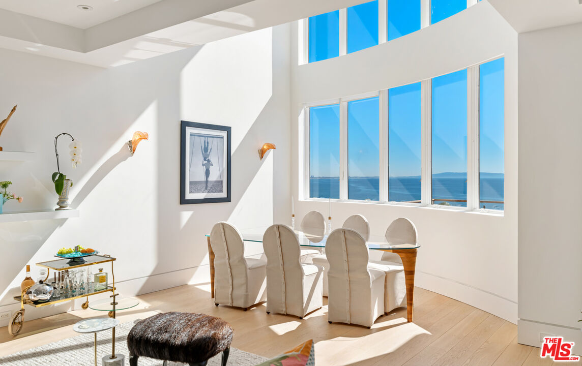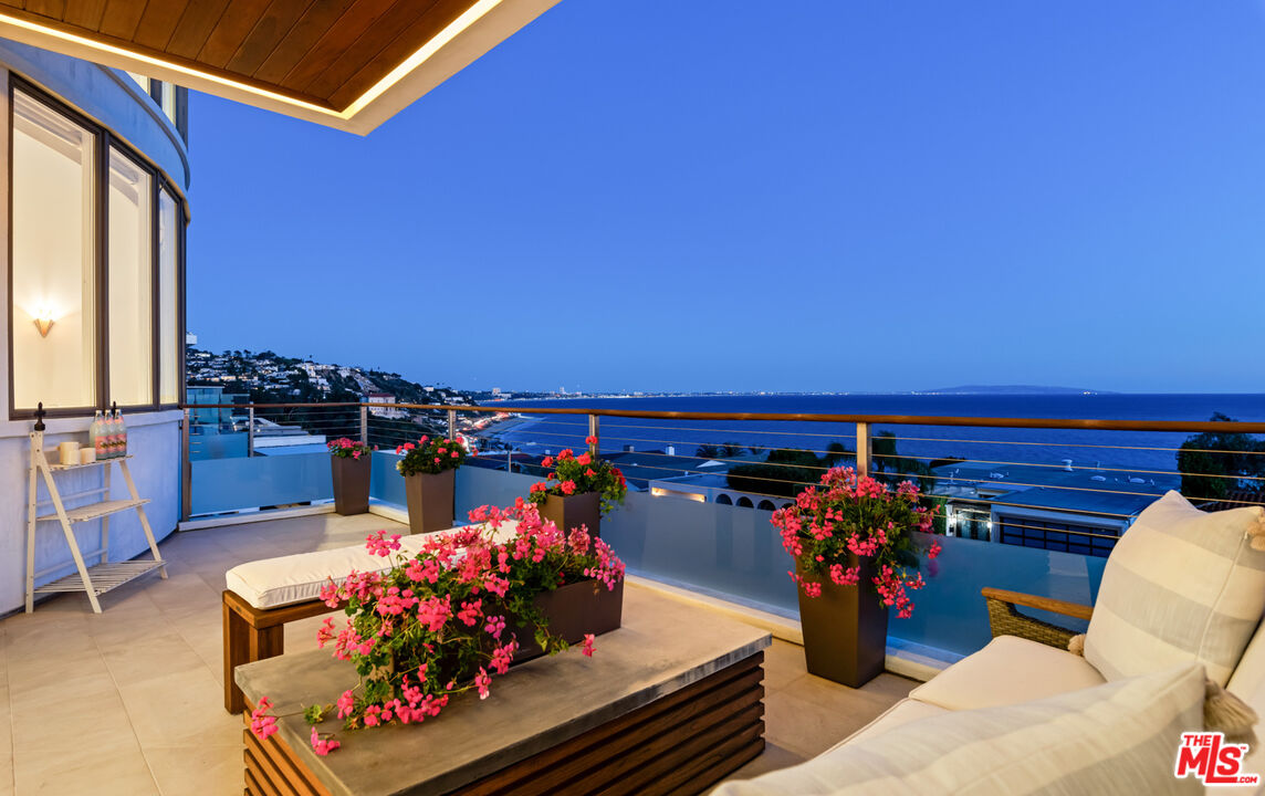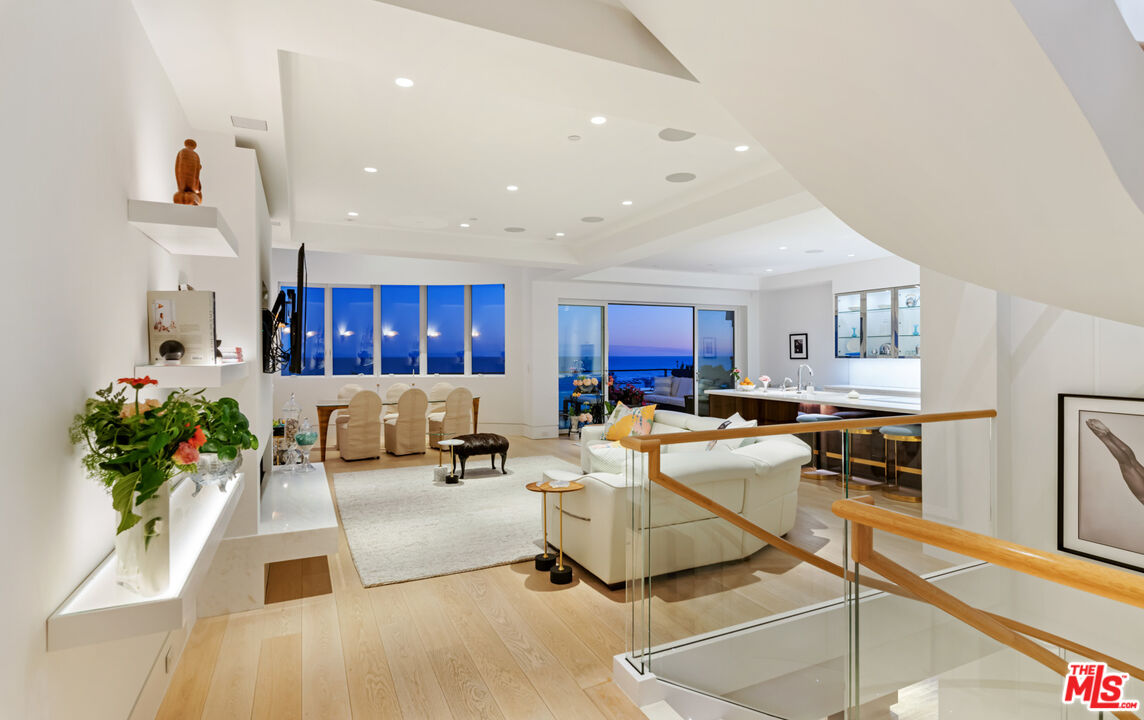 On the market for the first time, this open and airy contemporary residence is a study in dramatic lines and breathtaking 180 ocean views. One-half of a new duplex, with three balconies and a private commercial elevator serving all levels, the home is exquisitely finished with European white oak throughout, exceptionally high ceilings, and walls of glass to take in the full sweep of the Queen's necklace, Palos Verdes, Catalina, and the ever-changing ocean panorama from sunrise to sunset. On the entry-level is a large foyer, where one wall features an illuminated Brazilian gemstone display. Also on this level is a full bath, a mud room with storage closets, a huge laundry room with a dog-washing station, and access to the three-car garage, where there is additional storage. Up one floor, by way of the elevator or the handsome limestone stairs, the central space is wide and open, currently used as an office, complete with a separate entry. With travertine floors, a powder room, a separate office/bonus room, a kitchenette, and a bedroom, this level has a covered balcony with sensational views and ample room for dining and socializing. The spectacular custom spiral staircase begins on this level, with curved glass panels, bent wood rail, stair lights, and overhead, a 9-foot by 12-foot retractable glass roof/skylight that opens fully.One floor up, the home's main living area is a spacious ocean-view living/dining/kitchen great room with a wide balcony for al fresco dining, lounging, and entertaining. The living area has high, tray ceilings with recessed lighting, illuminated display shelving, and a striking quartzite fireplace. The dining area, with double-height ceilings, is flanked by two stories of bow windows. The kitchen is designed to a chef's requirements, with a huge quartzite island and countertops, bar seating, top-of-the-line appliances, museum-glass cabinets, breakfast nook, and walk-in pantry. Also on this level is a powder room with Calacatta Gold marble floor-to-ceiling wall and an en-suite guest bedroom with a separate entrance. On the top floor, the spiral staircase opens onto a roomy loft-style mezzanine and, beyond that, the primary suite. This stunning sanctuary features a dual tray ceiling with dimensional plasterwork and soffit lighting, oak floors, dual custom closets, dual spa-style baths, and a private lounging balcony with spectacular views. Among the home's many additional amenities are three-zone air conditioning, heated bathroom floors, remote-controlled shades, a private fragrant rose garden, an enclosed yard at the back, and smart-home systems throughout. With the easy access of Sunset Mesa and the expansive views of coastal living, this elegant modern residence is designed for lively entertaining and non-stop comfort.Interested in this Listing?