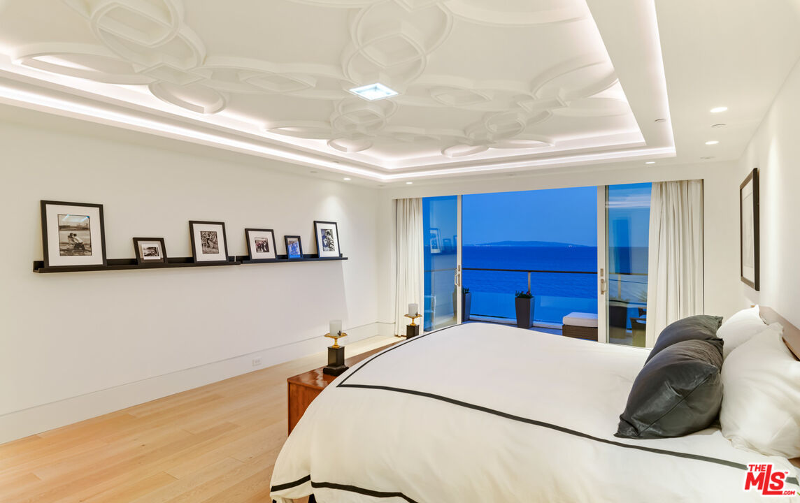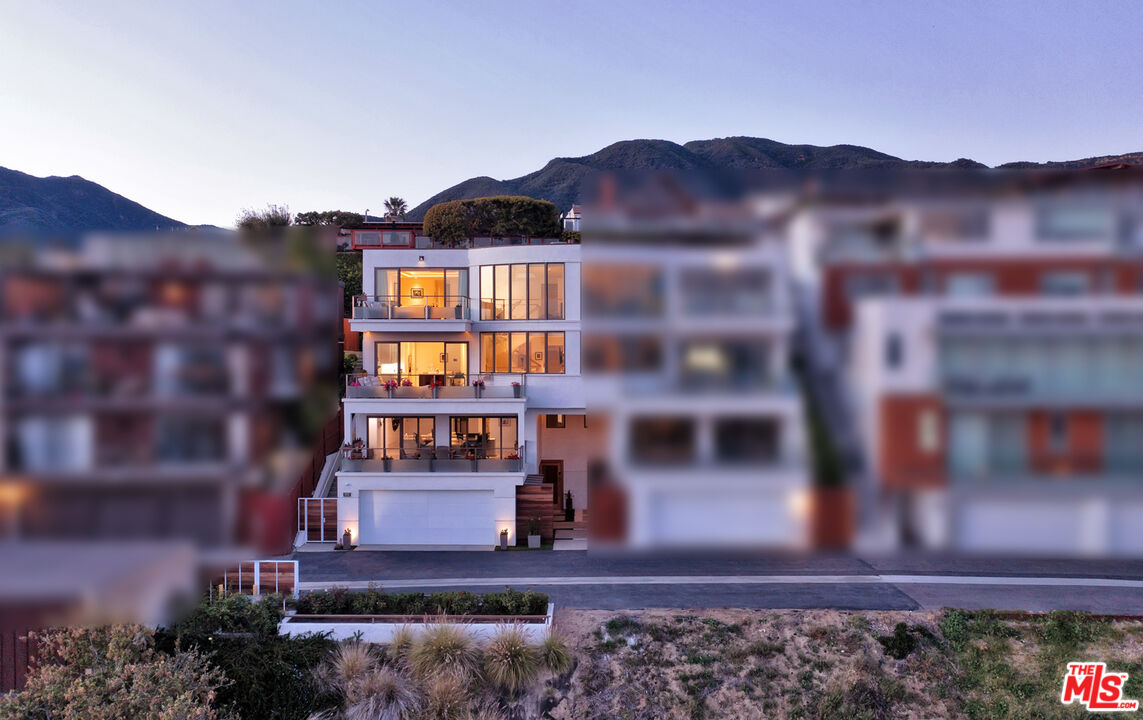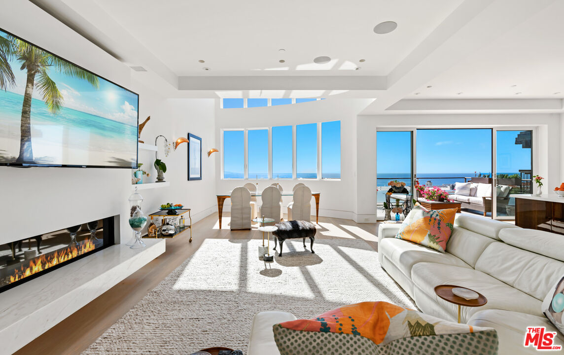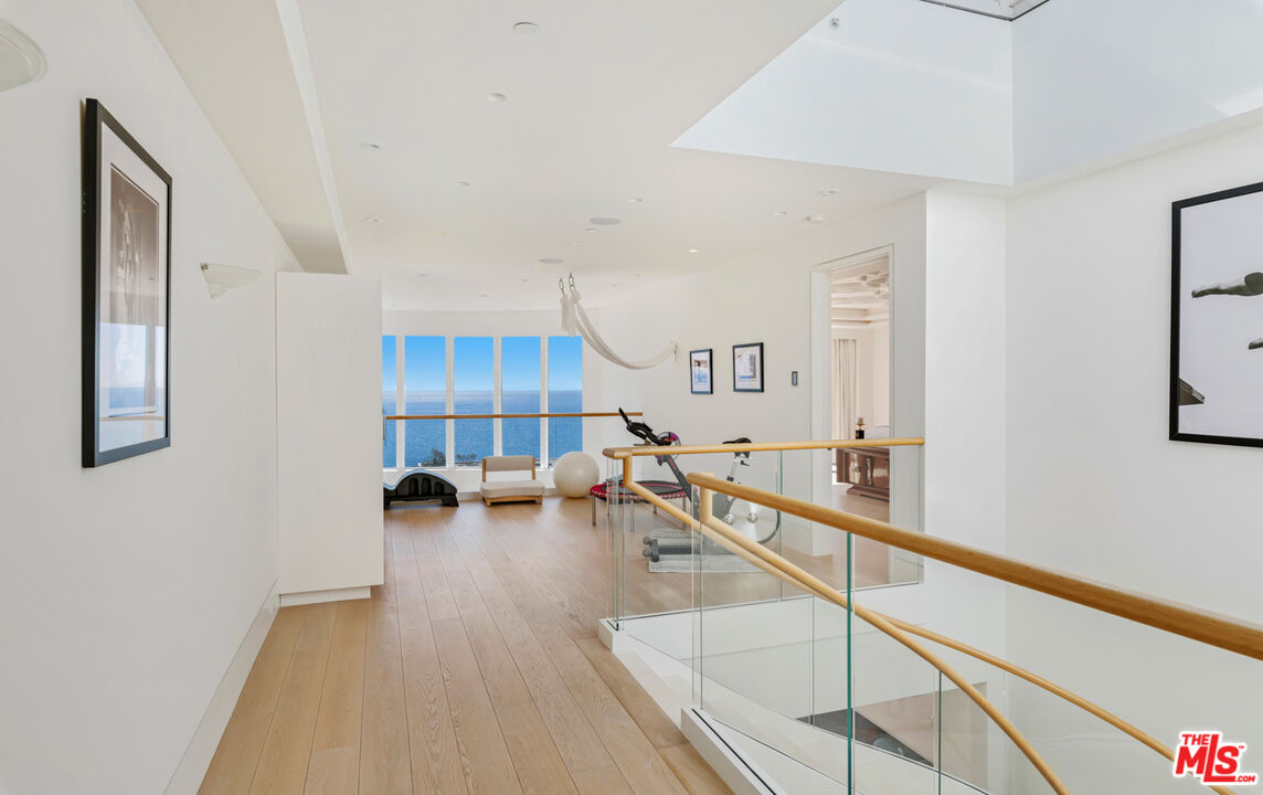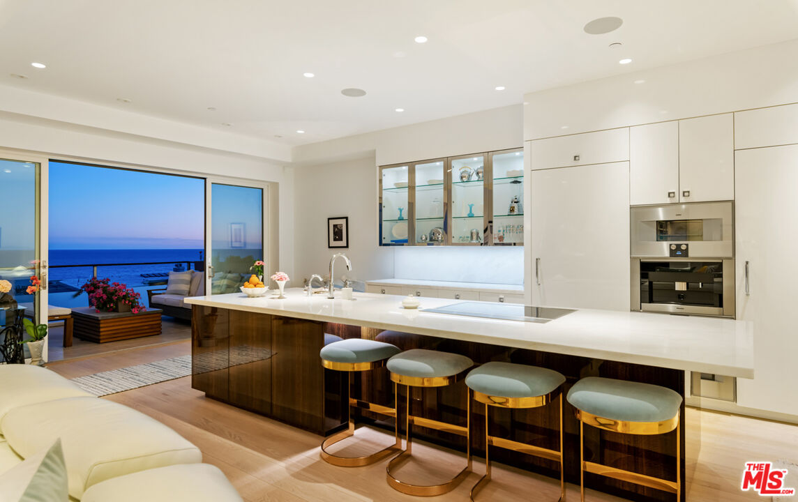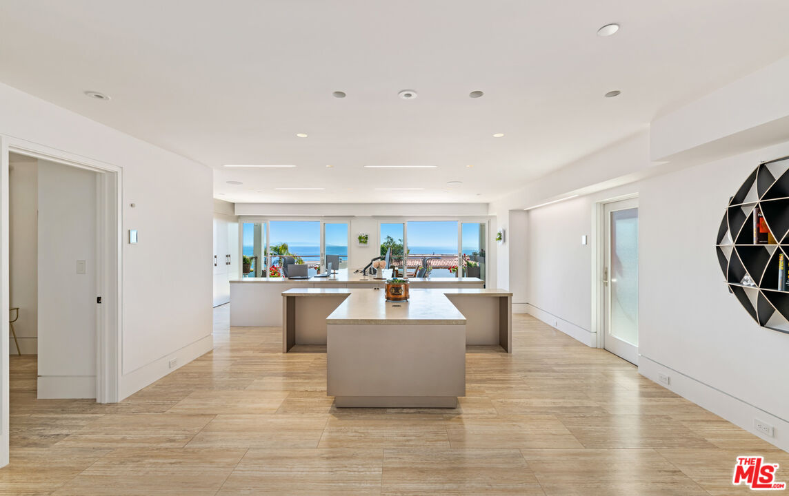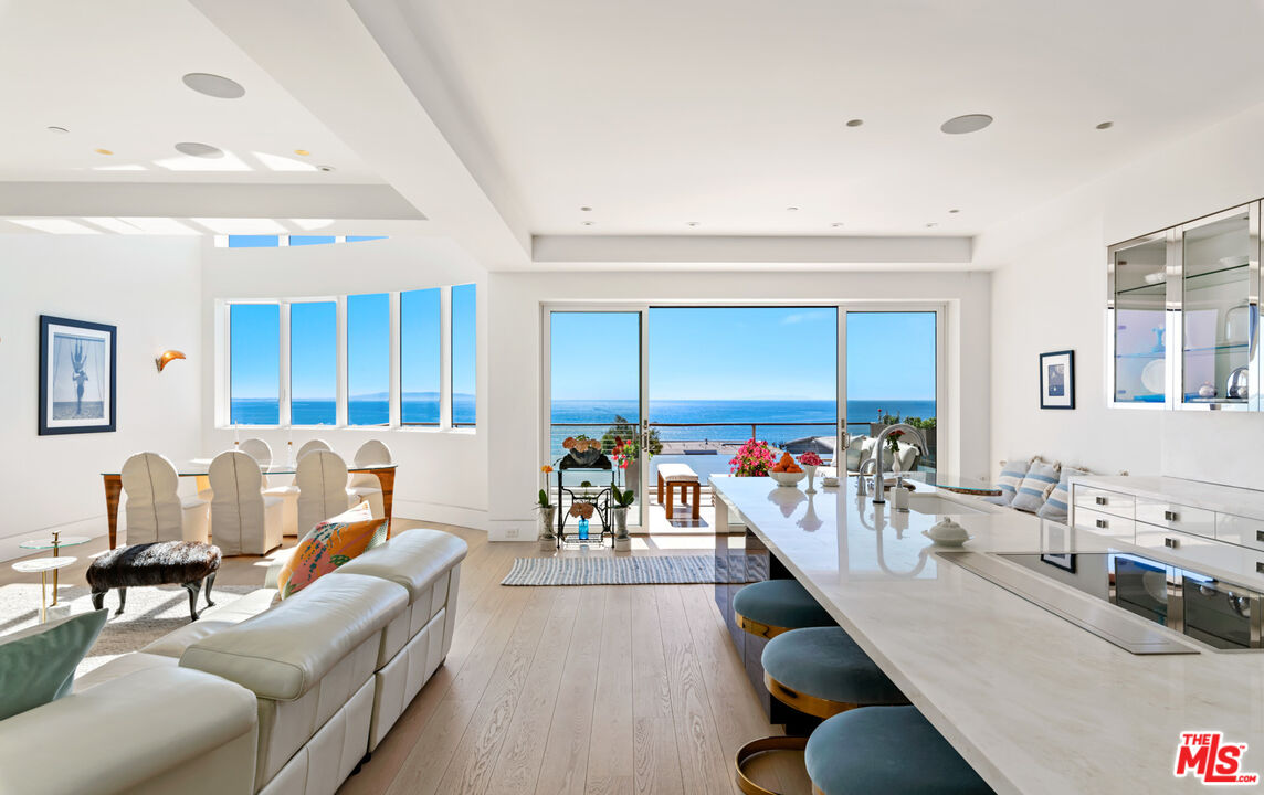 On the market for the first time, this open and airy contemporary residence is a study in dramatic lines and breathtaking 180 ocean views. One-half of a new duplex, with three balconies and a private commercial elevator serving all levels, the home is exquisitely finished with European white oak throughout, exceptionally high ceilings, and walls of glass to take in the full sweep of the Queen's necklace, Palos Verdes, Catalina, and the ever-changing ocean panorama from sunrise to sunset. On the entry-level is a large foyer, where one wall features an illuminated Brazilian gemstone display. Also on this level is a full bath, a mud room with storage closets, a huge laundry room with a dog-washing station, and access to the three-car garage, where there is additional storage. Up one floor, by way of the elevator or the handsome limestone stairs, the central space is wide and open, currently used as an office, complete with a separate entry. With travertine floors, a powder room, a separate office/bonus room, a kitchenette, and a bedroom, this level has a covered balcony with sensational views and ample room for dining and socializing. The spectacular custom spiral staircase begins on this level, with curved glass panels, bent wood rail, stair lights, and overhead, a 9-foot by 12-foot retractable glass roof/skylight that opens fully.One floor up, the home's main living area is a spacious ocean-view living/dining/kitchen great room with a wide balcony for al fresco dining, lounging, and entertaining. The living area has high, tray ceilings with recessed lighting, illuminated display shelving, and a striking quartzite fireplace. The dining area, with double-height ceilings, is flanked by two stories of bow windows. The kitchen is designed to a chef's requirements, with a huge quartzite island and countertops, bar seating, top-of-the-line appliances, museum-glass cabinets, breakfast nook, and walk-in pantry. Also on this level is a powder room with Calacatta Gold marble floor-to-ceiling wall and an en-suite guest bedroom with a separate entrance. On the top floor, the spiral staircase opens onto a roomy loft-style mezzanine and, beyond that, the primary suite. This stunning sanctuary features a dual tray ceiling with dimensional plasterwork and soffit lighting, oak floors, dual custom closets, dual spa-style baths, and a private lounging balcony with spectacular views. Among the home's many additional amenities are three-zone air conditioning, heated bathroom floors, remote-controlled shades, a private fragrant rose garden, an enclosed yard at the back, and smart-home systems throughout. With the easy access of Sunset Mesa and the expansive views of coastal living, this elegant modern residence is designed for lively entertaining and non-stop comfort.Interested in this Listing?