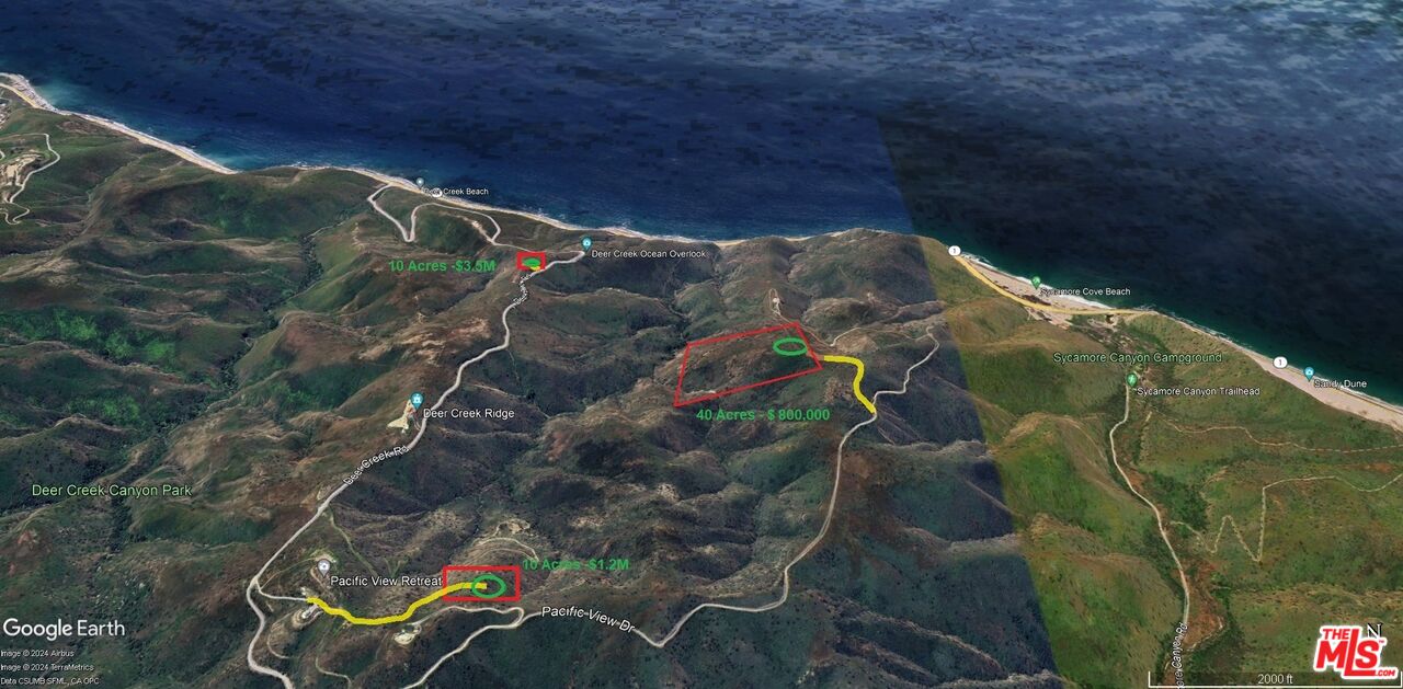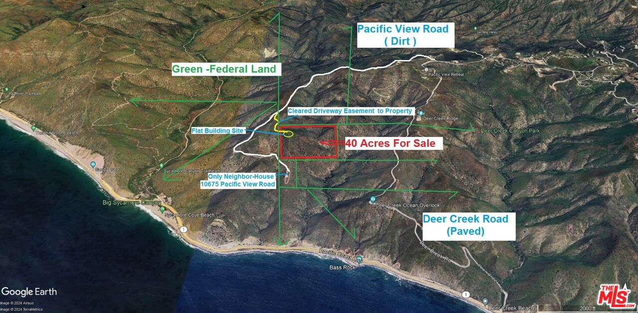 Ultimate Spectacular Ocean View Malibu Mountain Top Estate Lot - 40 Acres ! Incredible forever views of coastline, whitewater and Islands in every directions . Private Retreat Site with three sides of this property bordering thousands of acres of Federal Land to the ocean with only one neighbor 1/2 mile below property . Huge flat building site with insurable easement access driveway to property off of Pacific View Road. Driveway to building site was recently cleared of weeds and easy to walk on to view property. Located approximately 4 miles from PCH with 3 miles of paved roads and 1 miles plus of graded roads to property driveway. There are no reports or studies yet completed on this property. When developed this will be a 10 to 20 million dollar or more estate property.Interested in this Listing?