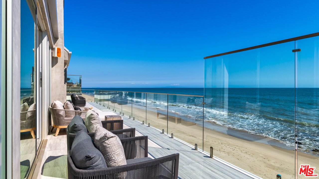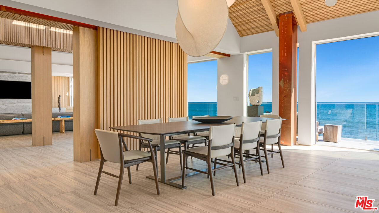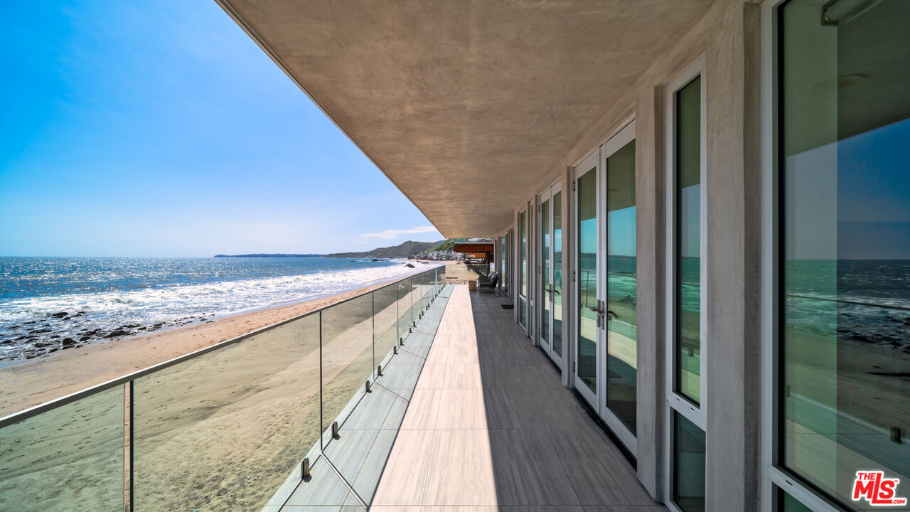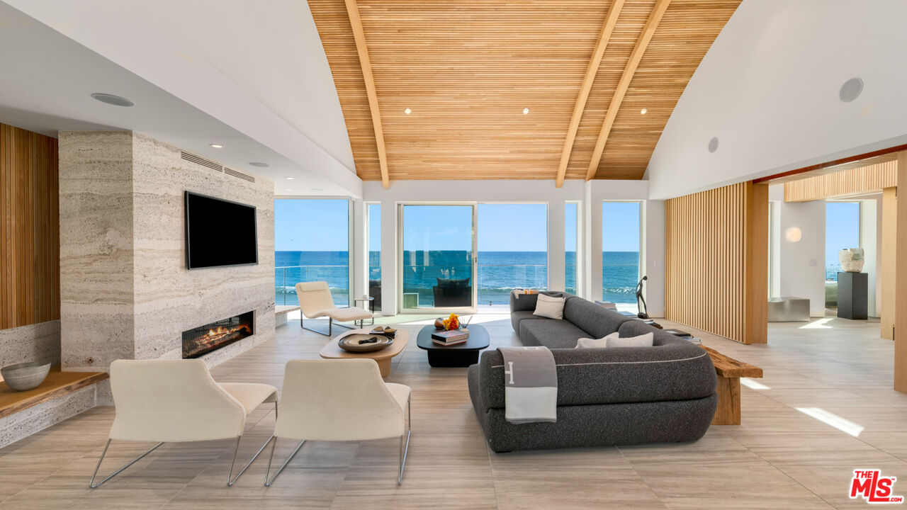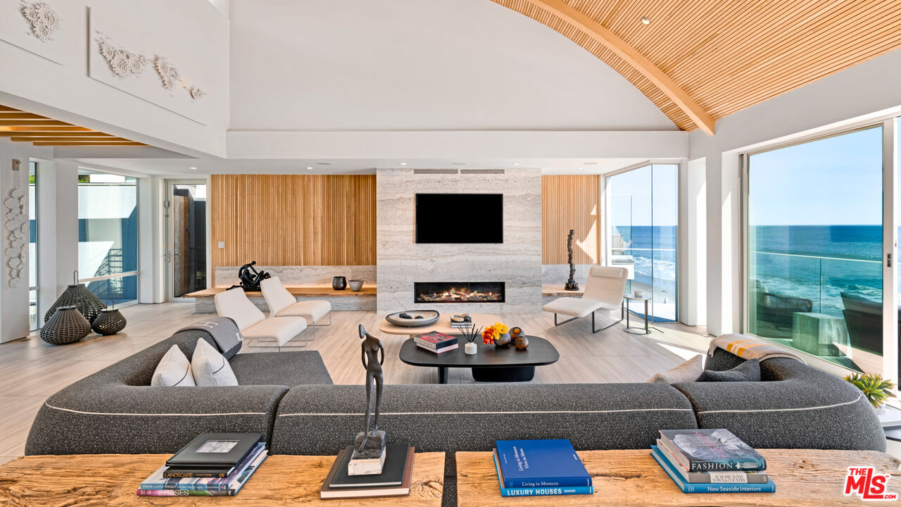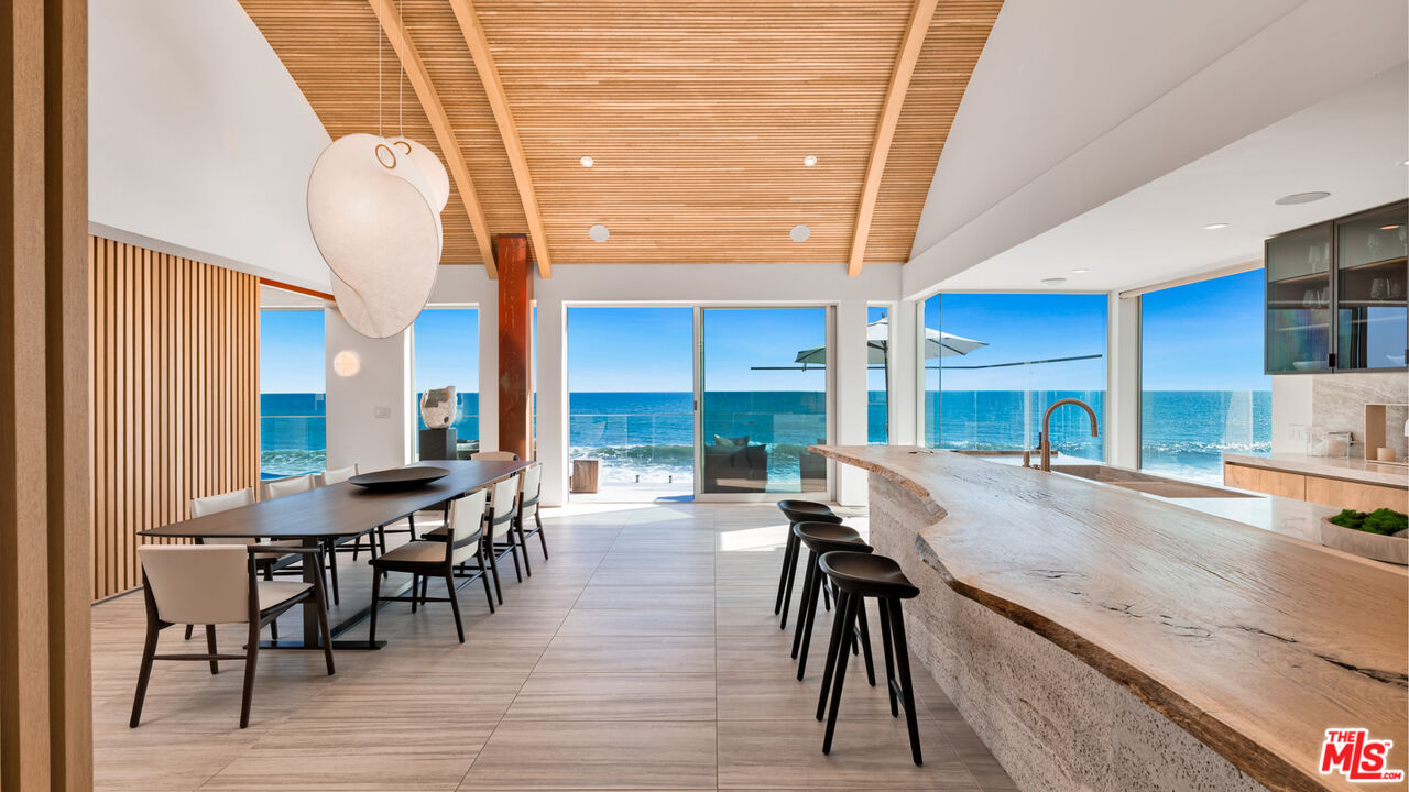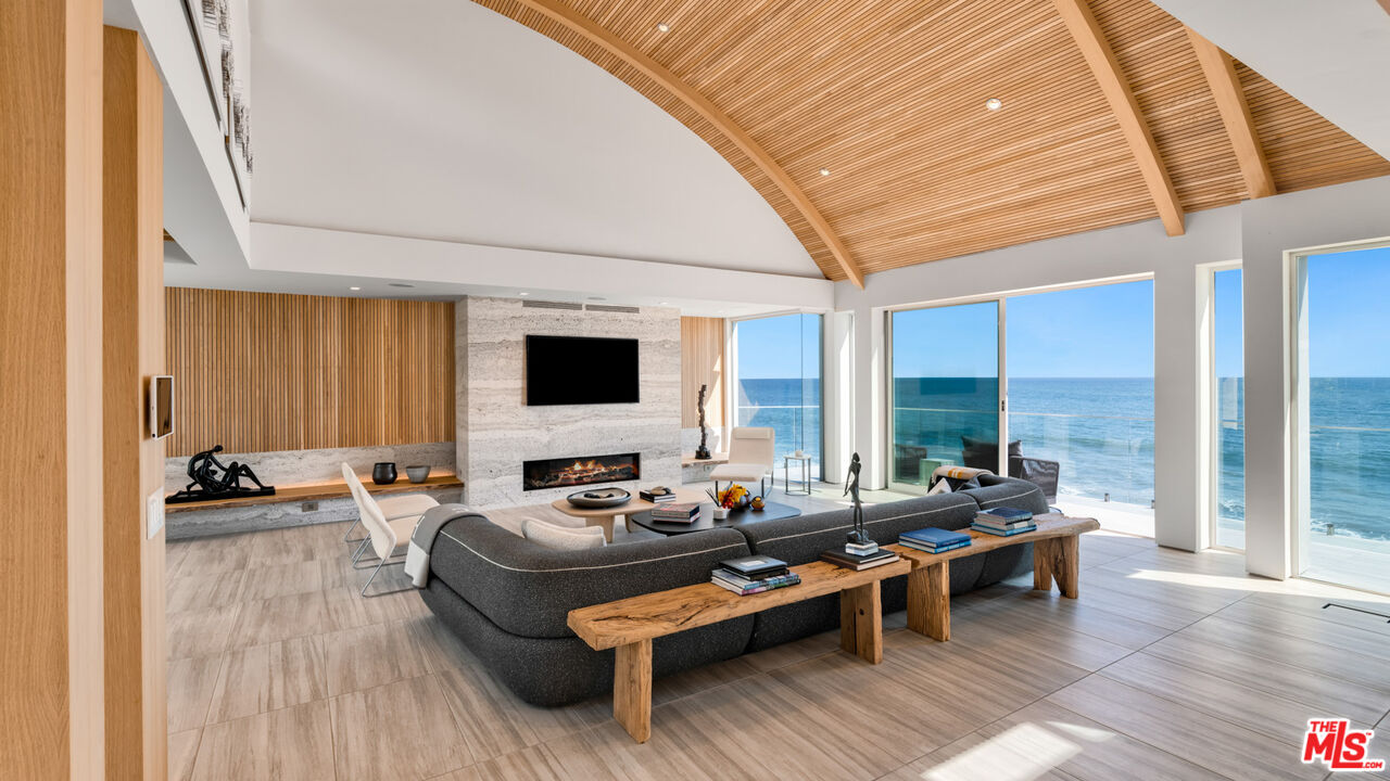 Both a private beachfront retreat and a majestic setting for grand entertaining, this elegant architectural estate is filled with natural light and sensational ocean, island, and coastline views. With approximately 81 feet of beach frontage on prestigious Malibu Road, the residence has been gorgeously updated for comfort, quality, and architectural integrity. Complete with pool, full-width balconies on two levels, walls of glass, and luxurious indoor-outdoor entertaining spaces, this is a year-round getaway convenient to Pepperdine University, beaches, trails, and all the attractions that Malibu has to offer. Gated and private, the home is built around a tranquil ocean-view courtyard, which has an expansive deck, a firepit lounge area, an outdoor kitchen and barbecue, and a waterfall swimming pool and spa. A door from the courtyard provides stairway access to the pristine beach below. The home's bold lines are emphasized by a long, ocean-view hallway with skylights overhead and up-lit glass insets in the floor. Along this hallway is a modernist wet bar with views of both the pool and the ocean, plus bar seating, a stone trough sink, and cabinets and counter space for spirits and storage. The end of the hall opens into two dramatic, oceanfront spaces with soaring barrel-vault ceilings, clerestory windows, and huge glass doors that open to the upper-level deck. On one side, the handsomely furnished living room has a linear fireplace, a built-in display bench, and glass doors opening to both the pool and the deck. On the other side, also opening to the deck, is the impressive kitchen/dining area. The kitchen is spacious both for food preparation and for entertaining. A large island with bar seating has a gorgeous live-edge countertop. Top-quality Miele appliances, generous storage and counter space, including lighted glass-front cabinets, and an over-sink picture window with views of Point Dume will please the most demanding chef or host. Adjoining the kitchen, with another barrel-vaulted ceiling, is the dining area with ample space for large gatherings that can extend easily to the deck just outside. Completing the home's main level is an ocean-view bedroom suite, a laundry room, and a powder room. On the lower level are three bedrooms, all opening to another beachfront deck. The primary suite is a private haven, with beautiful wood finishes, a platform bed, a sitting area separated by a double-sided fireplace, a wet bar, a walk-in closet with a magnificent burl bench, and a romantic spa-style bath with a sauna. In addition to the main deck, the primary suite opens to a pergola-shaded deck at the side of the house, where a hot tub, hammock, and lounge chairs offer a private, ocean-view oasis. A two-car garage, smart-home systems, and generous storage complete this sublime beachfront estate.Interested in this Listing?