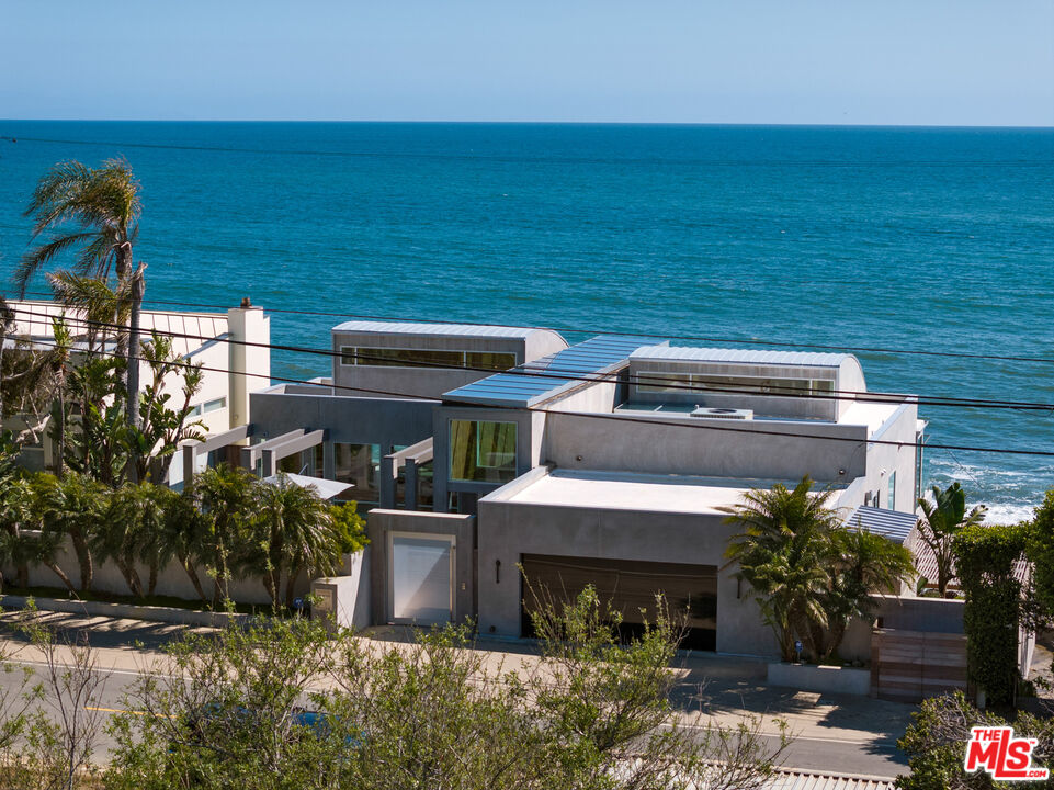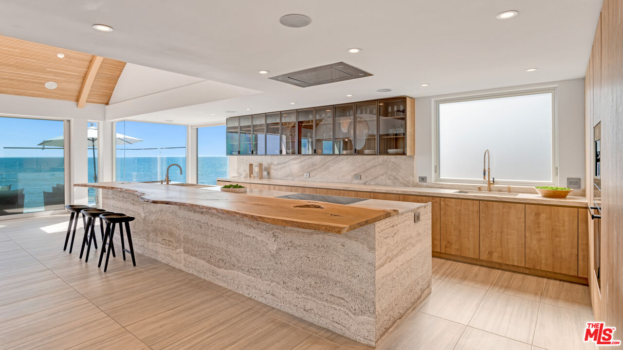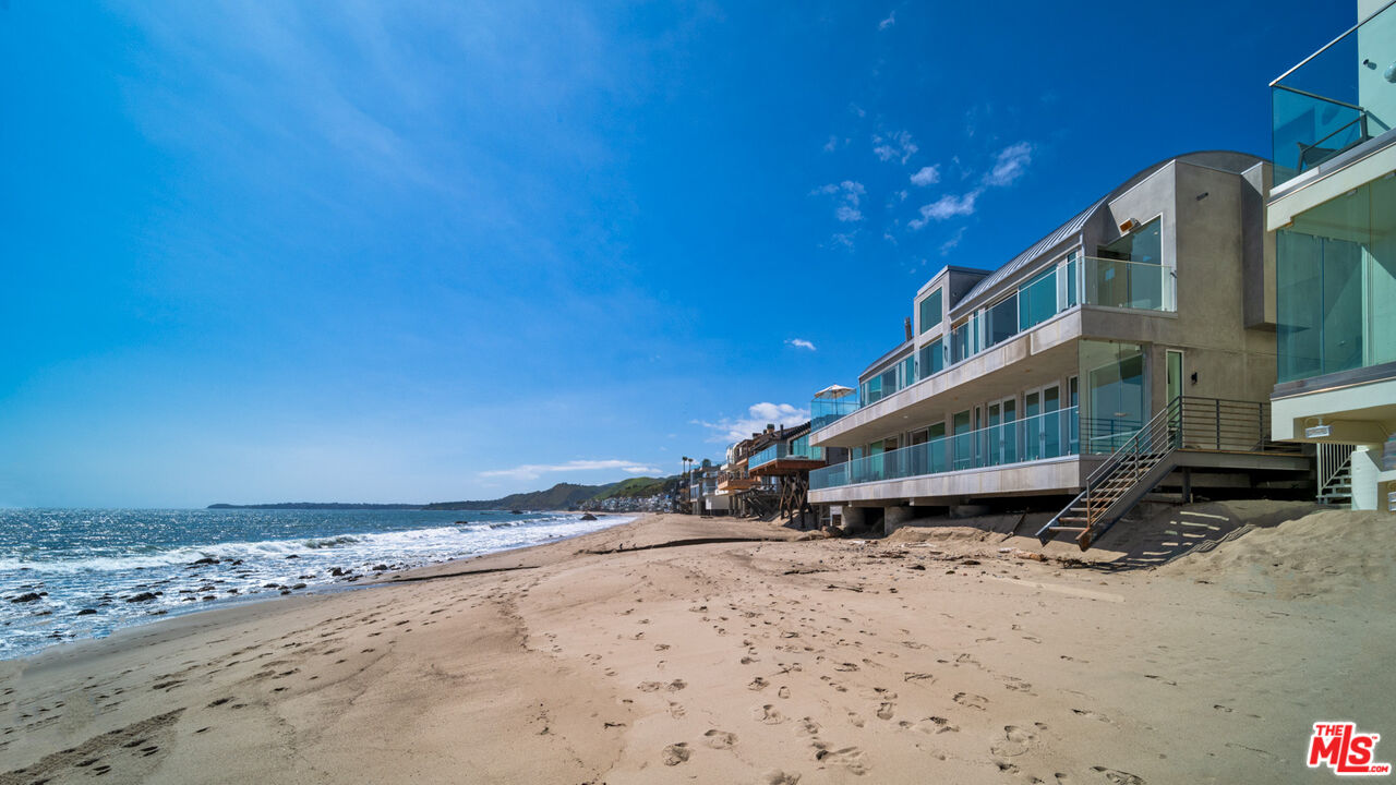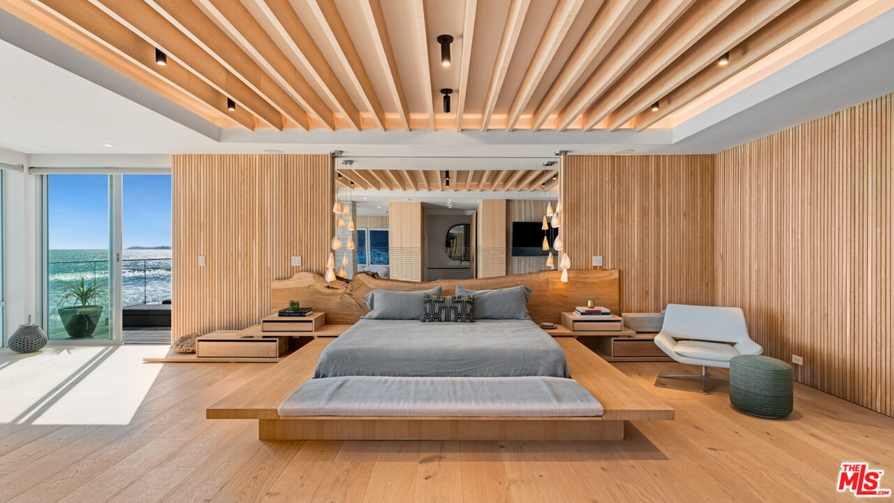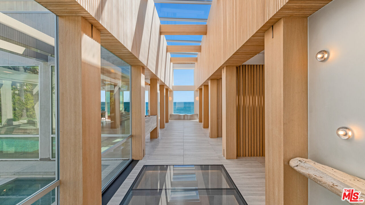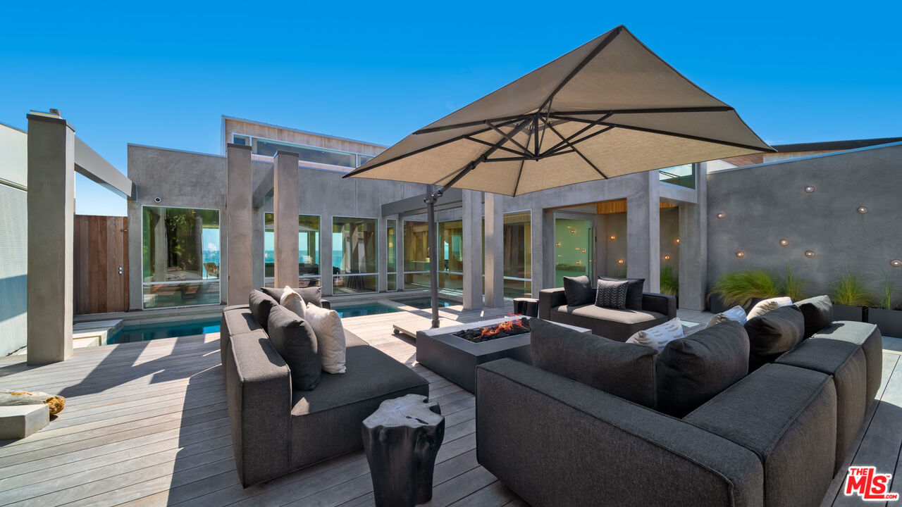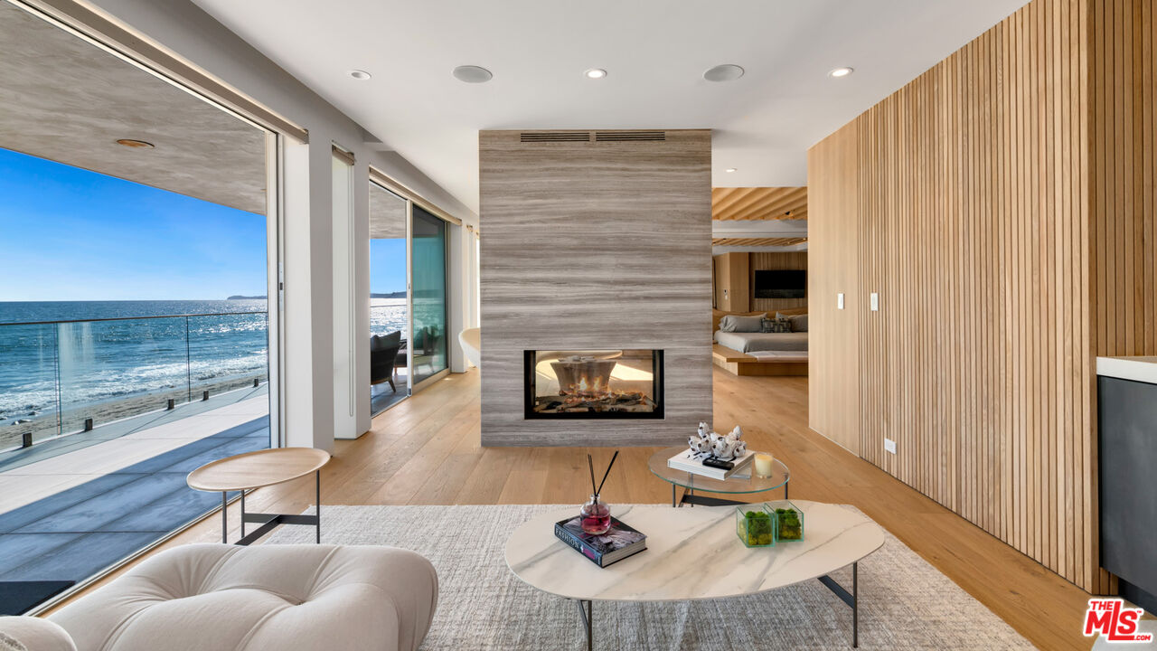 Both a private beachfront retreat and a majestic setting for grand entertaining, this elegant architectural estate is filled with natural light and sensational ocean, island, and coastline views. With approximately 81 feet of beach frontage on prestigious Malibu Road, the residence has been gorgeously updated for comfort, quality, and architectural integrity. Complete with pool, full-width balconies on two levels, walls of glass, and luxurious indoor-outdoor entertaining spaces, this is a year-round getaway convenient to Pepperdine University, beaches, trails, and all the attractions that Malibu has to offer. Gated and private, the home is built around a tranquil ocean-view courtyard, which has an expansive deck, a firepit lounge area, an outdoor kitchen and barbecue, and a waterfall swimming pool and spa. A door from the courtyard provides stairway access to the pristine beach below. The home's bold lines are emphasized by a long, ocean-view hallway with skylights overhead and up-lit glass insets in the floor. Along this hallway is a modernist wet bar with views of both the pool and the ocean, plus bar seating, a stone trough sink, and cabinets and counter space for spirits and storage. The end of the hall opens into two dramatic, oceanfront spaces with soaring barrel-vault ceilings, clerestory windows, and huge glass doors that open to the upper-level deck. On one side, the handsomely furnished living room has a linear fireplace, a built-in display bench, and glass doors opening to both the pool and the deck. On the other side, also opening to the deck, is the impressive kitchen/dining area. The kitchen is spacious both for food preparation and for entertaining. A large island with bar seating has a gorgeous live-edge countertop. Top-quality Miele appliances, generous storage and counter space, including lighted glass-front cabinets, and an over-sink picture window with views of Point Dume will please the most demanding chef or host. Adjoining the kitchen, with another barrel-vaulted ceiling, is the dining area with ample space for large gatherings that can extend easily to the deck just outside. Completing the home's main level is an ocean-view bedroom suite, a laundry room, and a powder room. On the lower level are three bedrooms, all opening to another beachfront deck. The primary suite is a private haven, with beautiful wood finishes, a platform bed, a sitting area separated by a double-sided fireplace, a wet bar, a walk-in closet with a magnificent burl bench, and a romantic spa-style bath with a sauna. In addition to the main deck, the primary suite opens to a pergola-shaded deck at the side of the house, where a hot tub, hammock, and lounge chairs offer a private, ocean-view oasis. A two-car garage, smart-home systems, and generous storage complete this sublime beachfront estate.Interested in this Listing?