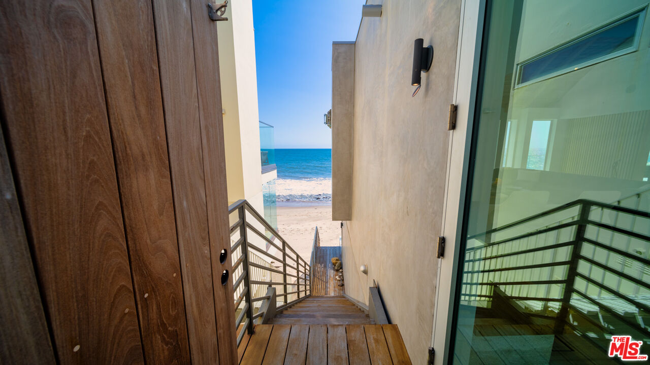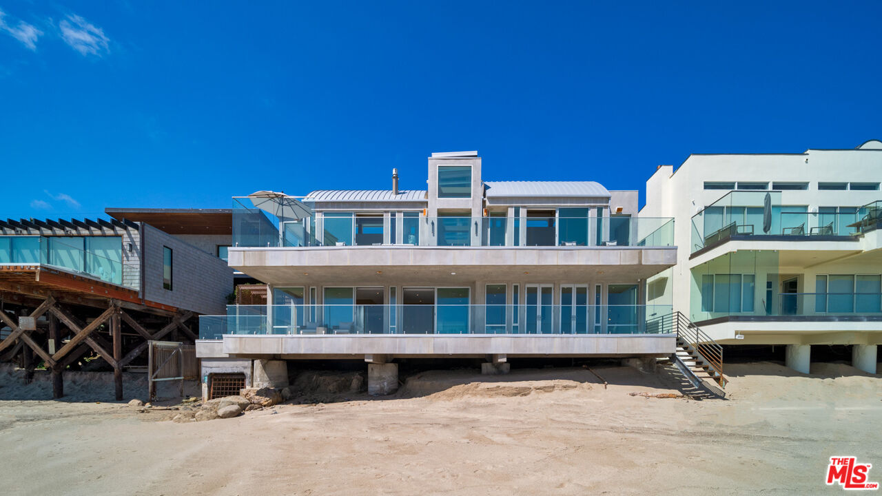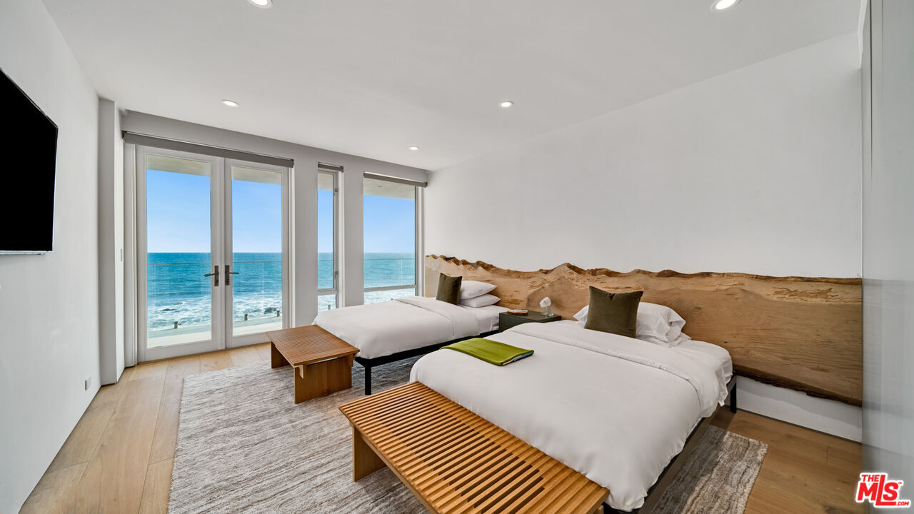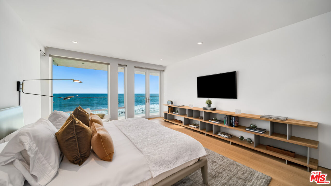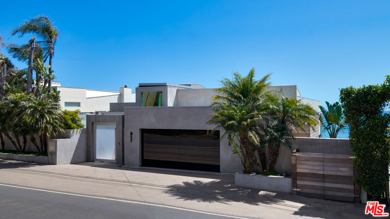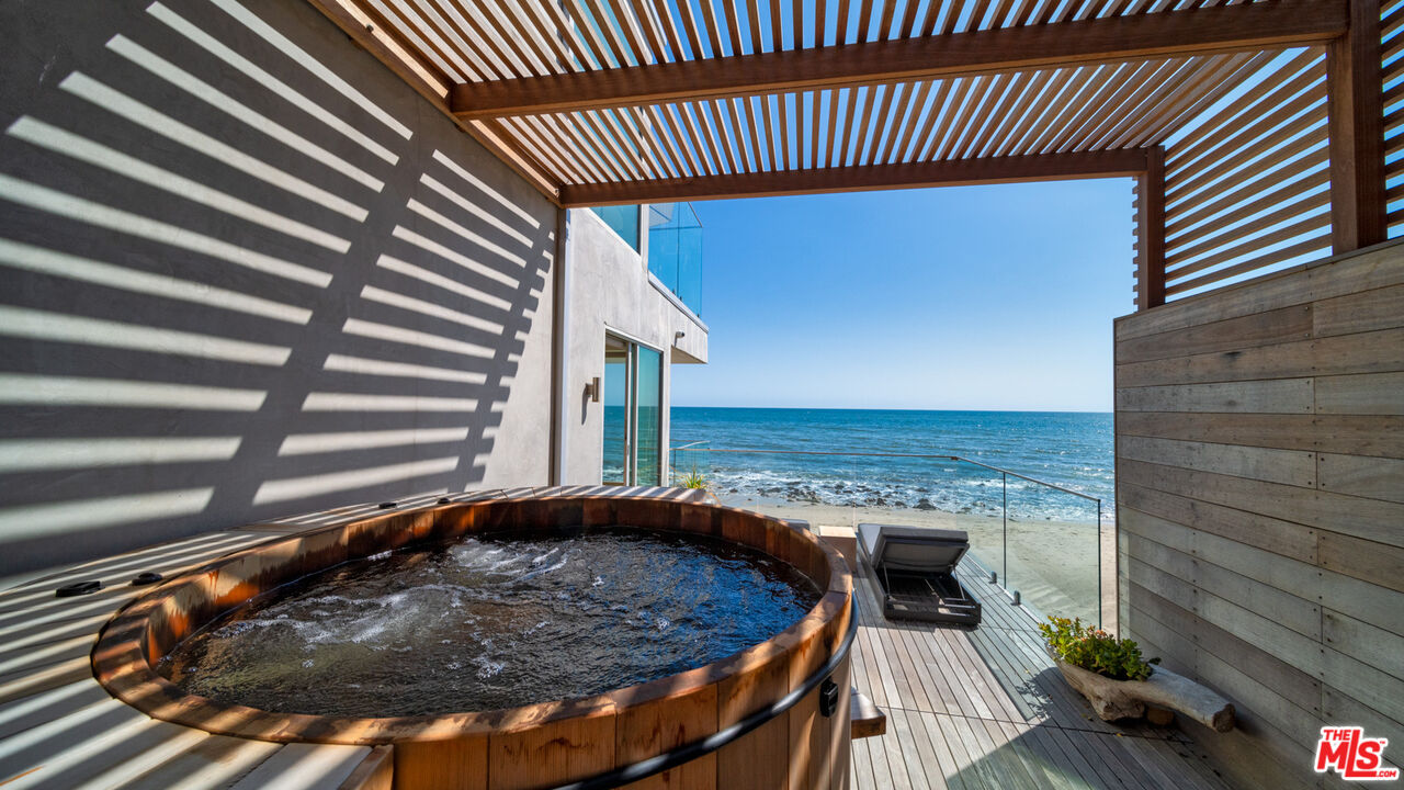 Both a private beachfront retreat and a majestic setting for grand entertaining, this elegant architectural estate is filled with natural light and sensational ocean, island, and coastline views. With approximately 81 feet of beach frontage on prestigious Malibu Road, the residence has been gorgeously updated for comfort, quality, and architectural integrity. Complete with pool, full-width balconies on two levels, walls of glass, and luxurious indoor-outdoor entertaining spaces, this is a year-round getaway convenient to Pepperdine University, beaches, trails, and all the attractions that Malibu has to offer. Gated and private, the home is built around a tranquil ocean-view courtyard, which has an expansive deck, a firepit lounge area, an outdoor kitchen and barbecue, and a waterfall swimming pool and spa. A door from the courtyard provides stairway access to the pristine beach below. The home's bold lines are emphasized by a long, ocean-view hallway with skylights overhead and up-lit glass insets in the floor. Along this hallway is a modernist wet bar with views of both the pool and the ocean, plus bar seating, a stone trough sink, and cabinets and counter space for spirits and storage. The end of the hall opens into two dramatic, oceanfront spaces with soaring barrel-vault ceilings, clerestory windows, and huge glass doors that open to the upper-level deck. On one side, the handsomely furnished living room has a linear fireplace, a built-in display bench, and glass doors opening to both the pool and the deck. On the other side, also opening to the deck, is the impressive kitchen/dining area. The kitchen is spacious both for food preparation and for entertaining. A large island with bar seating has a gorgeous live-edge countertop. Top-quality Miele appliances, generous storage and counter space, including lighted glass-front cabinets, and an over-sink picture window with views of Point Dume will please the most demanding chef or host. Adjoining the kitchen, with another barrel-vaulted ceiling, is the dining area with ample space for large gatherings that can extend easily to the deck just outside. Completing the home's main level is an ocean-view bedroom suite, a laundry room, and a powder room. On the lower level are three bedrooms, all opening to another beachfront deck. The primary suite is a private haven, with beautiful wood finishes, a platform bed, a sitting area separated by a double-sided fireplace, a wet bar, a walk-in closet with a magnificent burl bench, and a romantic spa-style bath with a sauna. In addition to the main deck, the primary suite opens to a pergola-shaded deck at the side of the house, where a hot tub, hammock, and lounge chairs offer a private, ocean-view oasis. A two-car garage, smart-home systems, and generous storage complete this sublime beachfront estate.Interested in this Listing?
