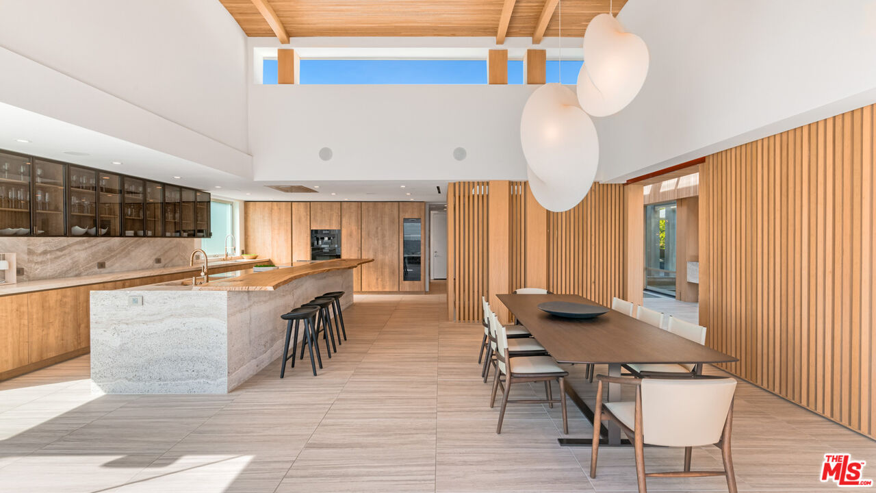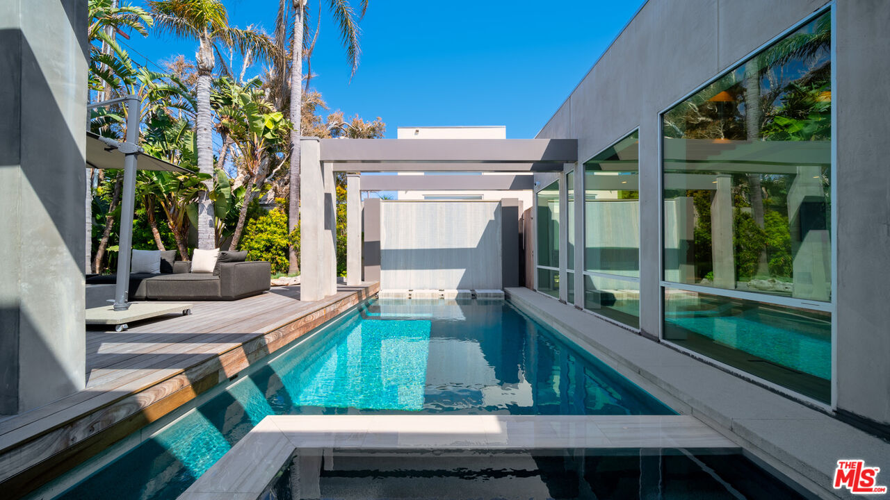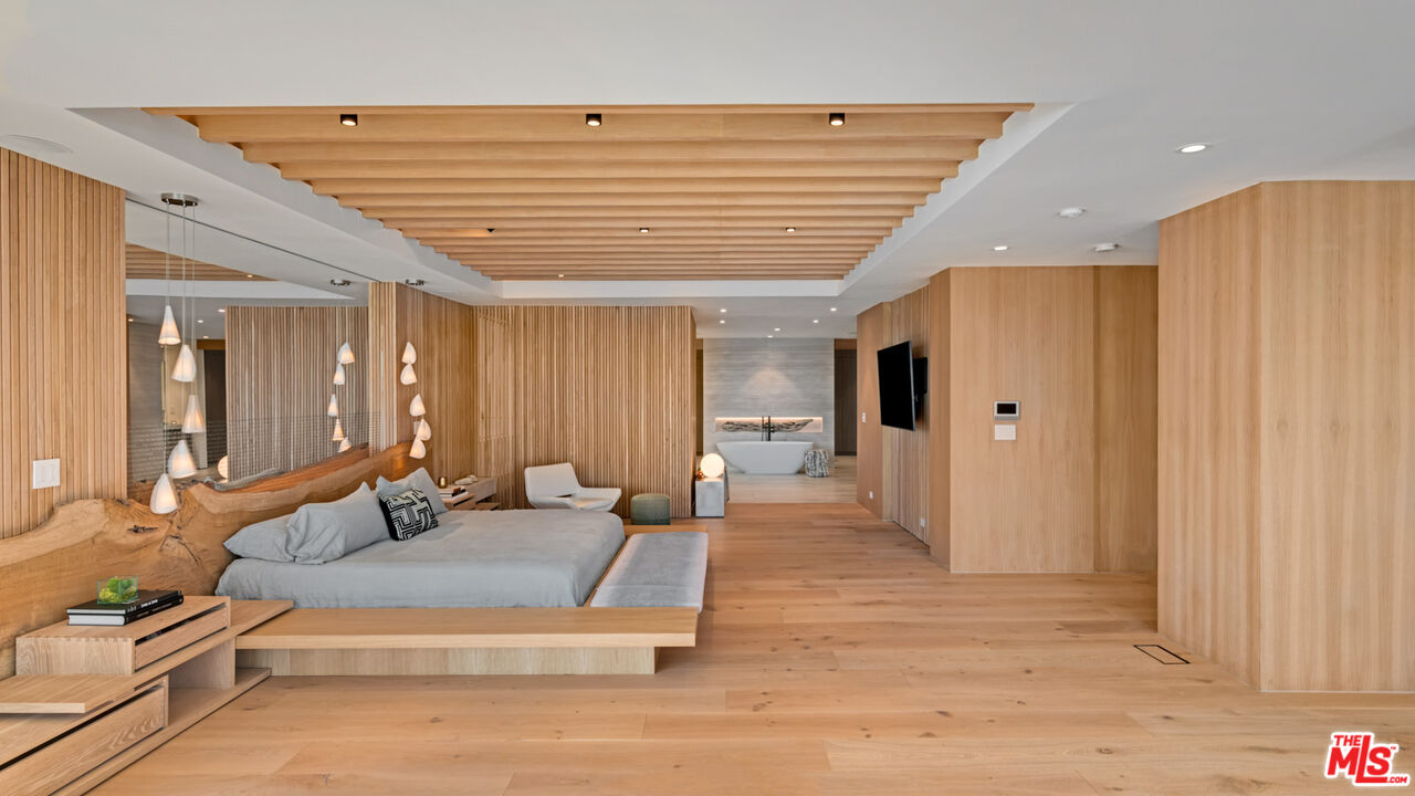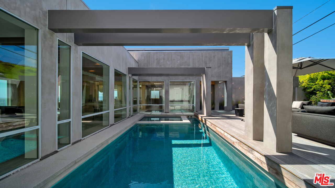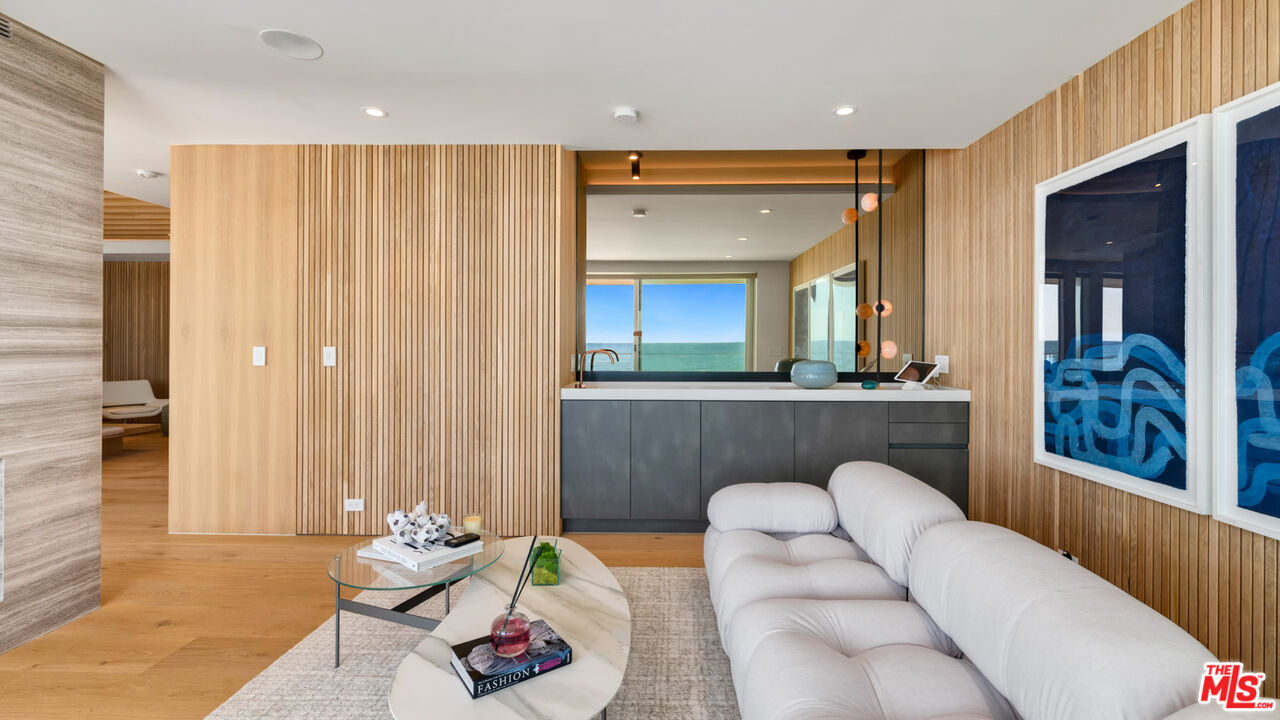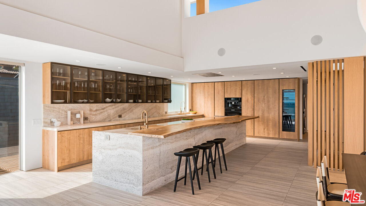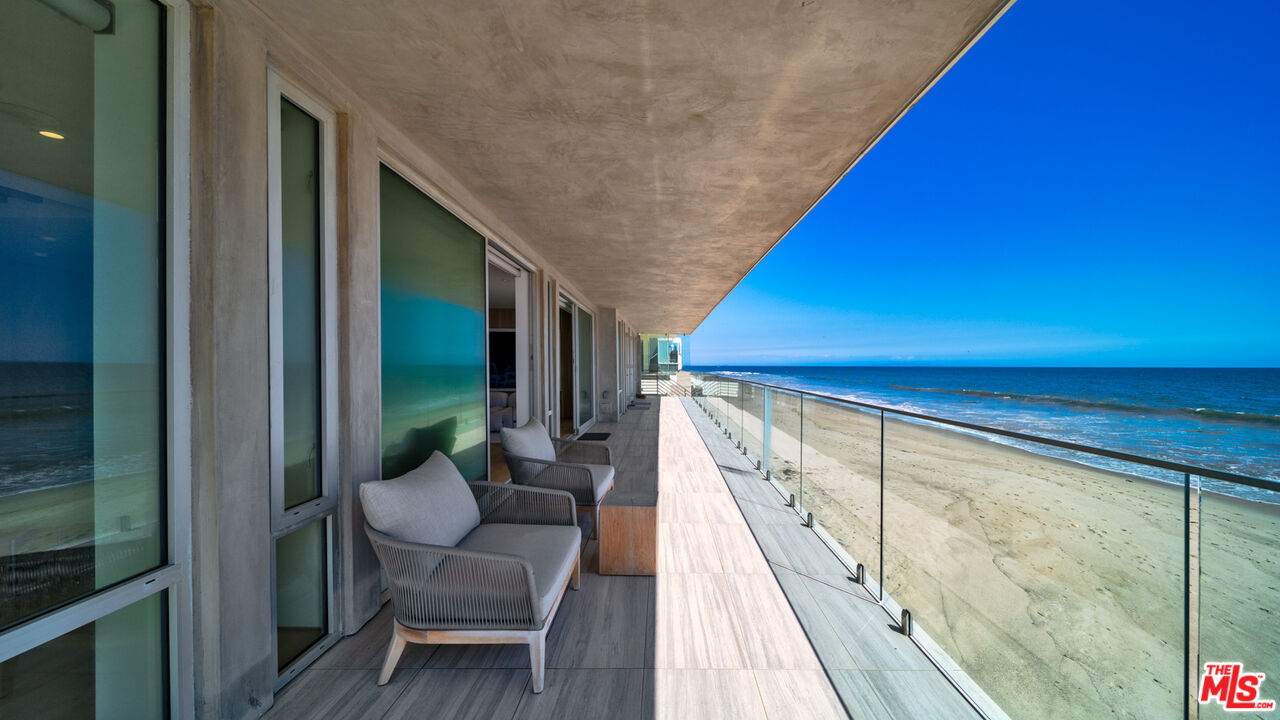 Both a private beachfront retreat and a majestic setting for grand entertaining, this elegant architectural estate is filled with natural light and sensational ocean, island, and coastline views. With approximately 81 feet of beach frontage on prestigious Malibu Road, the residence has been gorgeously updated for comfort, quality, and architectural integrity. Complete with pool, full-width balconies on two levels, walls of glass, and luxurious indoor-outdoor entertaining spaces, this is a year-round getaway convenient to Pepperdine University, beaches, trails, and all the attractions that Malibu has to offer. Gated and private, the home is built around a tranquil ocean-view courtyard, which has an expansive deck, a firepit lounge area, an outdoor kitchen and barbecue, and a waterfall swimming pool and spa. A door from the courtyard provides stairway access to the pristine beach below. The home's bold lines are emphasized by a long, ocean-view hallway with skylights overhead and up-lit glass insets in the floor. Along this hallway is a modernist wet bar with views of both the pool and the ocean, plus bar seating, a stone trough sink, and cabinets and counter space for spirits and storage. The end of the hall opens into two dramatic, oceanfront spaces with soaring barrel-vault ceilings, clerestory windows, and huge glass doors that open to the upper-level deck. On one side, the handsomely furnished living room has a linear fireplace, a built-in display bench, and glass doors opening to both the pool and the deck. On the other side, also opening to the deck, is the impressive kitchen/dining area. The kitchen is spacious both for food preparation and for entertaining. A large island with bar seating has a gorgeous live-edge countertop. Top-quality Miele appliances, generous storage and counter space, including lighted glass-front cabinets, and an over-sink picture window with views of Point Dume will please the most demanding chef or host. Adjoining the kitchen, with another barrel-vaulted ceiling, is the dining area with ample space for large gatherings that can extend easily to the deck just outside. Completing the home's main level is an ocean-view bedroom suite, a laundry room, and a powder room. On the lower level are three bedrooms, all opening to another beachfront deck. The primary suite is a private haven, with beautiful wood finishes, a platform bed, a sitting area separated by a double-sided fireplace, a wet bar, a walk-in closet with a magnificent burl bench, and a romantic spa-style bath with a sauna. In addition to the main deck, the primary suite opens to a pergola-shaded deck at the side of the house, where a hot tub, hammock, and lounge chairs offer a private, ocean-view oasis. A two-car garage, smart-home systems, and generous storage complete this sublime beachfront estate.Interested in this Listing?
