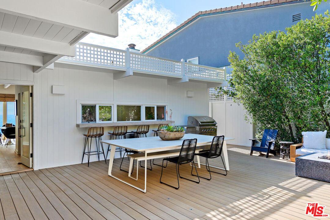 The perfect beach house, this spacious contemporary bungalow sits behind gates in ultra-desirable Malibu Cove Colony, where it commands sweeping ocean, coastline, and island views. The main living area is a peaceful oceanfront living/dining great room complete with plank and beam ceiling, brick fireplace, and a wall of glass opening to a beautifully furnished covered balcony above the sand with ample room for lounging, dining, and entertaining. The living room couch opens into a bed. The cook will enjoy the well-appointed kitchen, with ocean views, a pass-through to the dining area and breakfast/lunch bar, skylights, sleek navy cabinetry with lights above and below, marble countertops, and high-quality appliances, including Wolf double oven with convection, gas range with griddle and cooktop, and microwave drawer. Windows above the stove and counter open onto the front courtyard entertaining center. Just beyond the kitchen is a storage room/pantry with built-in cabinets. The home has two bedrooms, including a luminous ocean-view master that opens to the beachside balcony. This bedroom has generous closet space and a ceiling fan. The private, gated front courtyard is perfect for parties, with lovely plantings, an outdoor living area, dining area, bar seating, fire pit, barbecue/smoker/rotisserie, concealed TV, and a pass-through window to the kitchen. Steps from the front deck area provide beach access, with an outdoor shower at the top. A large two-car garage has wood floors, refrigerator drawers, built-in cabinets, and a washer and dryer. Additional features include an ADT touch-screen system, Nest AC, Sonos sound, front-door camera, backup generator, and a linen closet. Parking in the garage, private driveway, and in a recess opposite the house. This beautifully maintained home offers serene and private California beach living. Rate listed if for the long term. Call for the short-term rate (three months minimum).Interested in this Listing?