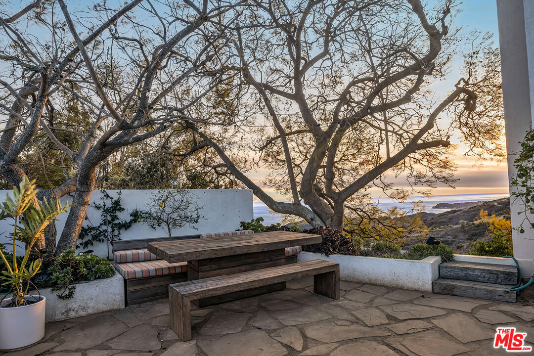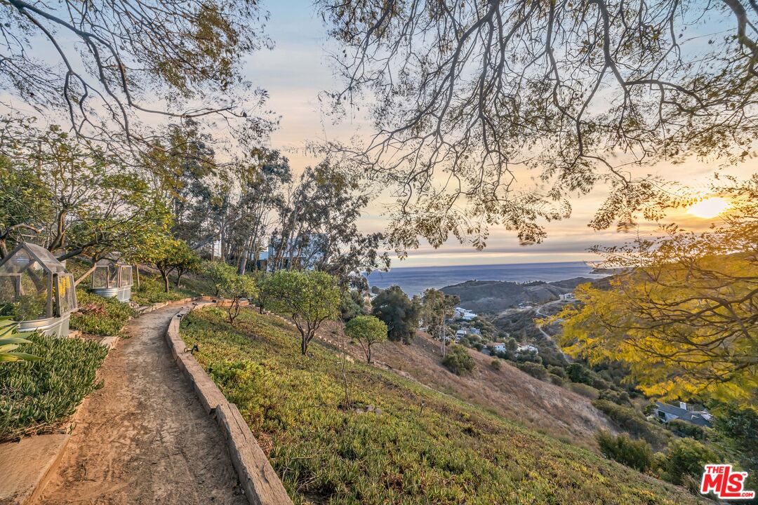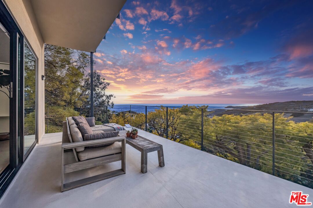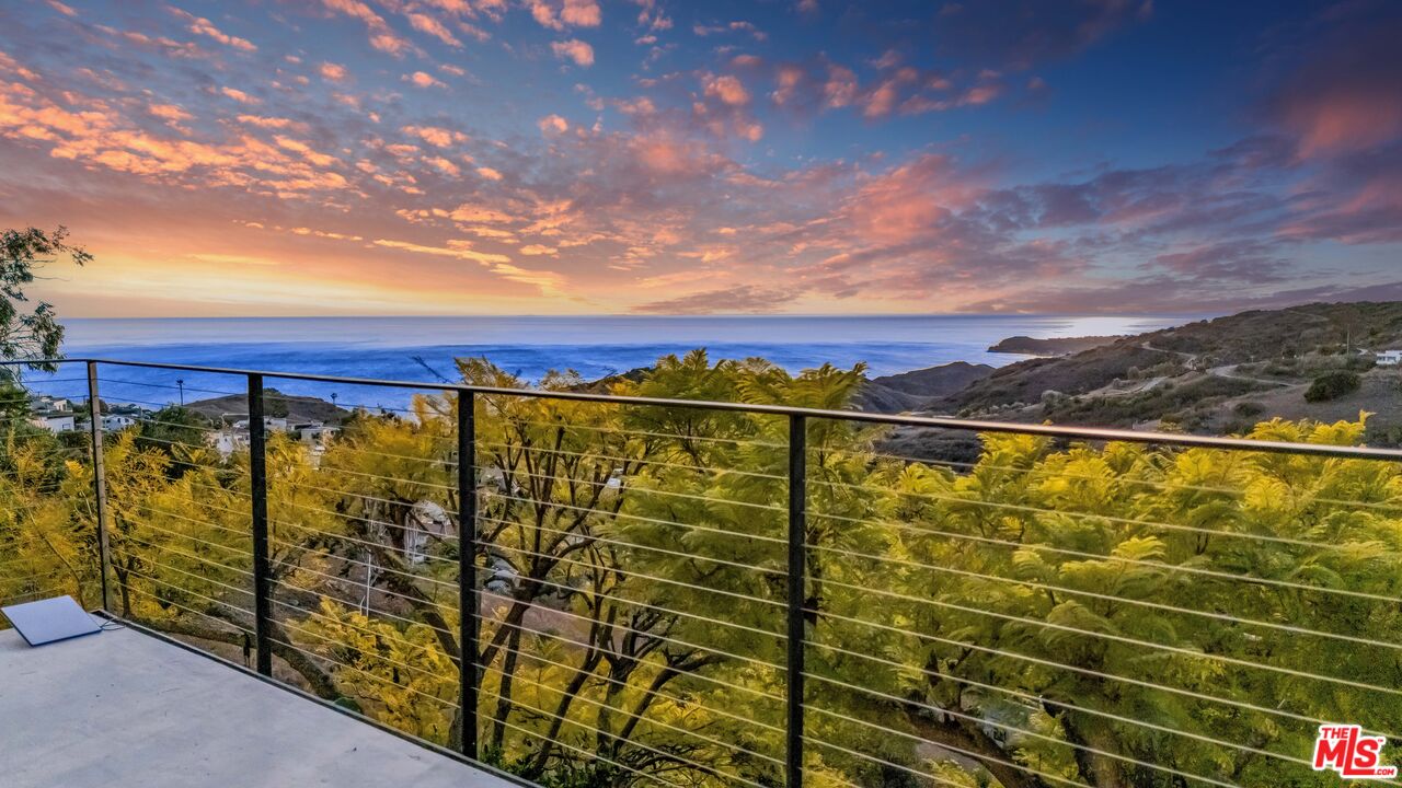 This 5+ acre Malibu estate offers dramatic, panoramic ocean views capturing both sunrises over Queen's Necklace to the east and magical sunsets over Pt. Dume to the west. Situated in a serene canyon setting, this property features an open floor plan with high ceilings and large windows designed to capture the abundance of natural light and expansive vistas. The main entry opens to the living room with a wood burning fireplace and is flanked by Fleetwood pocket doors that open to an outdoor space where one can entertain guests and enjoy the garden scenery. The spacious kitchen has a center island that connects to the large dining room with a half bath nearby. Upstairs are three bedrooms each boasting incredible ocean and mountain views. The generous primary suite features a private balcony, fireplace, oversized closet and comfortable bathroom. The other two bedrooms open to a shared terrace also with gorgeous ocean and mountain views. In addition, there is a one bedroom guesthouse with full kitchen and laundry on the lower level with its own private entrance. Hiking trails are out the front door and there are a variety of mature fruit and citrus trees strategically placed around the property, as well as a lemon grove. Lastly, there is solar and a water filtration system. Also for sale at $3,650,000.Interested in this Listing?