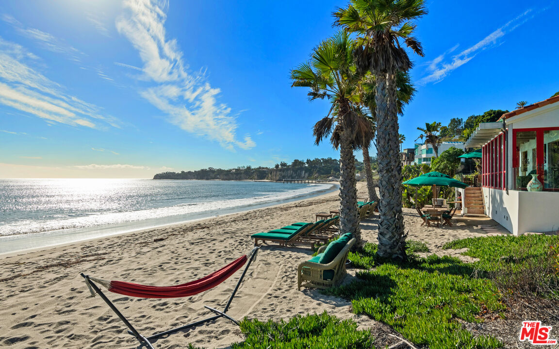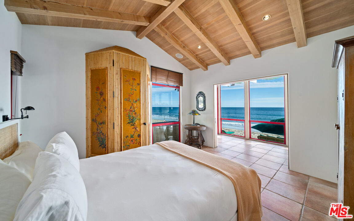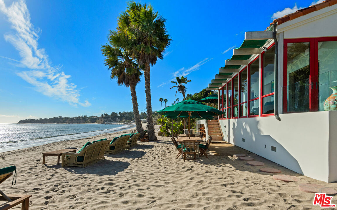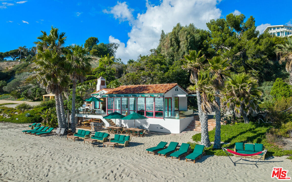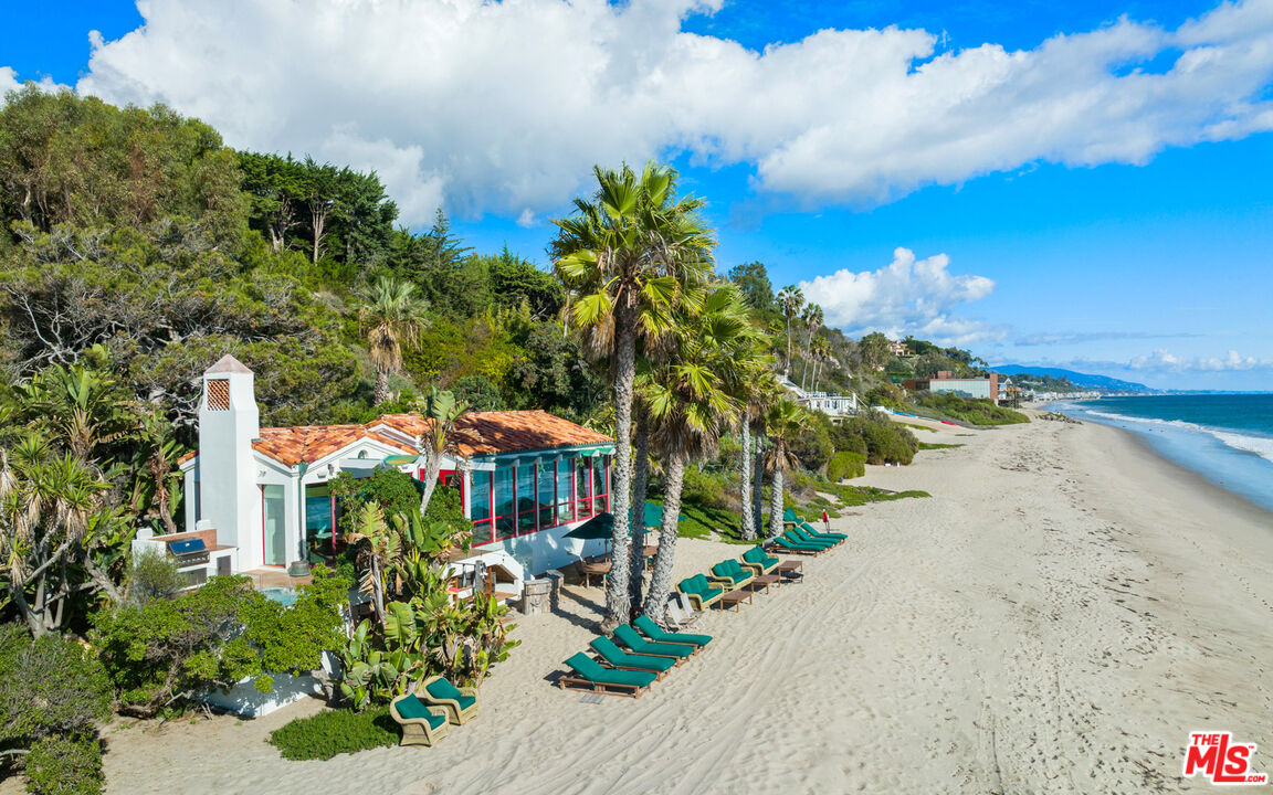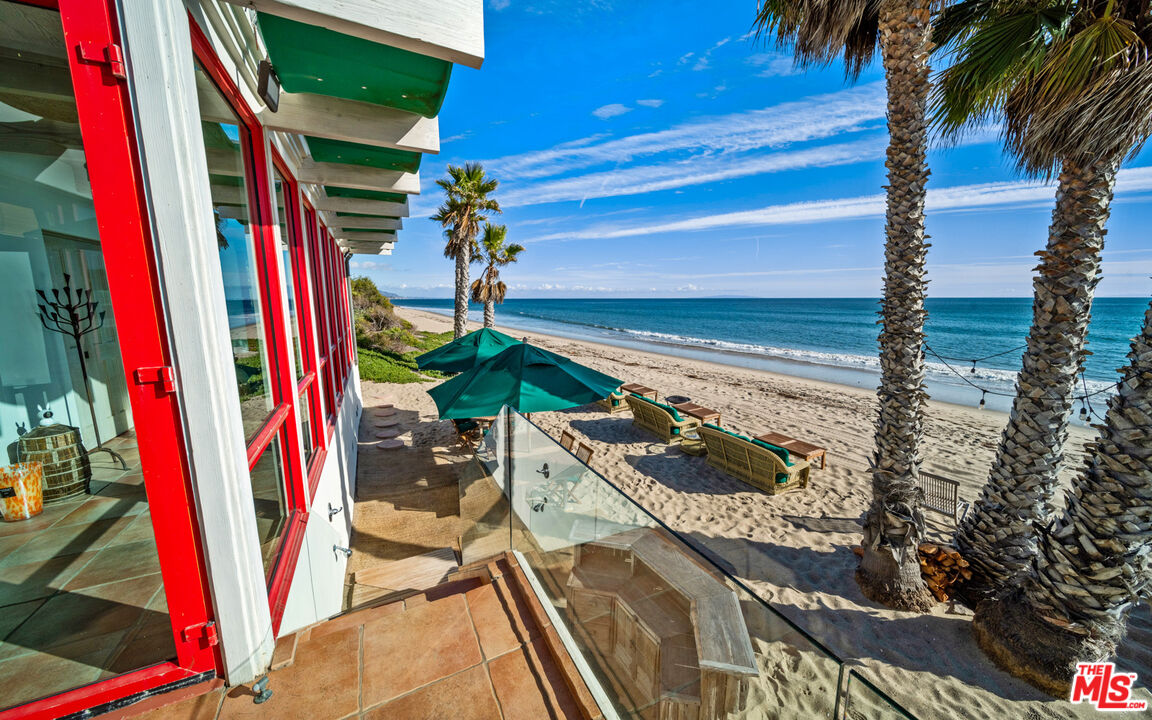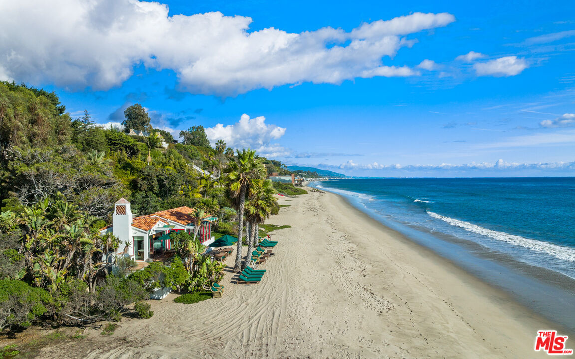 Set behind gates at the end of a long, private street, this romantic beachfront Spanish-style bungalow is perfectly situated for the enjoyment of expansive views of the ocean, islands, and coastline along with gorgeous sunsets and the ever-changing sky. Highlights include high beamed ceilings, walls of glass, tiled floors, a long oceanfront loggia for lounging and entertaining, and a resort-style, palm-fringed area for relaxing, dining, and entertaining on the sand. The living room, with a fireplace, built-in cabinets, and wraparound windows, has an al fresco dining porch just outside. A wide archway opens to the adjacent ocean-view kitchen, complete with granite countertops, pantry cabinets, and top-quality appliances. The home's charming bedroom has wide pocket doors that open onto the loggia and its amazing views. Off the living room, the tiled deck has a built-in barbecue, Jacuzzi, and steps down to the sand, where there is a small wood bar and deck area, a surfboard rack, and two outdoor showers. Equipped with air conditioning and security, this is the perfect private beach getaway, every day of the year. 27910 PCH (Main House) is also for lease. Both can be leased together for $60k/month.Interested in this Listing?