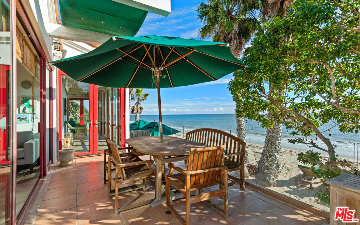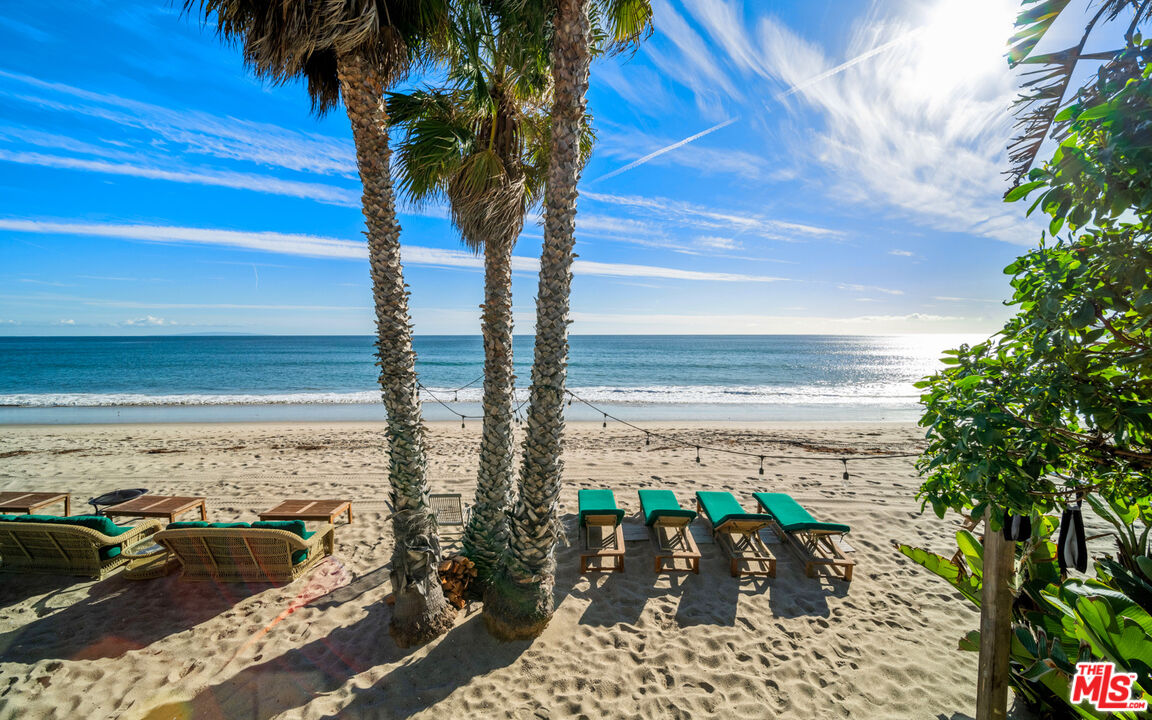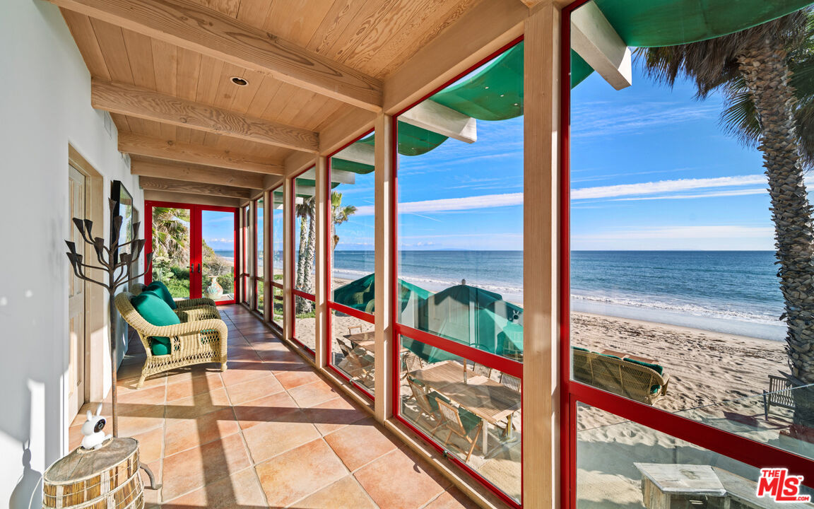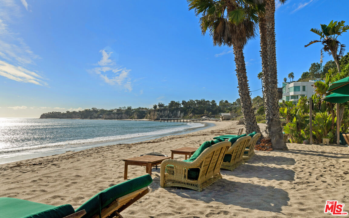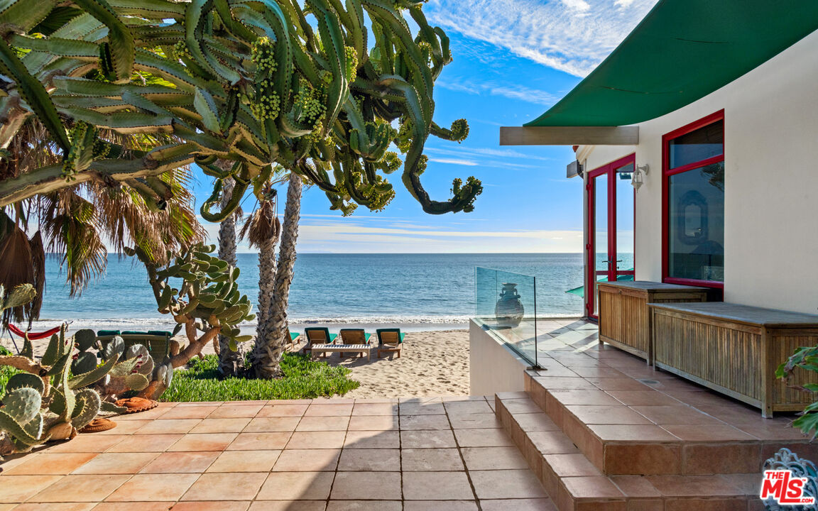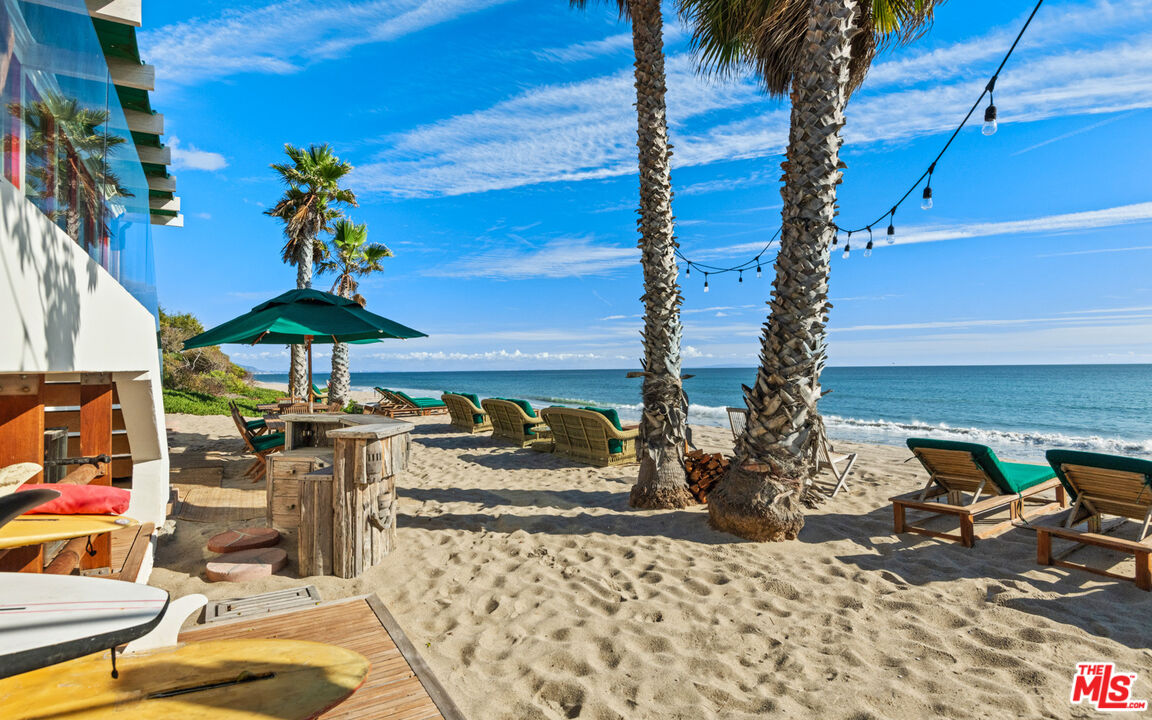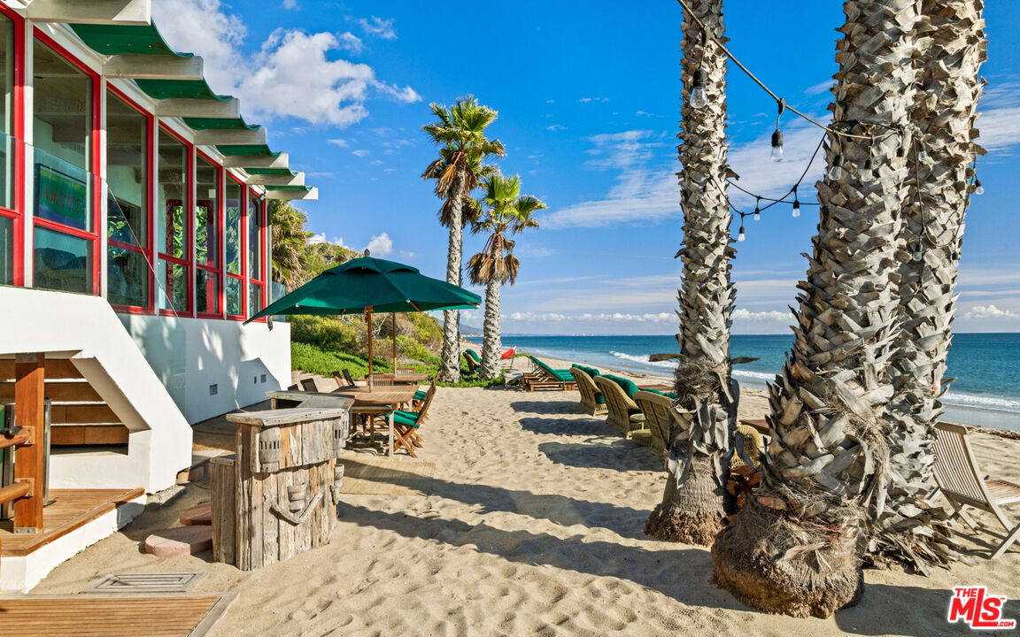 Set behind gates at the end of a long, private street, this romantic beachfront Spanish-style bungalow is perfectly situated for the enjoyment of expansive views of the ocean, islands, and coastline along with gorgeous sunsets and the ever-changing sky. Highlights include high beamed ceilings, walls of glass, tiled floors, a long oceanfront loggia for lounging and entertaining, and a resort-style, palm-fringed area for relaxing, dining, and entertaining on the sand. The living room, with a fireplace, built-in cabinets, and wraparound windows, has an al fresco dining porch just outside. A wide archway opens to the adjacent ocean-view kitchen, complete with granite countertops, pantry cabinets, and top-quality appliances. The home's charming bedroom has wide pocket doors that open onto the loggia and its amazing views. Off the living room, the tiled deck has a built-in barbecue, Jacuzzi, and steps down to the sand, where there is a small wood bar and deck area, a surfboard rack, and two outdoor showers. Equipped with air conditioning and security, this is the perfect private beach getaway, every day of the year. 27910 PCH (Main House) is also for lease. Both can be leased together for $60k/month.Interested in this Listing?