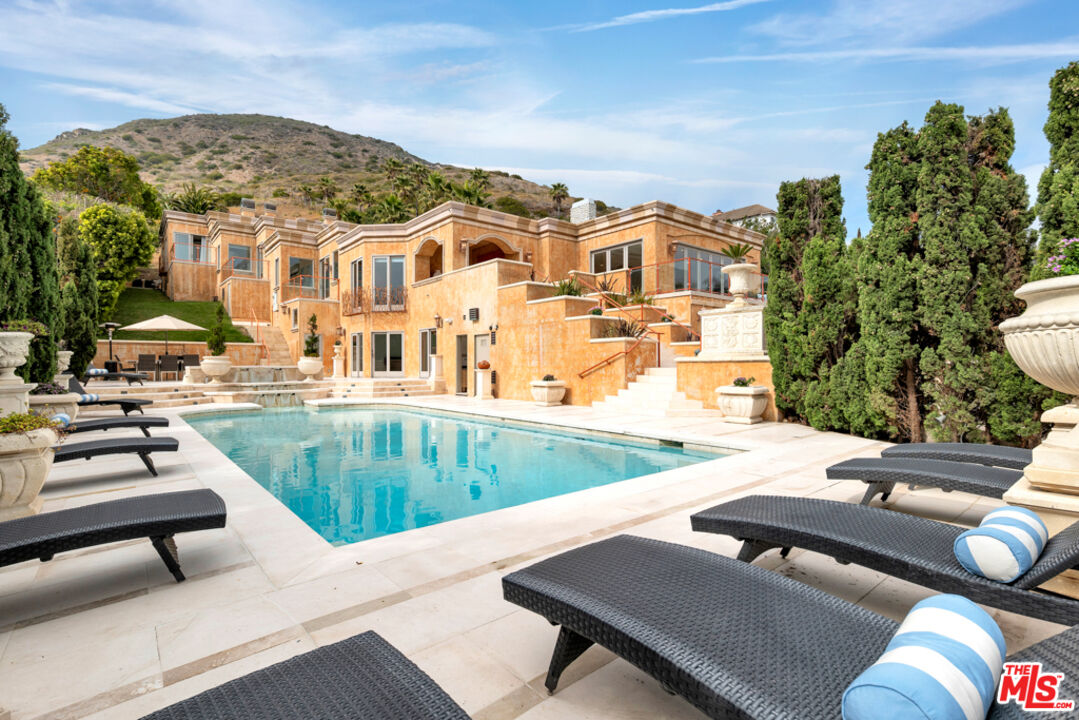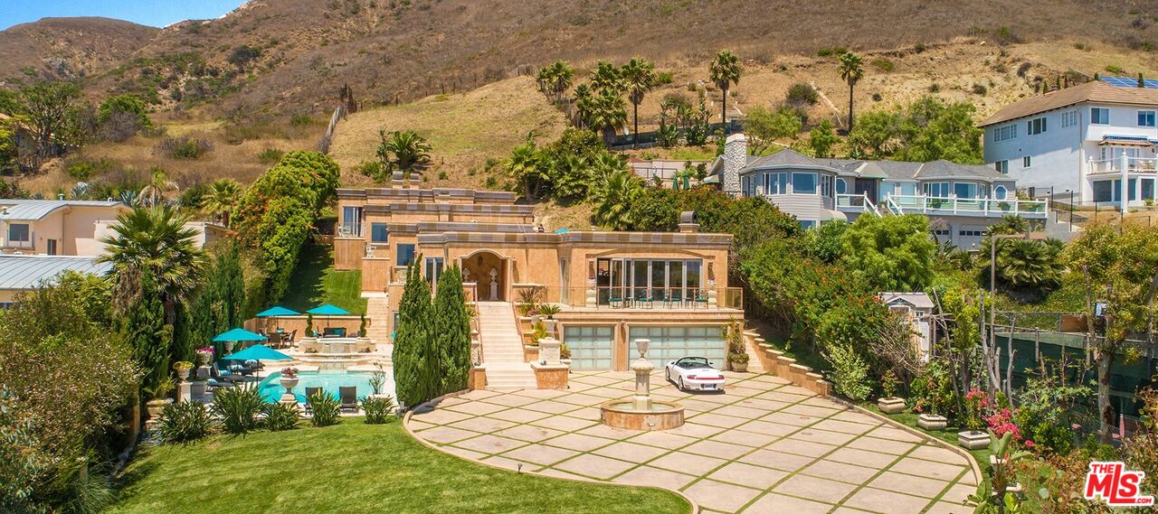 Villa Calcare is a lavishly built estate on a 3 acres of ocean view grounds boasting the finest hand carved Italian lime stones. It features grand open ocean view living space with 18 feet of folding and disappearing doors, gourmet kitchen with all Viking appliances, 2 family rooms, 4 ocean view suites, private ocean view balconies and 5 bathrooms with spa tub and steam room in each. A private large one bedroom guest suite with its own bathroom, spa tub & steam room connects to the main estate via and elevator. This villa also includes an indoor theatre, wine cellar, two bars, laundry room with washer & dryer and three car garage. Manicured landscaped grounds includes a limestone swimming pool with three tiered water falls, spa tub, sound system and intricate floral wrought iron fencing. This estate features the state of the art sound and security system and wrought iron European planter balconies. Landscaped circular driveway includes a hand carved limestone fountain in the center and a sport court at the side. Beach access is just across PCH, with deeded access for after sunset!Interested in this Listing?