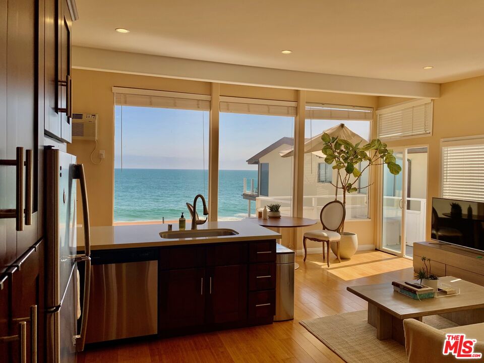 On Malibu Road Beach Side. Large One Bedroom / One bath, upstairs unit with White Water Ocean Views. Ocean views from deck, living room and kitchen. Recently updated kitchen and bathroom, Hardwood floors, large closet, covered garage parking for 1 car, plus one parking space behind garage. Laundry in unit. "Minimum one year lease". Ask about Pets. Bright and open unit with beautiful Malibu Beach views. Direct beach stair access. Available now. Call for Showing.