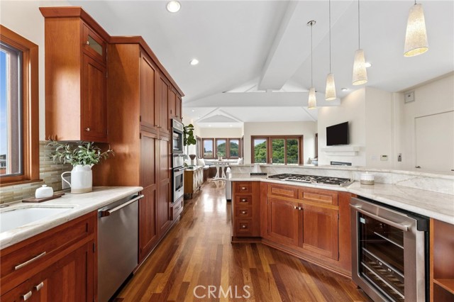 Welcome to 721 12th Street, an exquisite property with unbeatable walkability in the heart of Manhattan Beach. This home features an elevator, providing convenient access to all levels. The lower level, previously a separate studio, has been seamlessly connected to the main house. A La Cantina door spans the entire back side flooding the area with natural light. The addition of a wine closet, bar, and granite-topped kitchen, along with custom-built cabinetry, a queen-size wall bed, and built-in desk, maximizes the functionality of the space for various uses from entertaining to guest accommodations. This space is separate from the primary living area. Outside, the private backyard unfolds as an oasis showcasing a tranquil waterfall, stone gas fire pit, and turf lawn epitomizing indoor/outdoor living at its best. Ascending to the second floor you'll discover the primary retreat, a true haven of comfort and style. This suite has been thoughtfully designed, with a private balcony, fireplace, and a spacious walk-in closet adorned with cabinetry. The primary bath is spa-like, with a large tub and a spacious stand-in shower with pebble floor. You'll find two more bedrooms with Juliette railings and a full bath on this floor. Additionally the laundry room has been enhanced with granite countertops and cabinetry. On the upper level, the kitchen has been beautifully renovated with Taj Mahal quartzite counters. The addition of a new Sub-Zero fridge, wine fridge, along with a Thermador range and oven, elevate the cooking experience. A breakfast nook featuring a built-in bench and surrounding windows with ocean glimpses provides a cozy spot for morning meals or relaxed get-togethers. Adjacent, an ocean peek patio offers serene views. Additionally, a spacious outdoor patio accommodates al fresco dining for up to 6 guests. A walk-in pantry ensures generous storage for all your essentials. Also on this level is the office/5th bedroom thoughtfully designed with built-in bookshelves, cabinetry, and a desk, creating a productive and inspiring workspace. An oversized balcony provides a serene escape with breathtaking views of the backyard and mountains. This property is a rare treasure offering an unmatched fusion of elegance, functionality, and thoughtful design, complemented by its proximity to downtown, the beach, and local schools, making it an ideal location for enjoying the vibrant community.Interested in this Listing?