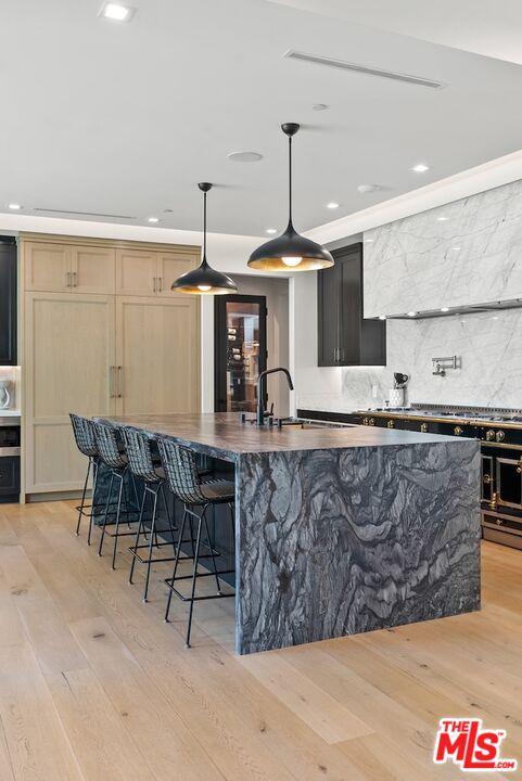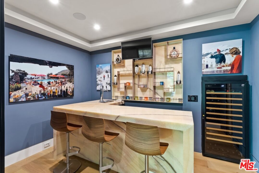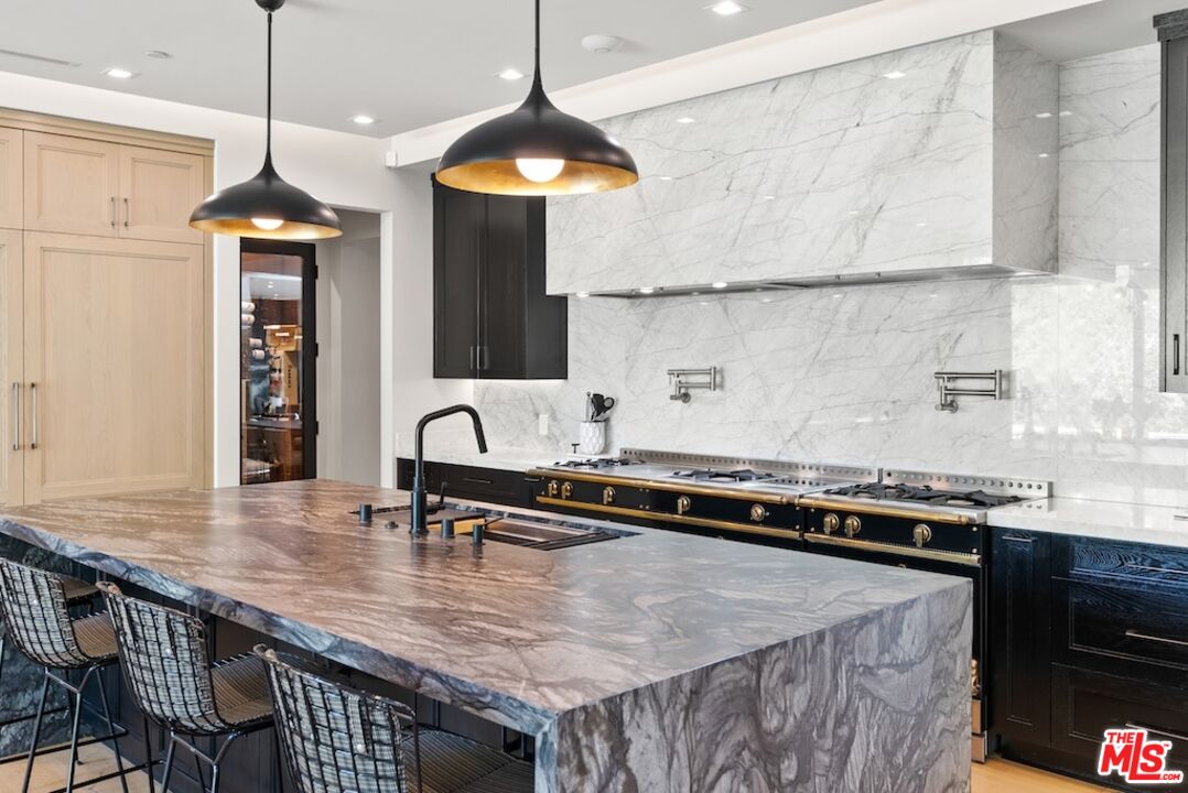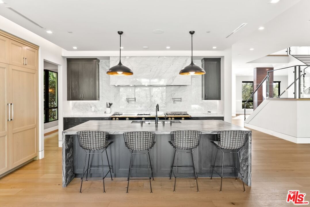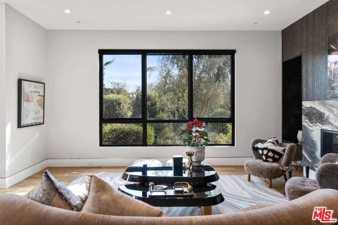 Tucked away in the prestigious Riviera neighborhood of Pacific Palisades, this stunning move-in ready modern home offers over 6,500 square feet of refined living space on a 15,000-square-foot lot. Set behind private gates and surrounded by mature landscaping, the property provides both seclusion and elegance. A grand circular driveway, lined with olive and fruit trees, sets the tone for the home's sophisticated design. Inside, the residence is thoughtfully designed with five bedrooms and seven bathrooms, blending natural materials with contemporary architecture. The kitchen is a chef's dream, centered around a custom Le Cornue range and oven, complemented by high-end appliances and sleek finishes. The open-concept living spaces flow effortlessly, enhanced by large dual-pane windows that bathe the interiors in natural light. A private elevator connects all levels, leading to a striking bar room with an Onyx countertop and a wine closet with temperature controls. A hidden door discreetly reveals a state-of-the-art home theater, complete with an 8K projector, surround sound system, and motion-sensing ambient lighting. The primary suite offers a spacious retreat with a sitting area, dual walk-in closets, and a spa-like bathroom finished in luxurious marble. Outside, the backyard is designed for both relaxation and entertaining, featuring a large pool and spa, a custom fire pit, and a lush lawn. A built-in Kalamazoo K750 Hybrid Fire grilling station with a double cooktop completes the outdoor experience, ideal for alfresco dining. Located just moments from The Riviera Country Club, Brentwood Country Mart, top-rated schools, and renowned dining, this home offers a rare opportunity to own a modern architectural gem in one of Los Angeles' most sought-after neighborhoods.Interested in this Listing?