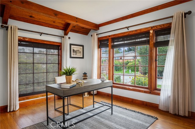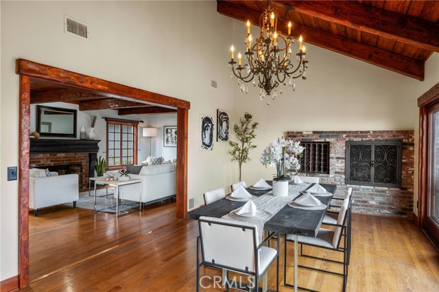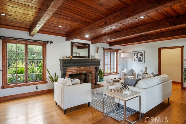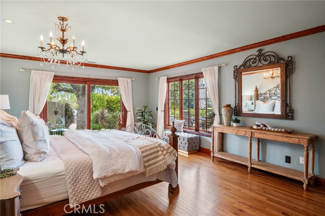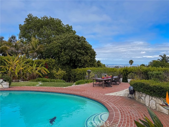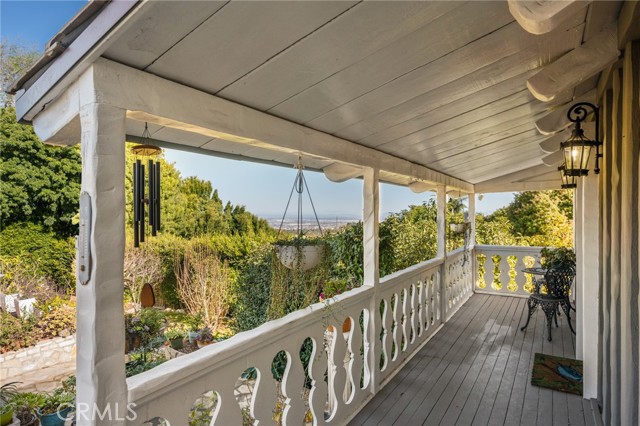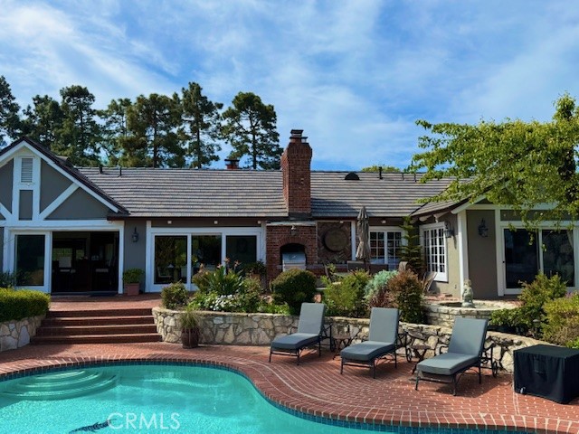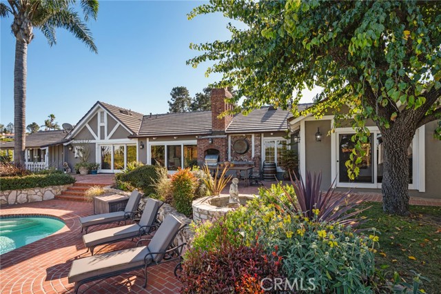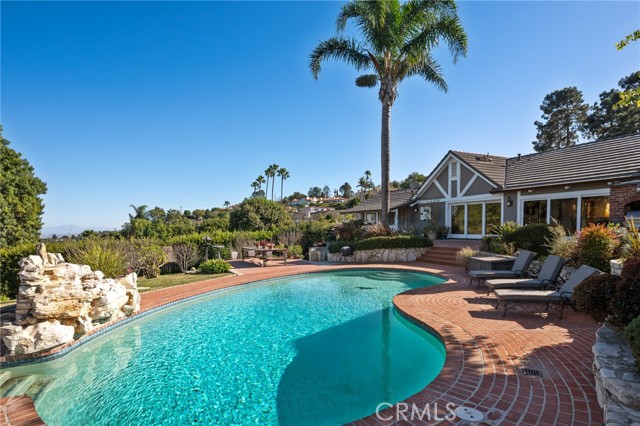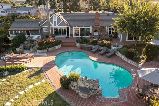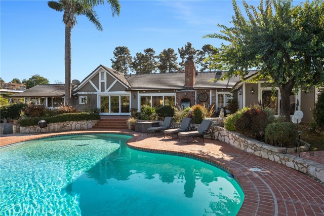 Step into the enchanting world of this storybook Tudor home, perfectly blending old-world charm with modern comforts. 5 bedrooms and 4.5 baths. Nestled on a serene, private cul-de-sac, this property spans over half an acre of lush landscaping and boasts captivating city views. The house has a brand new concrete tile roof. The heart of the home is the chef s kitchen, featuring Italian marble countertops, custom cabinetry, a built-in bread box, a pantry, counter seating, and high-end appliances including a brand-new refrigerator. The kitchen opens to a picturesque backyard with a sparkling pool, waterfall, and fountain and space for a spa. The dining room is a masterpiece, with vaulted wood ceilings, a cozy wood-burning fireplace, and ample space for a 12-person table, all framed by stunning backyard and sunset views. The elegant living room offers another exquisite fireplace. The main-level primary suite is a private retreat, complete with a spacious walk-in closet, city light views, and backyard access. The luxurious ensuite bathroom features a soaking tub under a statement chandelier, a walk-in shower, and a double vanity. This home offers four bedrooms, including the primary suite, on the main level. One bedroom features a fireplace and built-in cabinetry (could be an office), while another, located behind the kitchen, has a balcony with backyard access. A dedicated office/library off the entry with built-in shelving overlooks the front yard. On the lower level, a private casita with its own entrance and bathroom is ideal for guests. A new mahogany wood wine storage unit with a capacity for 450 bottles is located at the garage entrance. The garage provides both clean and functional space with laundry and wall storage. Additional highlights include a large attic, a two-car garage with access to a utility room, and a brick patio with a built-in BBQ, sink, and refrigerator perfect for entertaining. The property is adorned with a variety of fruit trees, including apple, avocado, banana, lemon, orange, fig, plum, and two types of pears. Whether you re enjoying the scenic views or relaxing by the pool, this home offers a peaceful sanctuary with timeless elegance.Interested in this Listing?