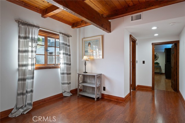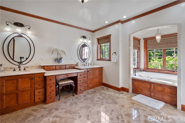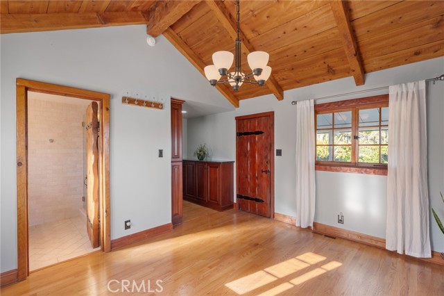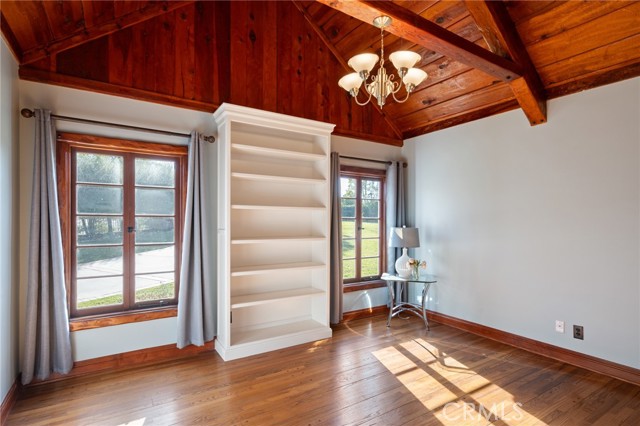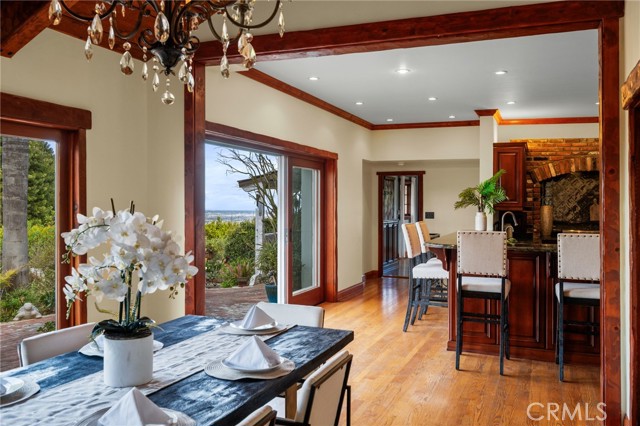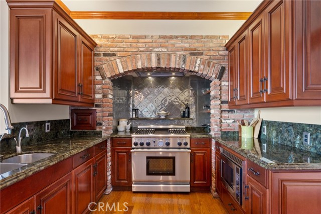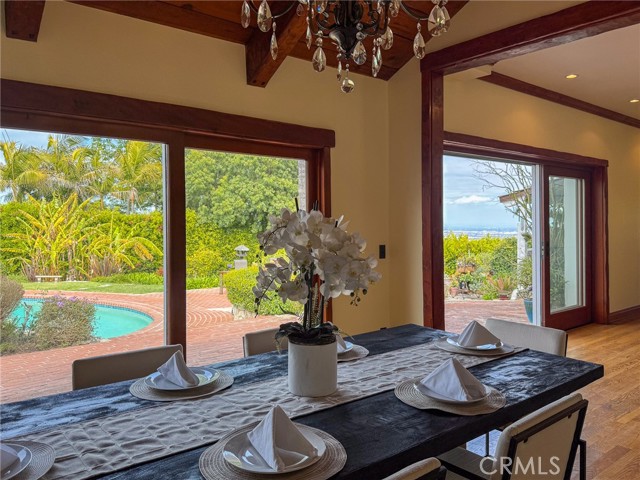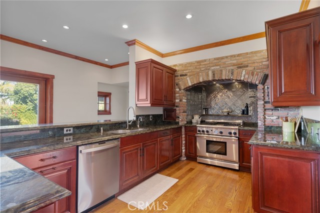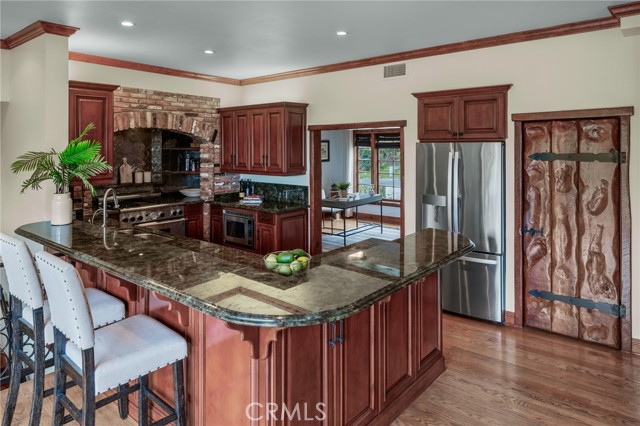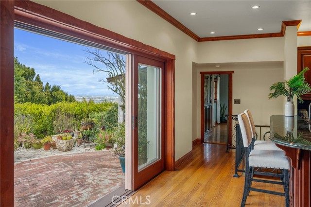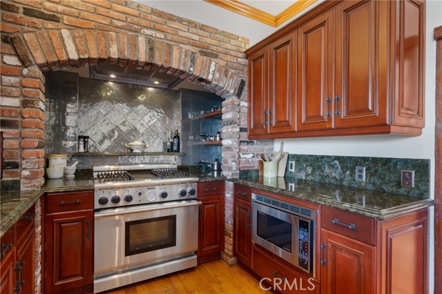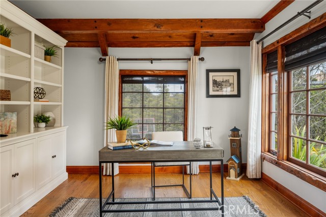 Step into the enchanting world of this storybook Tudor home, perfectly blending old-world charm with modern comforts. 5 bedrooms and 4.5 baths. Nestled on a serene, private cul-de-sac, this property spans over half an acre of lush landscaping and boasts captivating city views. The house has a brand new concrete tile roof. The heart of the home is the chef s kitchen, featuring Italian marble countertops, custom cabinetry, a built-in bread box, a pantry, counter seating, and high-end appliances including a brand-new refrigerator. The kitchen opens to a picturesque backyard with a sparkling pool, waterfall, and fountain and space for a spa. The dining room is a masterpiece, with vaulted wood ceilings, a cozy wood-burning fireplace, and ample space for a 12-person table, all framed by stunning backyard and sunset views. The elegant living room offers another exquisite fireplace. The main-level primary suite is a private retreat, complete with a spacious walk-in closet, city light views, and backyard access. The luxurious ensuite bathroom features a soaking tub under a statement chandelier, a walk-in shower, and a double vanity. This home offers four bedrooms, including the primary suite, on the main level. One bedroom features a fireplace and built-in cabinetry (could be an office), while another, located behind the kitchen, has a balcony with backyard access. A dedicated office/library off the entry with built-in shelving overlooks the front yard. On the lower level, a private casita with its own entrance and bathroom is ideal for guests. A new mahogany wood wine storage unit with a capacity for 450 bottles is located at the garage entrance. The garage provides both clean and functional space with laundry and wall storage. Additional highlights include a large attic, a two-car garage with access to a utility room, and a brick patio with a built-in BBQ, sink, and refrigerator perfect for entertaining. The property is adorned with a variety of fruit trees, including apple, avocado, banana, lemon, orange, fig, plum, and two types of pears. Whether you re enjoying the scenic views or relaxing by the pool, this home offers a peaceful sanctuary with timeless elegance.Interested in this Listing?
