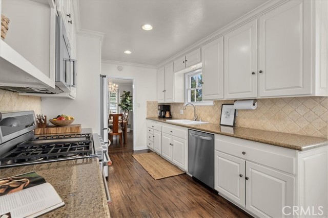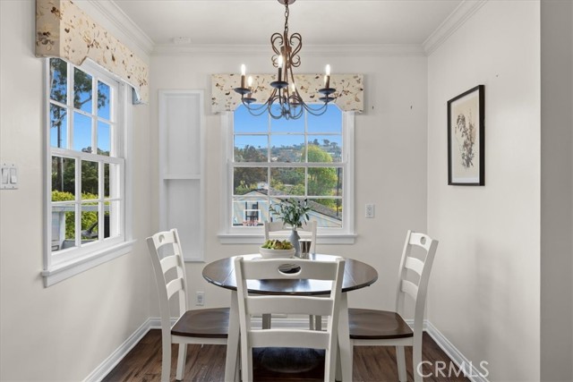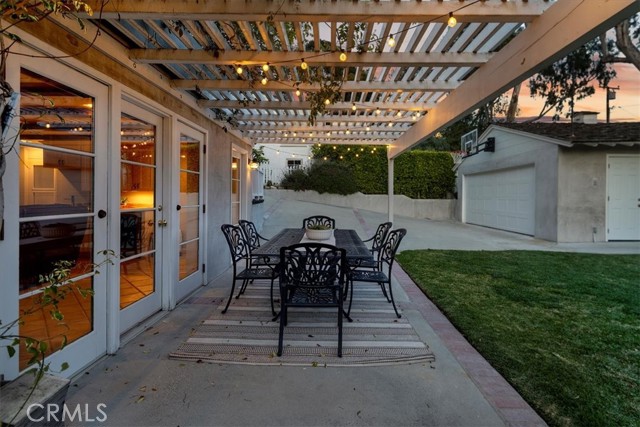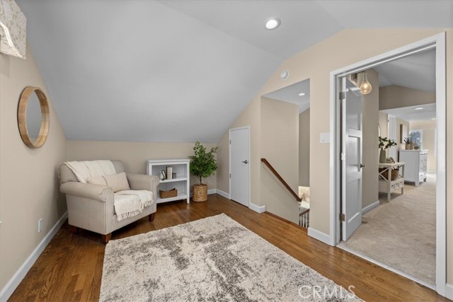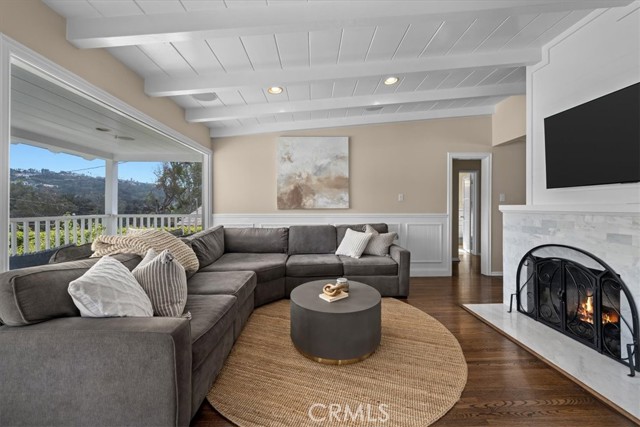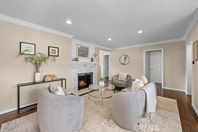 Welcome to this charming residence nestled behind a white picket fence in the heart of the sought-after Valmonte neighborhood of Palos Verdes Estates. Surrounded by a lush grassy front yard and blooming rose bushes, this home exudes warmth and curb appeal from the moment you arrive. Step inside to discover dark hardwood floors that flow through the main level, creating a rich and inviting atmosphere. The living room is anchored by a sophisticated fireplace with a marble surround, framed by classic moldings, recessed lighting, and custom shutters. Just beyond, a formal dining room with an elegant chandelier offers the perfect setting for hosting dinner parties and special occasions. The bright and well-appointed kitchen features crisp white cabinetry, granite countertops, and stainless-steel appliances. A cozy breakfast nook sits beside a large backyard window ideal for morning coffee or casual meals. Adjacent, the family room showcases beamed ceilings, refined millwork, and a second fireplace. Oversized picture windows frame treetop and hillside views and lead to a covered deck, providing seamless indoor-outdoor living. On the main level, two spacious and sun-filled bedrooms share a charming hall bathroom with a separate tub and shower, neutral white tile, and timeless finishes. Upstairs, a quaint office area with wood floors and pitched ceilings offers a peaceful retreat for work or study. The adjacent upstairs bedroom is generously sized, featuring plush carpet and its private bath with designer tile and stylish fixtures. The lower level expands the home s livability with a second family room perfect for movie nights or entertaining with built-in shelving, a sink, drink refrigerator, and wood-topped counter. An additional bedroom and bathroom complete this floor. Glass doors open to a large grassy backyard, and a rear gate offers direct access to a scenic walking trail. This thoughtfully designed home offers space, character, and a rare opportunity to live close to nature while enjoying the best of Valmonte living.Interested in this Listing?
