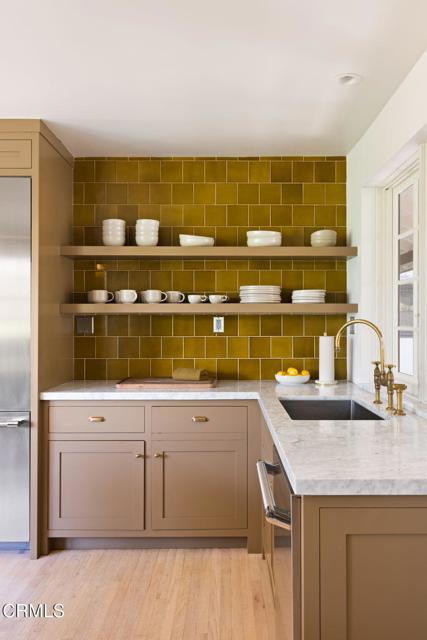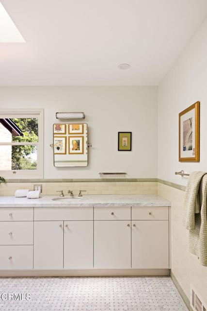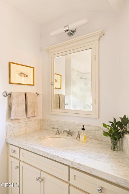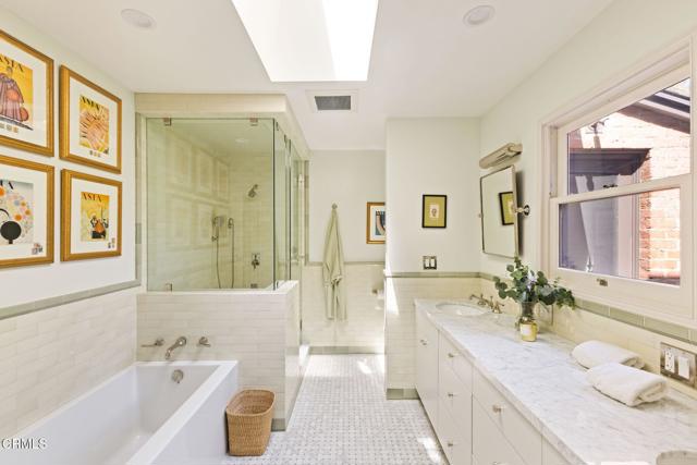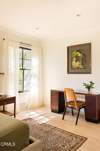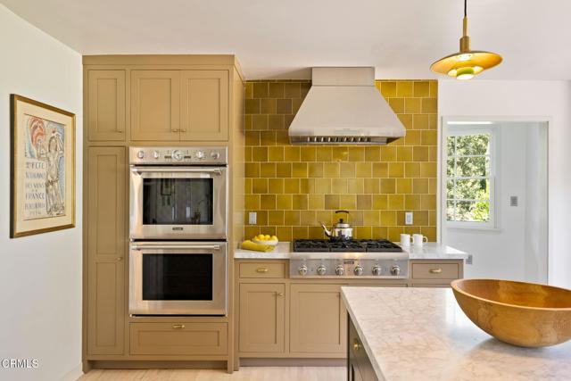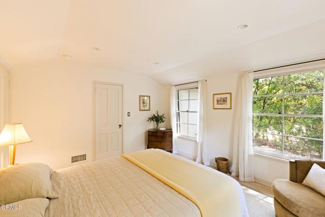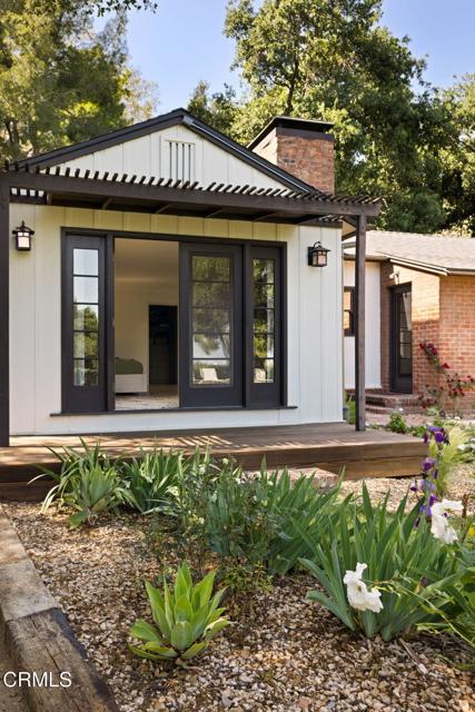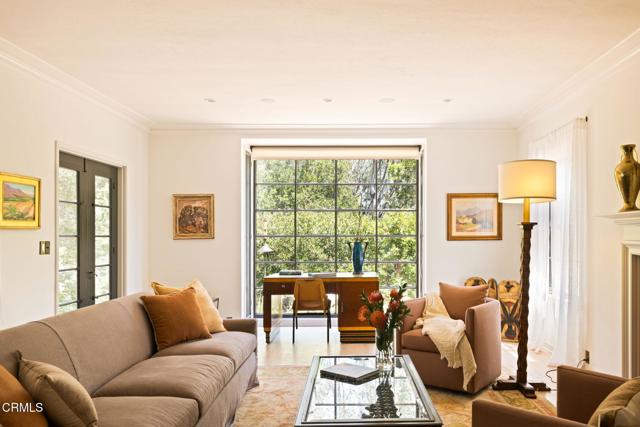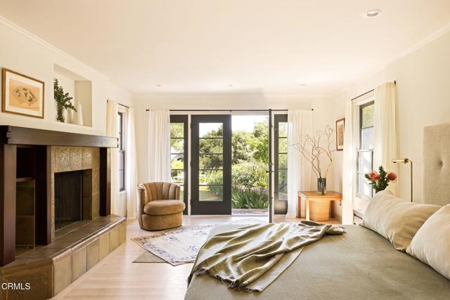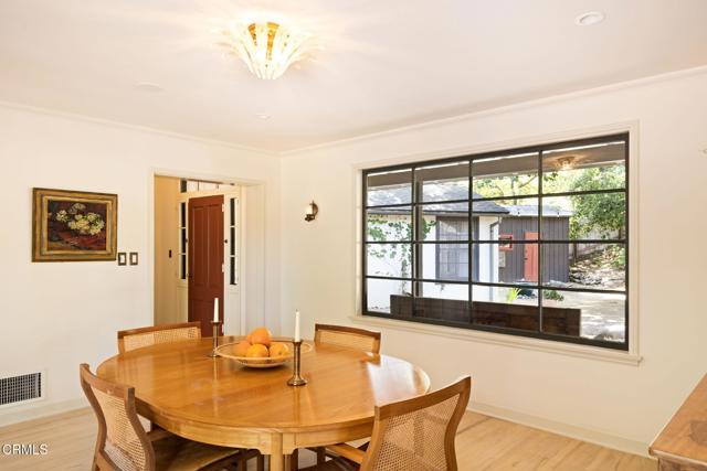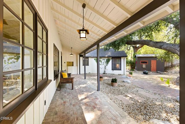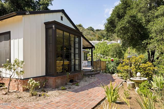 Sited to enjoy vistas of the San Gabriel Mountains and Pasadena City Hall, this 1938 home designed by architect Lawrence Test is the pinnacle of Linda Vista lifestyle. Privacy is paramount on this sprawling lot measuring over 3/4 acre with native oak trees, river rock masonry walls and views framed by mature landscaping. A Traditional Ranch style property with decades-honed brick pathways and board and batten siding, this home is one with the land. The front courtyard, anchored by a majestic Live Oak tree, is bordered by a vaulted portico leading to the entry. Classical elements blend with Spanish Colonial touches: romantic hand glazed tile and sink at the wet bar cabinet complement the traditional broad front door, flanked by entry lights and transom window. The home was designed to allow for ease of living, with a graceful flow from the entry into public rooms and large back yard via french doors and abundant windows. Offering 4 bedrooms and 3 baths, the scale and appointment of spaces here is artful: a grand living room with decorative fireplace joins the right-sized formal dining room, leading into an exquisitely updated kitchen featuring custom inset cabinetry, marble countertops and handsome ochre glazed tile backsplash. Top of the line stainless steel appliances, island with storage and adjoining pantry/laundry room and powder bath make this space ideal for modern living. Doors to front courtyard and back dining/grilling patio make for ease of access and seamless interaction between interior and exterior spaces. Private spaces include primary suite with handsome decorative fireplace, custom walk-in closet and renovated full bath with dual-sink vanity, soaking tub and walk-in shower. Two additional bedrooms enjoy peaceful garden views and share a full bath with elegant marble countertop, flooring and bathtub surround. A fourth bedroom, currently used as a den, boasts a charming fireplace with vintage hand-painted tile surround, tongue-in-groove paneling, charming built-ins, and a door opening to a rose-lined patio. The lush, grassy back yard bordered by several varieties of blooming iris, roses and scented geraniums is a dream. With privacy, views and birdsong - to be here is to be delivered to peace and nature, with space to play. Far reaches of the property reveal fruit trees on the upper terraces and a large shaded grassy pad encircled with oaks. This is a spectacular piece of architecture in an exceptional setting, what a fantasy to call home.