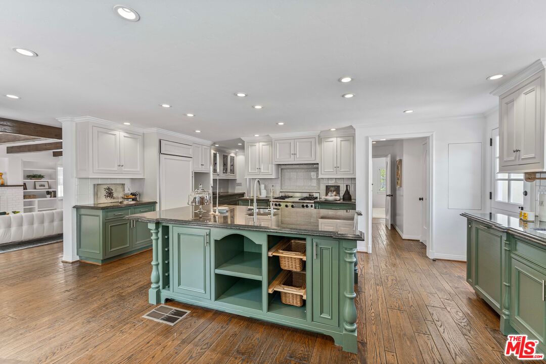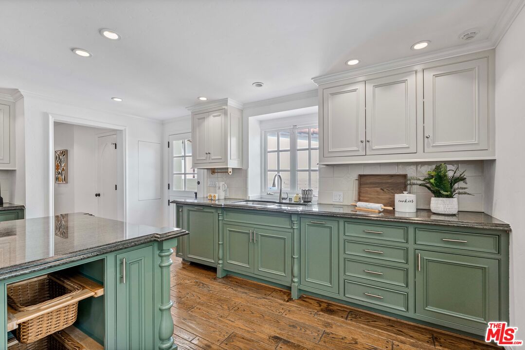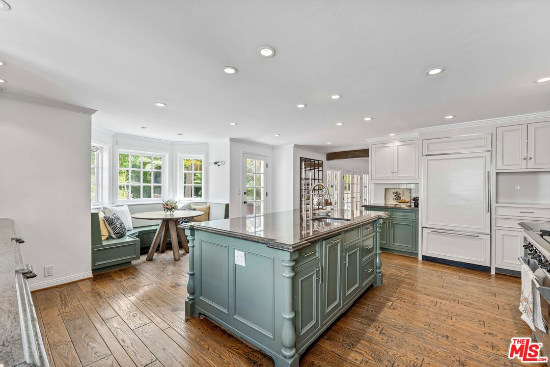 A true classic and rare Tudor designed by famed architect John Byers in Santa Monica's prestigious Gillette Regent Square (please visit TheByersTudor.com for more information about the home and its architect, the approved plans, and a video showcase of the property), this 3,974 square-foot home sits on a large lot with no alley that is just under 9,000 square feet. This rare lot size offers ample room to add a swimming pool and create your own private oasis. The lush front lawn welcomes you to a thoughtfully landscaped property that continues into a serene, tree-lined backyard ideal for relaxation and outdoor entertaining. Inside, rich architectural details abound. A gracious formal living room greets you upon entry and flows seamlessly into a warm, character-rich family room with wood-beamed ceilings. Both living spaces feature elegant gas and wood-burning fireplaces, while a custom wet bar creates the perfect setting for effortless entertaining. The heart of the home can be found in the generous chef's kitchen, which is outfitted with custom wood cabinetry, a large central island, and a sunny breakfast nook. Adjacent to the kitchen is the formal dining room, perfect for hosting family dinners and holiday celebrations. A flexible guest suite completes the downstairs and offers versatility for visitors, a home office, or multi-generational living. Upstairs, the sunlit primary suite overlooks the backyard and boasts a spacious en-suite bath, walk-in closet, and abundant storage. Three additional bedrooms and two more full bathrooms complete the upper level. Classic architectural elements including dual staircases and hardwood flooring add to the home's enduring appeal. This idyllic home is just minutes from world-famous Riviera Country Club, Brentwood Country Club, Brentwood Country Mart, Montana Avenue's restaurants and shops, and well-known dining options on Ocean Avenue. Families will appreciate the close proximity to Santa Monica's award-winning schools, including Franklin and Roosevelt Elementary and Lincoln Middle School. Included in the sale are approved plans that are two years in the making for both interior and exterior improvements as well as an ADU above the detached garage. This gives you the option to take advantage of the approved plans to enhance and update the home or enjoy this architectural gem as is.Interested in this Listing?