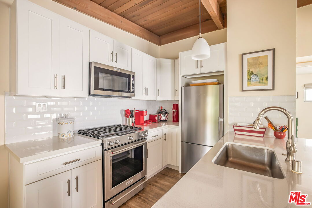 Light-filled and inviting, this 1-bedroom, 1-bathroom condo sits on the second floor of a classic Mid-Century building in one of Santa Monica's most convenient neighborhoods -- just blocks from Montana Avenue, the Third Street Promenade, and the beach. Inside, high, vaulted ceilings with exposed beams, wide-plank wood floors, and oversized windows bring warmth and openness to the space. The living and dining areas flow out to a spacious front patio, secluded behind lush landscaping -- ideal for relaxing or entertaining. The remodeled kitchen blends modern comfort with clean design, featuring quartz countertops, premium Kitchenaid appliances, a seated peninsula, and a generous pantry. In the bedroom, vaulted ceilings continue and clerestory windows allow bright natural light while maintaining privacy. An expansive walk-in closet and an updated full bathroom with tiled tub/shower and modern finishes complete the interior. Additional highlights include two mini-split A/C units, carport parking with storage, and a community laundry room. Enjoy the best of coastal city living just blocks from the beach, with effortless access to boutique shopping, acclaimed local dining -- including R+D Kitchen, Father's Office, and Elephante -- and a range of outdoor activities. Spend your days biking the scenic Ocean Front Walk, playing tennis or basketball at Reed Park, or exploring the attractions of Downtown Santa Monica, all just moments from your doorstep.Interested in this Listing?