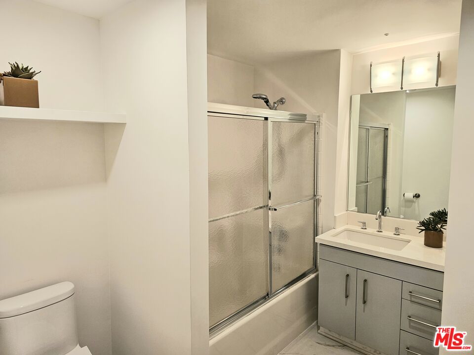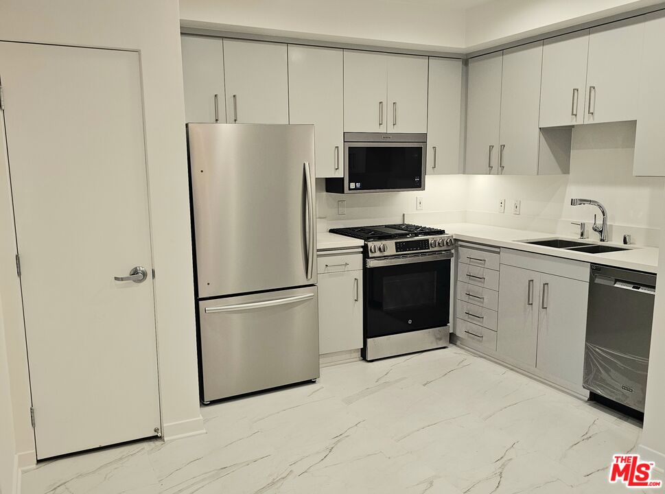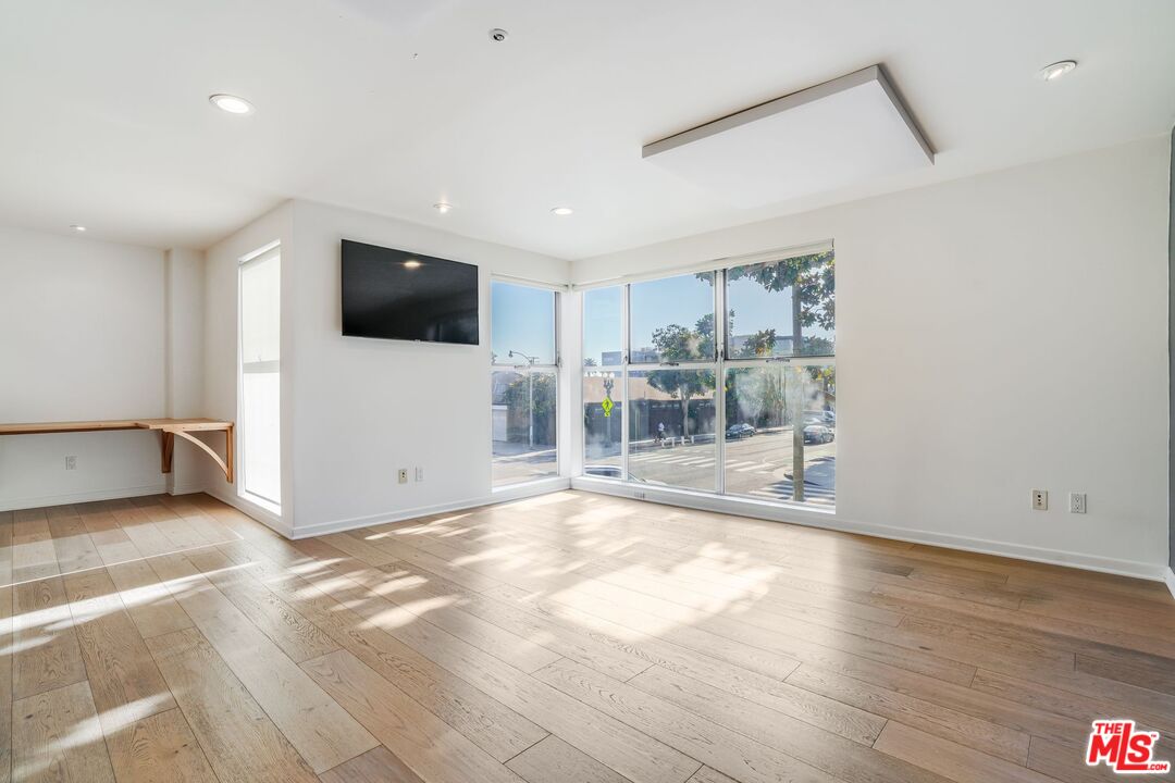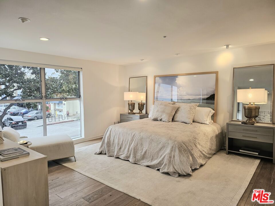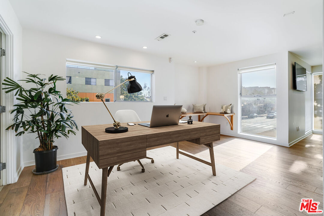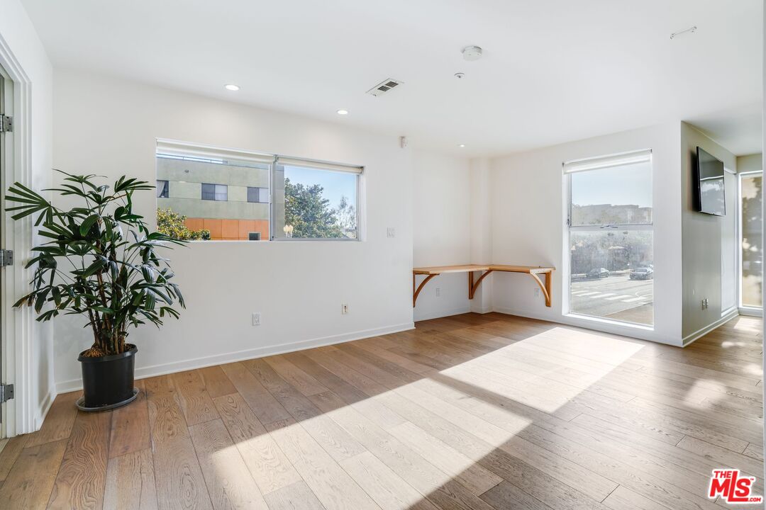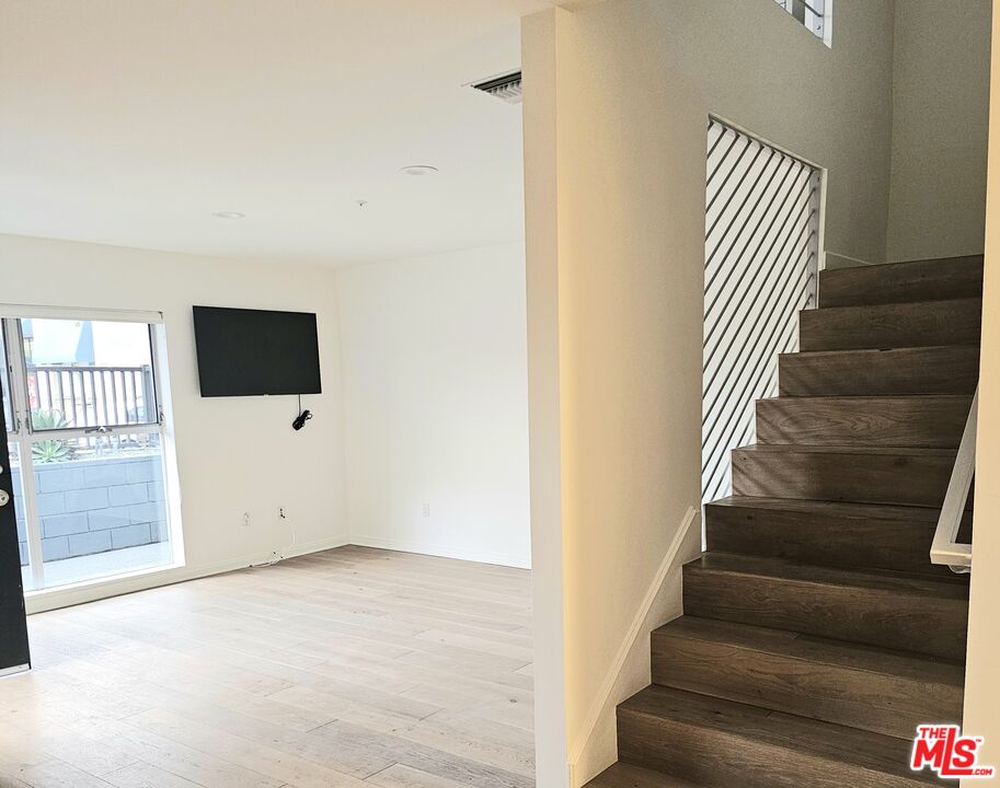 This spacious unit boasts nearly 1,600 square feet of living area, offering the feel of a large townhome. You'll enter from a secure first-floor private entry. The main living area is open and filled with natural light, providing ample room for comfortable seating and more. Just off the entrance, a perfect dining nook flows into the renovated kitchen, which features brand-new stainless steel appliances and enough space for a breakfast table. A renovated full bathroom is also conveniently located off the kitchen. For added convenience, a new stackable washer/dryer is located in a kitchen closet, along with two additional closets on the first level for extra storage. Upstairs, the bedroom level offers a space for a dresser or cabinet and a generously sized walk-in closet. The landing opens to a versatile area ideal for a home office or an additional sitting area, with the second bathroom located to the left. The bedroom itself is open to the upper level, maintaining privacy from the first floor. Large windows throughout the unit flood the space with light, while mature trees outside enhance privacy. The unit has been updated with light engineered hardwood floors, fresh paint, recessed lighting, and window treatments. It also includes one parking space in the secure underground garage, with additional parking available for $150 per month.Centrally located on the Westside, with easy access to the 10 Freeway, this unit is perfect for those seeking a bright, spacious, and updated home with the added flexibility of a live/work environment.