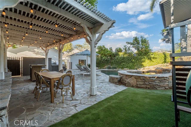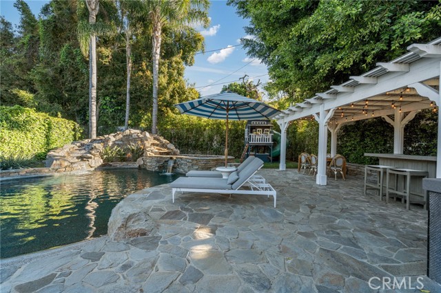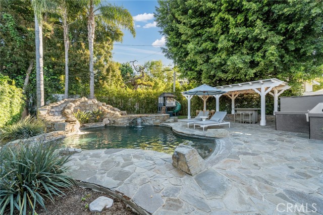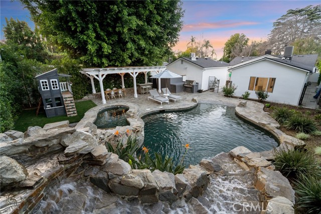 Discover a beautifully remodeled 4-bedroom, 2-bathroom traditional residence offering seamless indoor/outdoor living. Inside, enjoy clean lines, warm wood trim, new floors, custom built-ins, and an updated kitchen with stainless steel appliances, granite countertops, and a peninsula island. The luxurious primary suite features a spacious walk-in closet and bathroom with marble countertops. The family room and kitchen open to a private courtyard with a tranquil reflecting pool. A bright appx 400 sq ft detached studio provides flexible space for guests, work, or play. Outside you will find an abundant backyard paradise featuring a saltwater pool and spa with a cascading waterfall, a built-in BBQ perfect for outdoor dining under a covered trellis, and a charming playhouse. Recent extensive upgrades include a new roof, HVAC, double-pane windows/doors, fencing, interior/exterior paint, new trim, recessed lighting, reinsulated attic, and completely remodeled garage with HVAC and custom storage. The property also boasts professionally landscaped grounds, new flooring throughout, updated pool systems with app control, and a Ring security system. Situated on a long setback on a peaceful cul-de-sac, this home offers a prime location near top restaurants, shopping, and convenient access for commuting throughout Los Angeles. Experience the perfect blend of modern luxury and California living!Interested in this Listing?