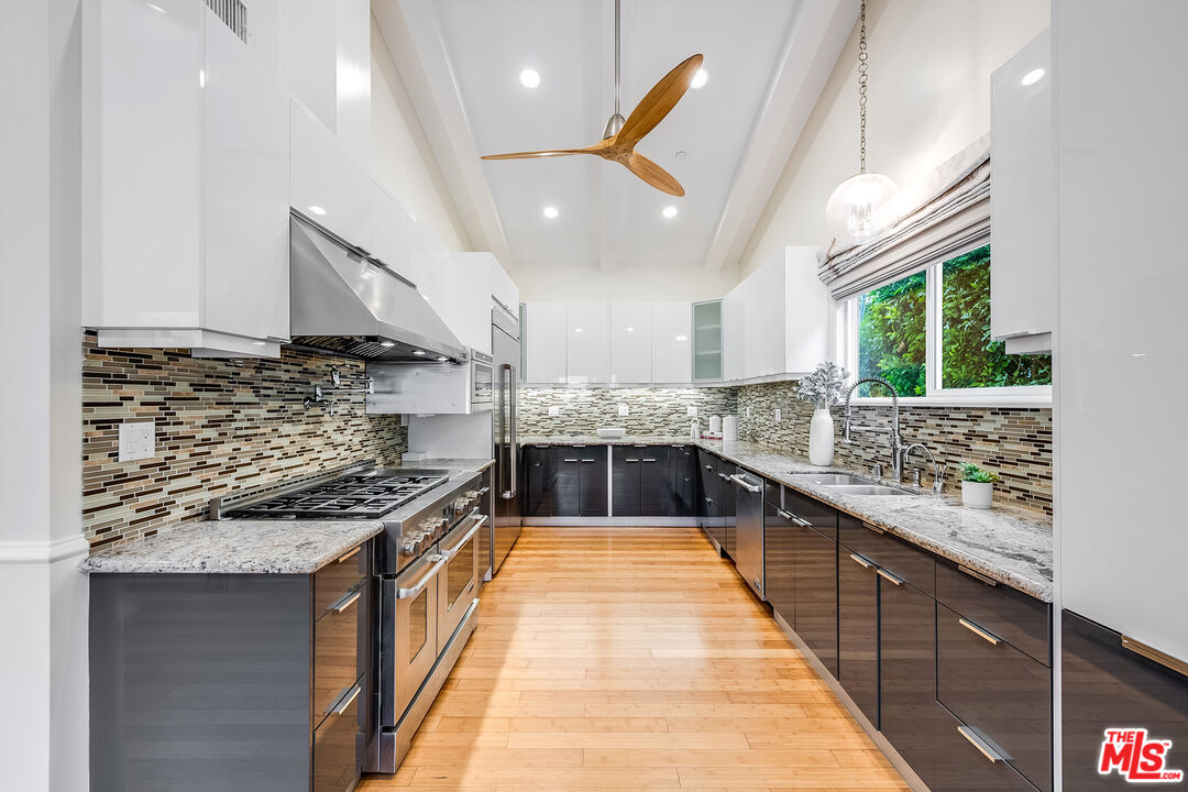 Stunning Gated Estate with Panoramic Views in Prime Sherman Oaks. Newly rebuilt in 2016 and located South of Ventura Blvd, this private 5-bed, 4.5-bath home offers over 5,000 sq ft of luxury living on a 12,558 sq ft lot. Bright and open with coffered ceilings, bamboo floors, built-in speakers, and great indoor-outdoor flow, perfect for entertaining. Enjoy two spacious living rooms (upstairs and down), formal and al fresco dining areas, and a chef's kitchen with granite counters, walk-in pantry, and high-end appliances. The primary suite features a fireplace, spa-like bath, and private balcony with stunning valley views. Upstairs includes 3 additional ensuite bedrooms plus a versatile 4th ideal as an office or guest room. The lower level is an entertainer's dream with a lounge, game room, wine fridge, high ceilings, and direct access to the pool, spa, and patio. A downstairs private 5th bedroom with ensuite is perfect for in-laws or teens. Top it off with a private rooftop deck offering 360 mountain and valley views, wet bar, and fridge, perfect for fireworks and sunsets. With a 3-car garage and extra driveway parking, app controlled outdoor security camera system, this move-in ready home combines style, space, and privacy in an unbeatable location.Interested in this Listing?