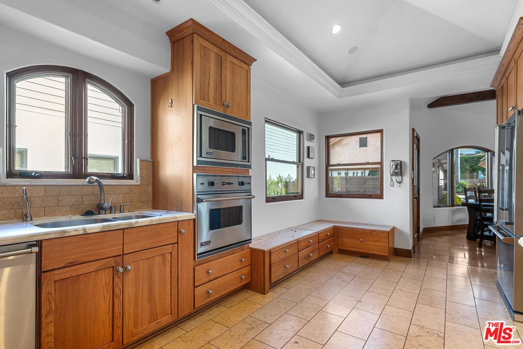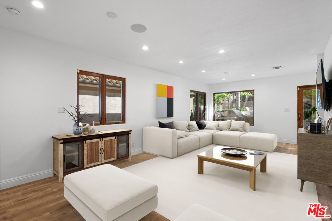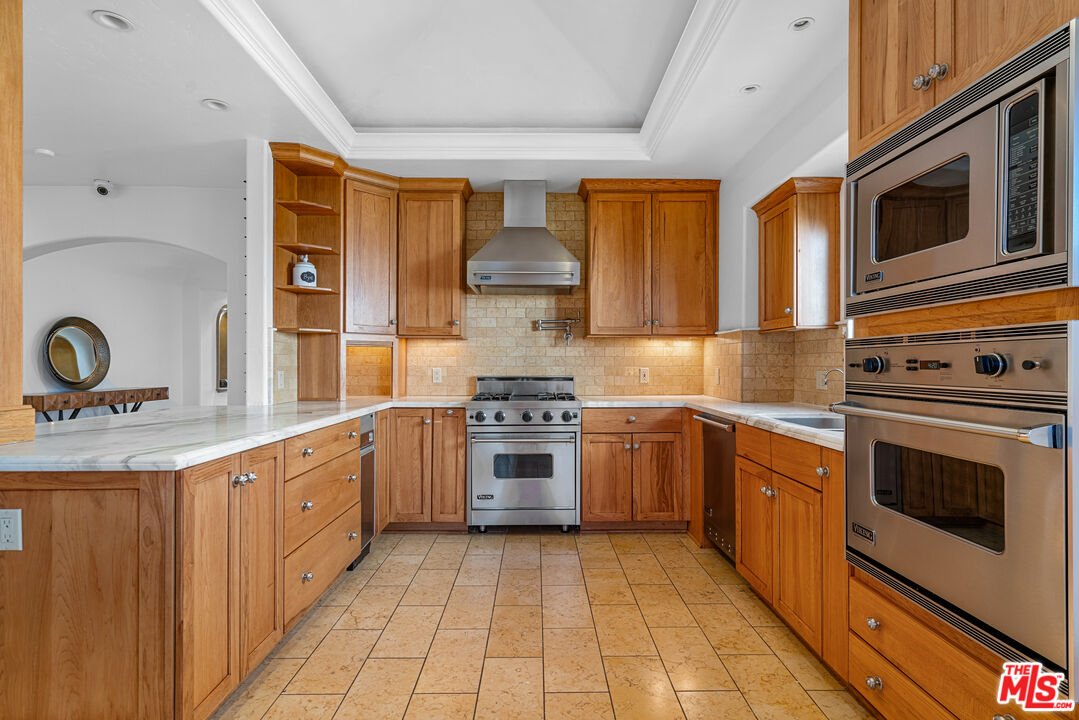 Welcome to your dream home in the heart of Sherman Oaks, where luxury living meets California-Tuscan elegance. Set on an expansive 10,000+ sq ft lot South of the Boulevard, this estate is a true entertainer's paradise. Enjoy year-round outdoor living with a sparkling saltwater pool, fire pit, Lynx BBQ island, and a full basketball court. Surrounded by privacy, the grounds are adorned with fragrant lemon and orange trees and spacious patios perfect for gatherings.Step inside this almost 3,200 sq ft masterpiece, where an open floor plan seamlessly guides you from the formal living room with a stunning limestone fireplace to the soaring ceilings of the grand dining room. At the heart of the home is the chef's kitchen, outfitted with top-of-the-line Viking appliances, dual ovens, Carrara marble countertops, and a breakfast bar that's perfect for entertaining. The kitchen also features a charming breakfast banquette, ideal for casual meals.Retreat to the serene primary suite, offering vaulted ceilings, remote-controlled skylights, and an enviable cedar-lined walk-in closet. The spa-like primary bath is a sanctuary, complete with an oversized glass shower and dual vanities. The family room suite is a dream for hosting, featuring built-in bookcases and a wet bar.Additional highlights include a versatile flex spaceperfect for a home gym or office, a dedicated movie theater/game room, two more spacious bedrooms, and two additional bathrooms. This home also offers parking for four cars, a laundry room with washer/dryer, an alarm system, and recessed lighting throughout.Solar panels help reduce your energy bills, making this home as eco-friendly as it is luxurious. Located in a prime Sherman Oaks neighborhood, you'll have quick access to the area's best shops and restaurants. This is more than just a homeit's a lifestyle. Welcome to the perfect blend of comfort, style, and convenience.Interested in this Listing?