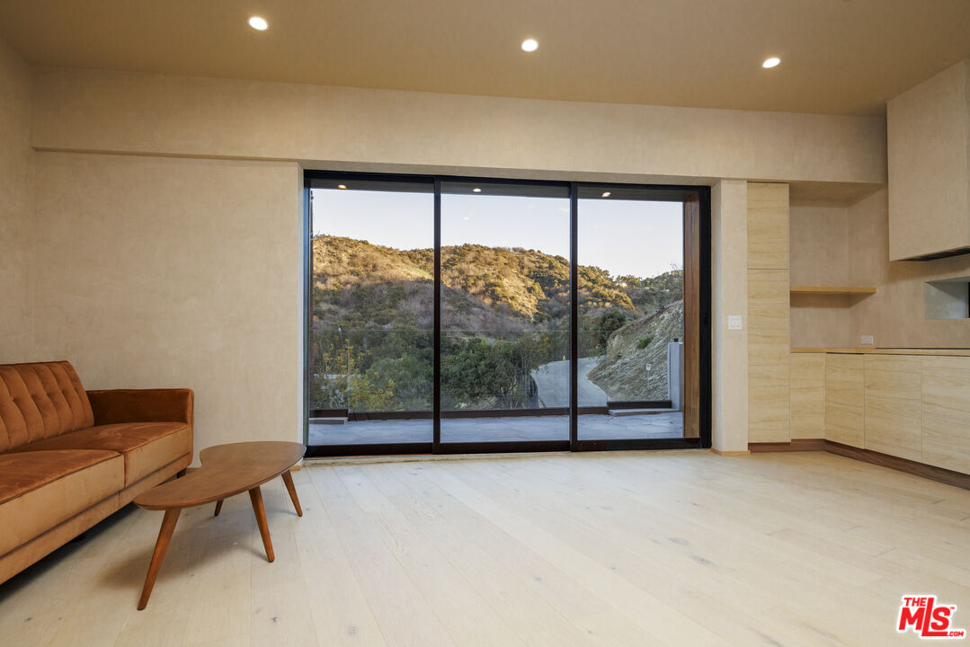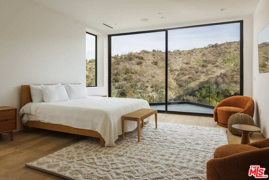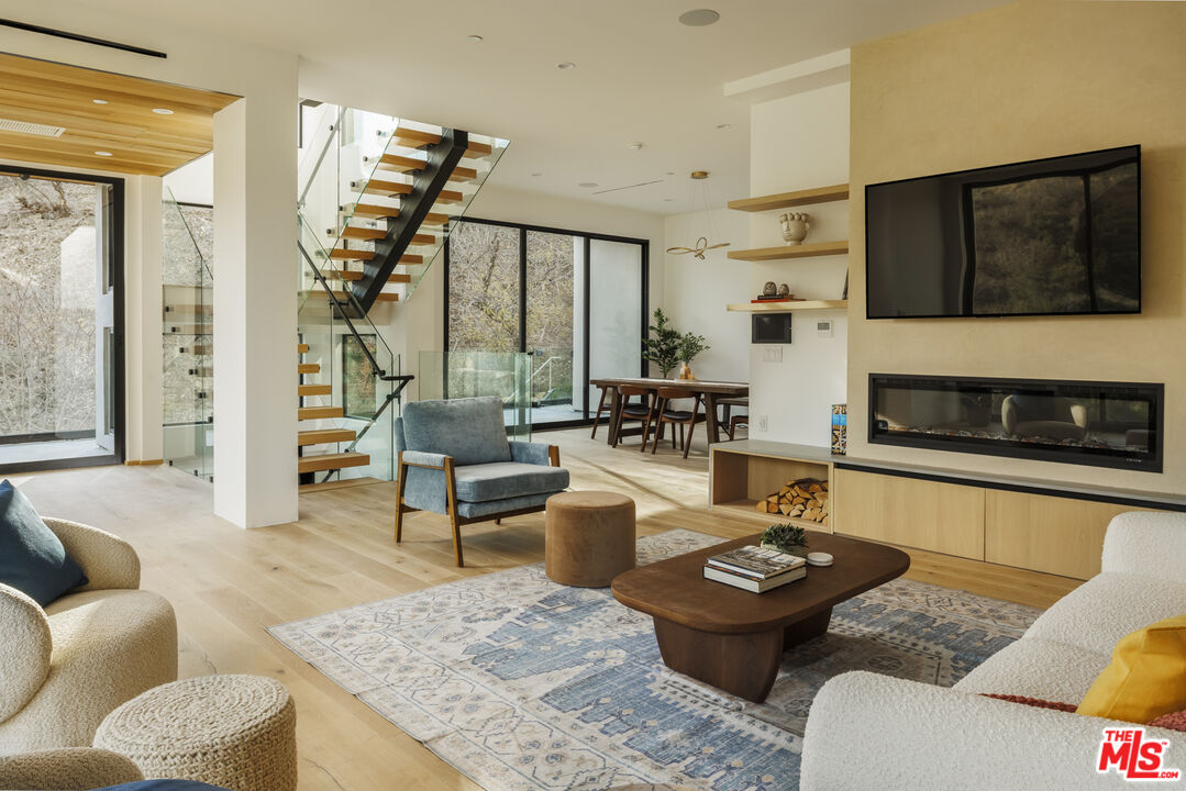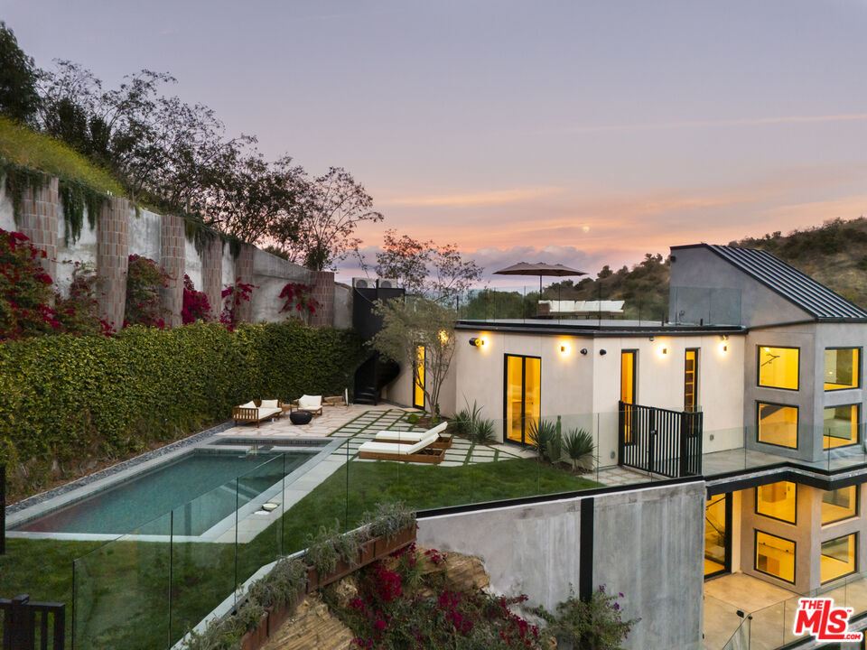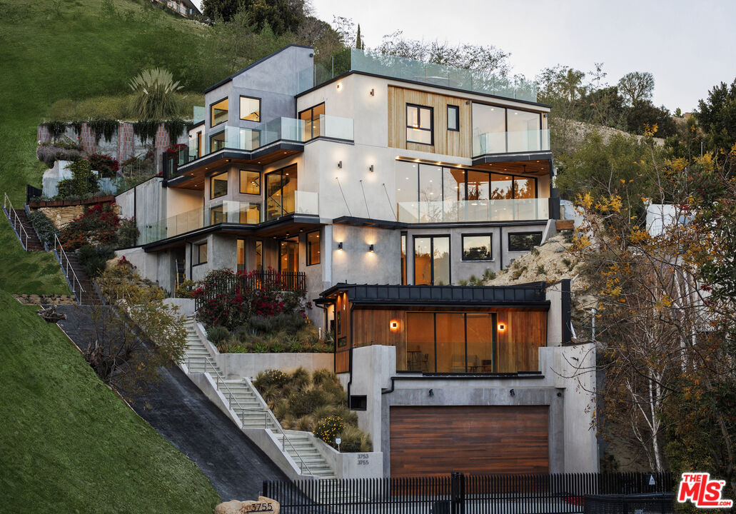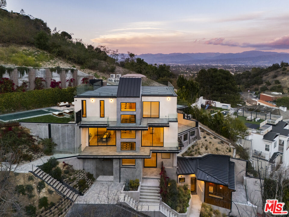 True to its name, 3755 Camino De La Cumbre, meaning "Path to the Summit," ascends above the hills of Sherman Oaks as a brand new constructed organic modern architectural statement built across four distinct levels connected by a private interior elevator. A floating staircase atrium with oak treads and glass railings introduces the home, illuminated by cascading crystal pendants. The main living level emphasizes clean lines and open flow. The living room centers around a custom electric fireplace set into a low-profile plaster surround, with a built-in media unit stretching across the wall. Floor-to-ceiling sliding Fleetwood glass doors expand the space onto a wrap-around balcony with sweeping hillside and city views. The kitchen showcases custom oak millwork cabinetry, open shelving, a Thermador appliance suite, and an oversized island with bar seating. A hidden den, tucked behind flush cabinetry, creates a private escape. The dining area anchors the space with designer lighting and another set of sliding glass doors leading to the balcony. The entertainment level commands attention with a temperature-controlled, glass-enclosed wine cellar built to showcase a substantial collection, and a sculptural marble island and backlit shelving define the adjacent bar. The theater room, designed for acoustic performance, offers a refined viewing experience. This level also holds an additional seating area and a flexible ensuite bedroom, easily adapted into an office. The third level prioritizes privacy with the three ensuite bedrooms, including the primary suite, which opens onto a terrace with treetop views and direct access to the backyard. The bathroom pairs dual vanities with designer black stone vessel sinks, gold fixtures, and an oversized glass shower with dual showerheads, a built-in bench, and a rainfall option. A freestanding soaking tub and custom walk-in closet complete the suite. The backyard transforms into a private outdoor retreat, complete with a pool, jacuzzi, integrated seating, and a built-in firepit. A spiral staircase ascends to the rooftop terrace with panoramic views. A separate side entrance allows guests to access the backyard independently.The detached guest house/ADU offers versatility with its own kitchen, bathroom, and balcony. Warm wood tones, smooth plaster walls, and black accents mirror the main home's organic modern design. Ideal for a home office, gym, studio, or private quarters. A Control4 smart home system integrates lighting, climate, and security. The two-car double height garage, fitted with a wood-paneled door, seamlessly aligns with the home's natural material palette and has room for two lifts for extra parking.Interested in this Listing?