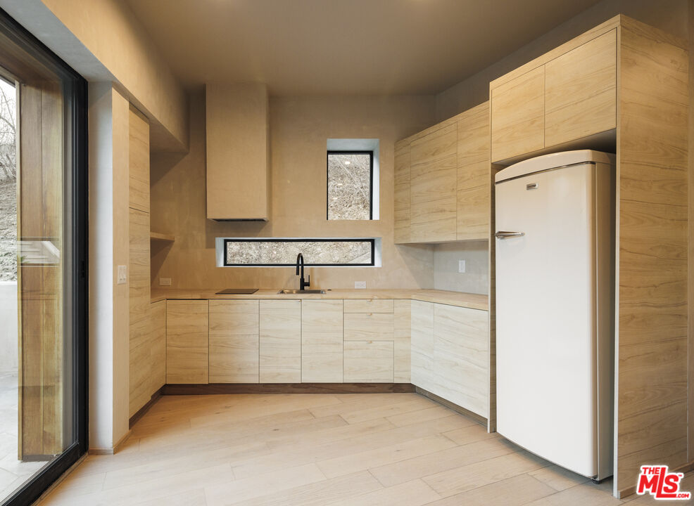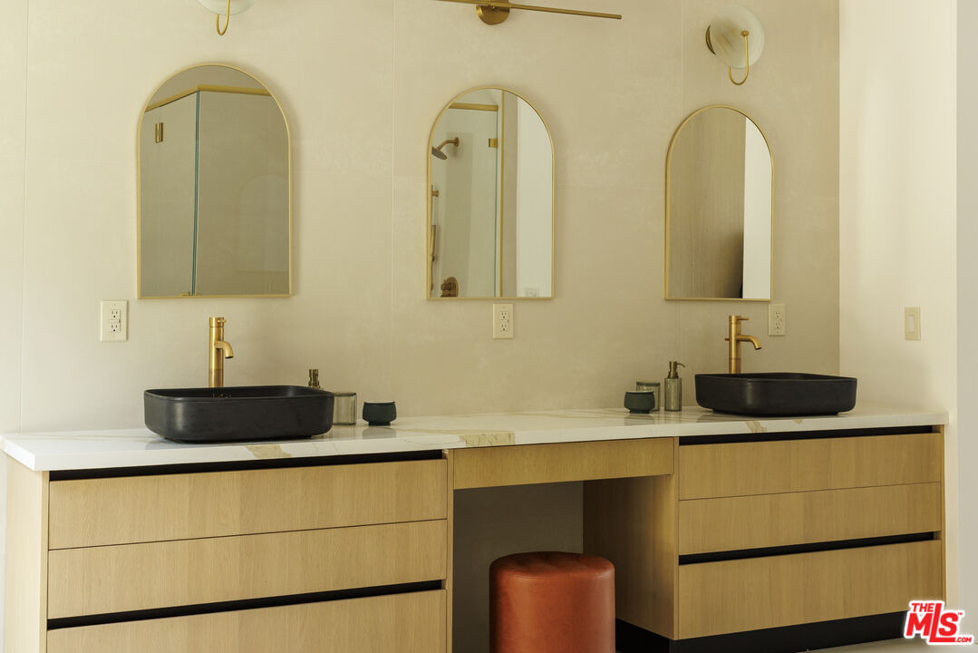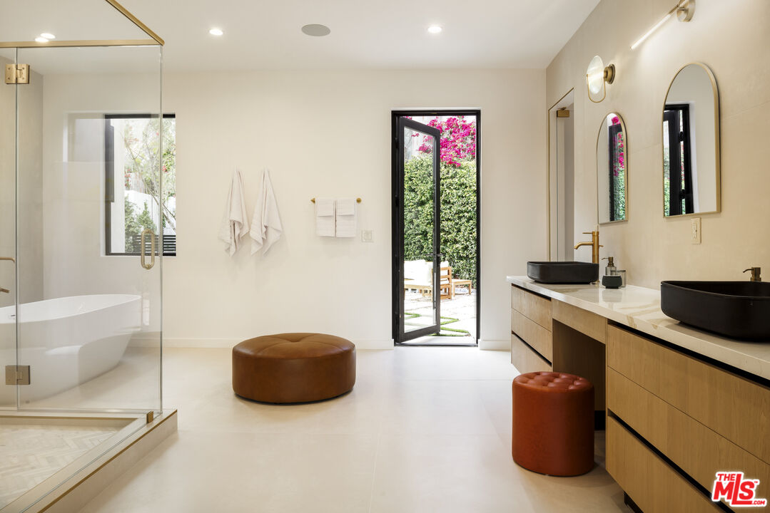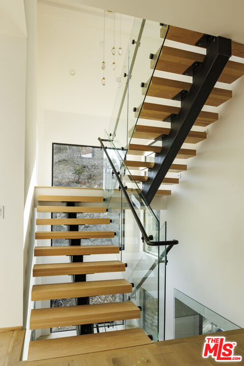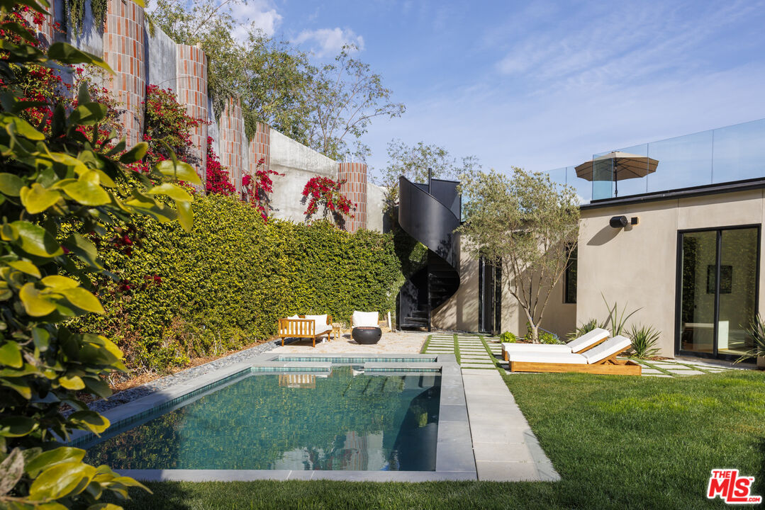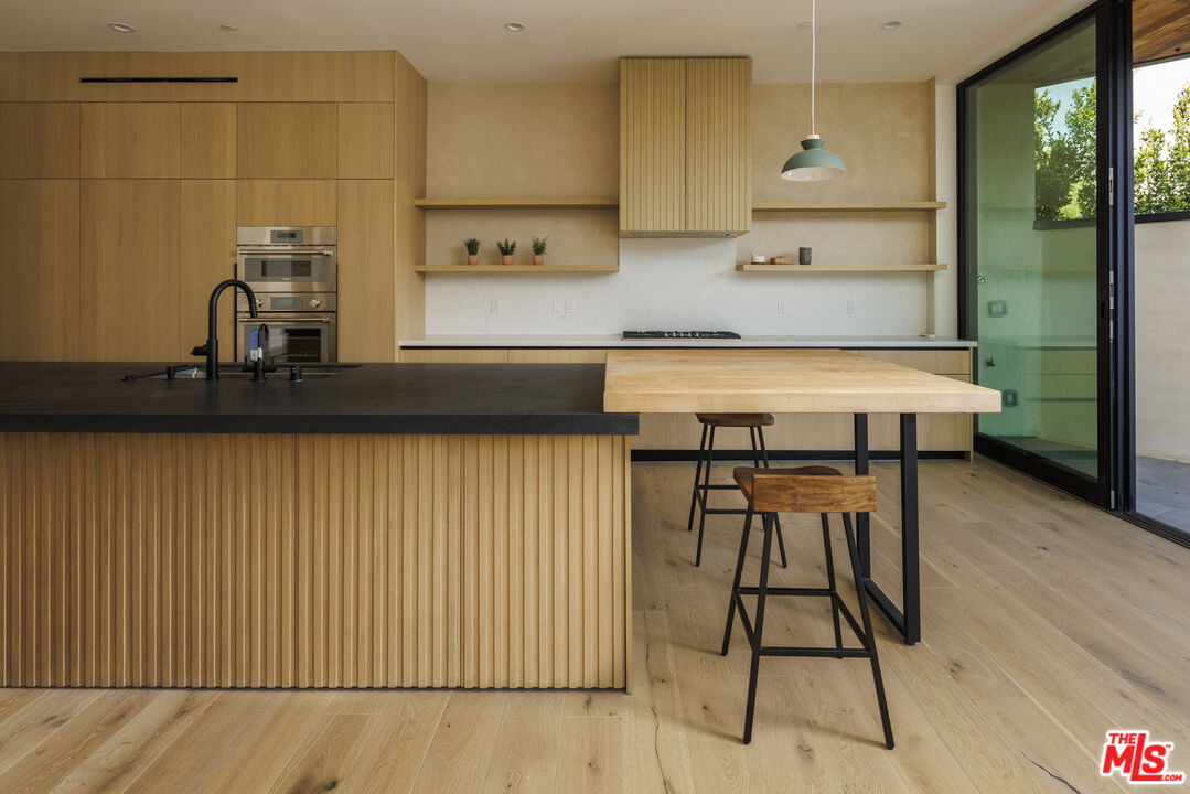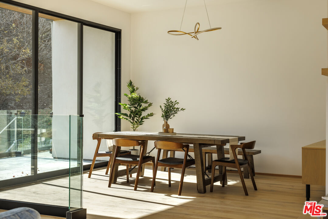 True to its name, 3755 Camino De La Cumbre, meaning "Path to the Summit," ascends above the hills of Sherman Oaks as a brand new constructed organic modern architectural statement built across four distinct levels connected by a private interior elevator. A floating staircase atrium with oak treads and glass railings introduces the home, illuminated by cascading crystal pendants. The main living level emphasizes clean lines and open flow. The living room centers around a custom electric fireplace set into a low-profile plaster surround, with a built-in media unit stretching across the wall. Floor-to-ceiling sliding Fleetwood glass doors expand the space onto a wrap-around balcony with sweeping hillside and city views. The kitchen showcases custom oak millwork cabinetry, open shelving, a Thermador appliance suite, and an oversized island with bar seating. A hidden den, tucked behind flush cabinetry, creates a private escape. The dining area anchors the space with designer lighting and another set of sliding glass doors leading to the balcony. The entertainment level commands attention with a temperature-controlled, glass-enclosed wine cellar built to showcase a substantial collection, and a sculptural marble island and backlit shelving define the adjacent bar. The theater room, designed for acoustic performance, offers a refined viewing experience. This level also holds an additional seating area and a flexible ensuite bedroom, easily adapted into an office. The third level prioritizes privacy with the three ensuite bedrooms, including the primary suite, which opens onto a terrace with treetop views and direct access to the backyard. The bathroom pairs dual vanities with designer black stone vessel sinks, gold fixtures, and an oversized glass shower with dual showerheads, a built-in bench, and a rainfall option. A freestanding soaking tub and custom walk-in closet complete the suite. The backyard transforms into a private outdoor retreat, complete with a pool, jacuzzi, integrated seating, and a built-in firepit. A spiral staircase ascends to the rooftop terrace with panoramic views. A separate side entrance allows guests to access the backyard independently.The detached guest house/ADU offers versatility with its own kitchen, bathroom, and balcony. Warm wood tones, smooth plaster walls, and black accents mirror the main home's organic modern design. Ideal for a home office, gym, studio, or private quarters. A Control4 smart home system integrates lighting, climate, and security. The two-car double height garage, fitted with a wood-paneled door, seamlessly aligns with the home's natural material palette and has room for two lifts for extra parking.Interested in this Listing?