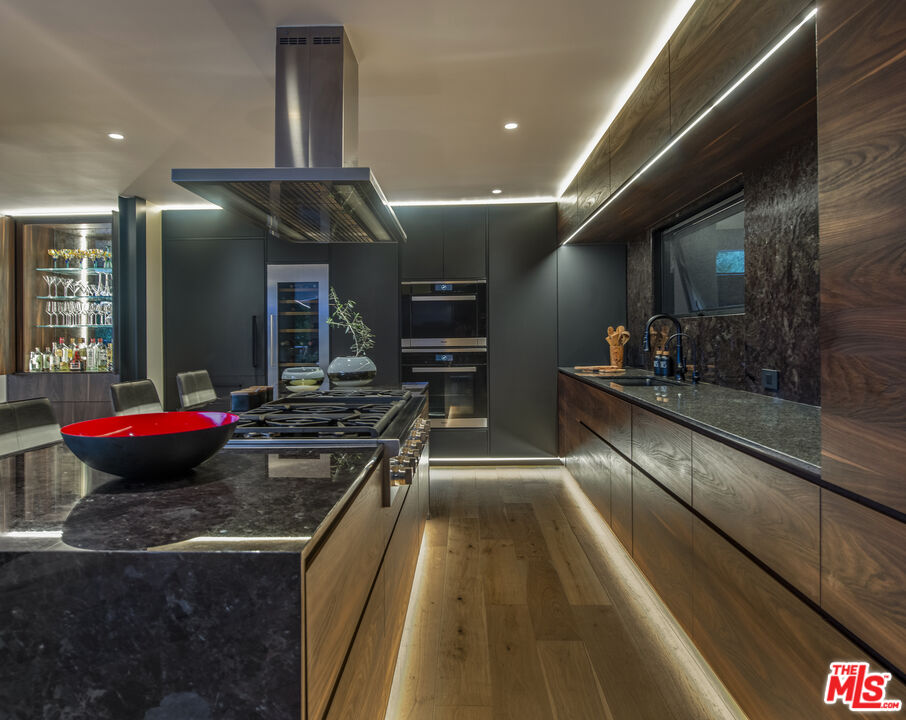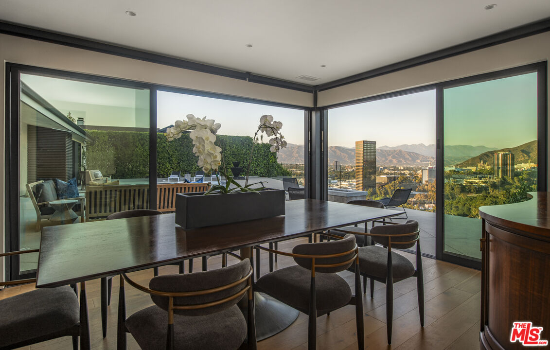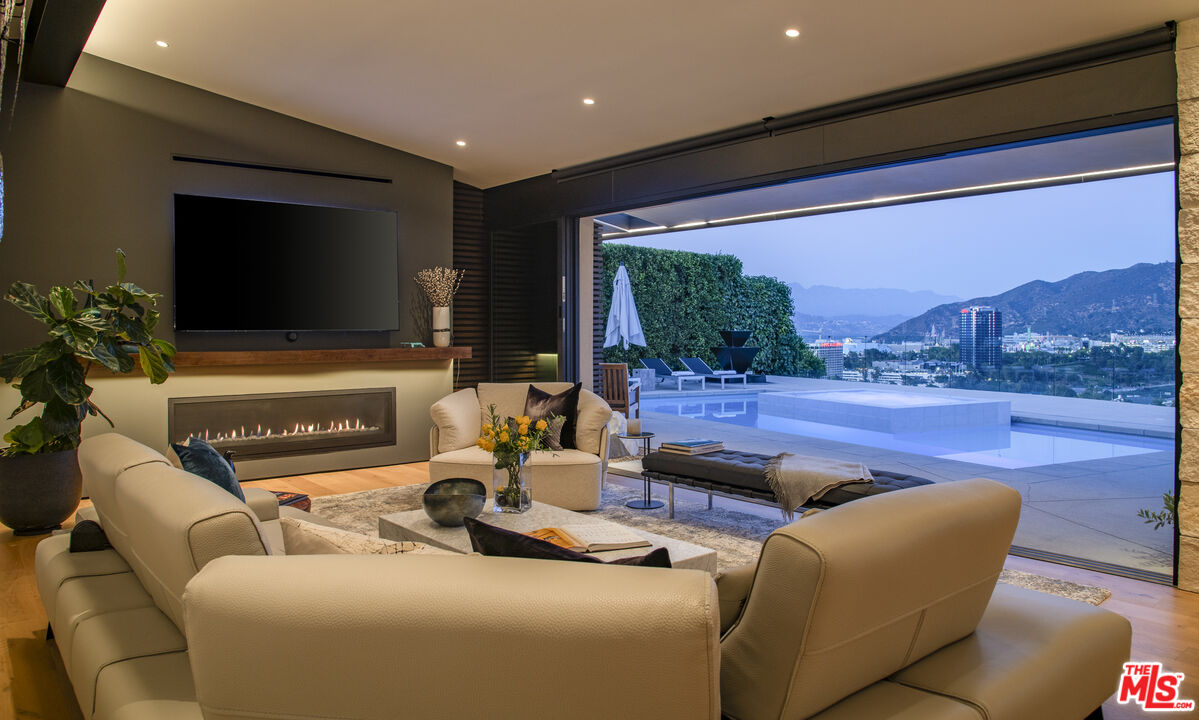 Spectacular Executive Retreat. Serene, quiet and excellent for any corporate Executive or Industry Writer seeking privacy. This contemporary home in Studio City, Los Angeles is a fully renovated hilltop retreat that offers a 180-degree view of Universal City and mountain ranges. Enjoy serene privacy with a waterfall entry and a high-end security system. Features include Fleetwood windows with a sliding open concept in living, dining, and kitchen areas, solar heating, and a solar saltwater pool and spa. The smart home integrates lighting and electric shades. Luxury touches include a master steam shower, custom cabinets with soft-close drawers, LED accent lighting, soft water plumbing, fireplaces in the living and master, a butler pantry, 2-zone HVAC, solid core doors, engineered wood floors, and porcelain bath floors with stone countertops. The sophisticated kitchen boasts Miele ovens, Subzero, Thermador 6-burner range with griddle, Liebherr dual-zone wine cooler, granite countertops, and custom cabinets. The finished garage features custom storage, an overhead rack, a finished floor, a Bosch refrigerator, and a custom garage door. Available immediately. The property comes fully furnished ONLY.Interested in this Listing?