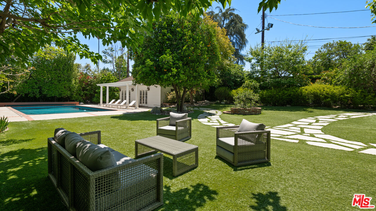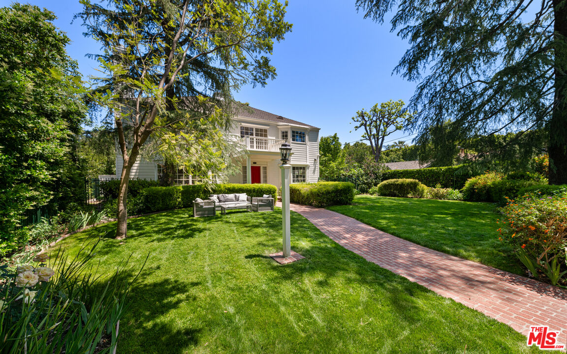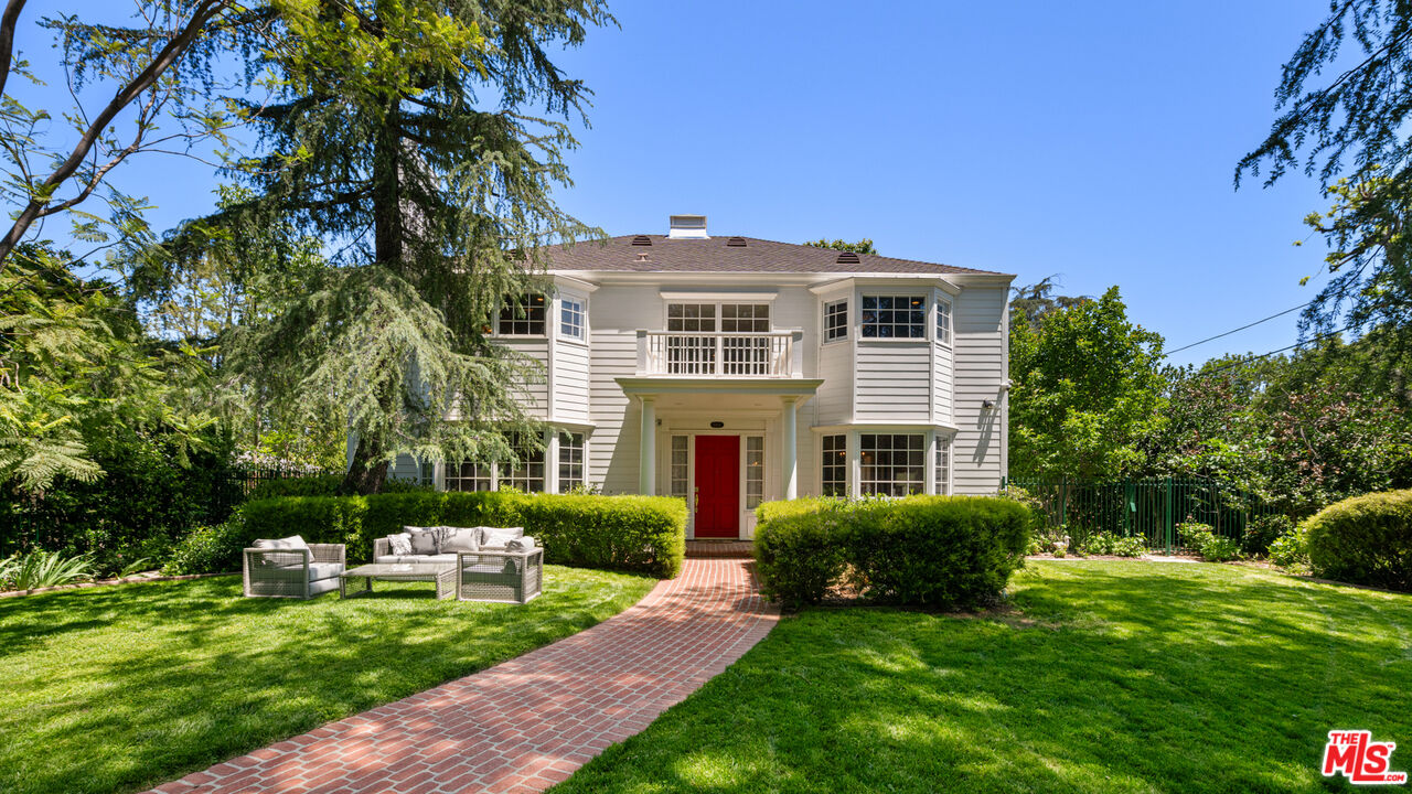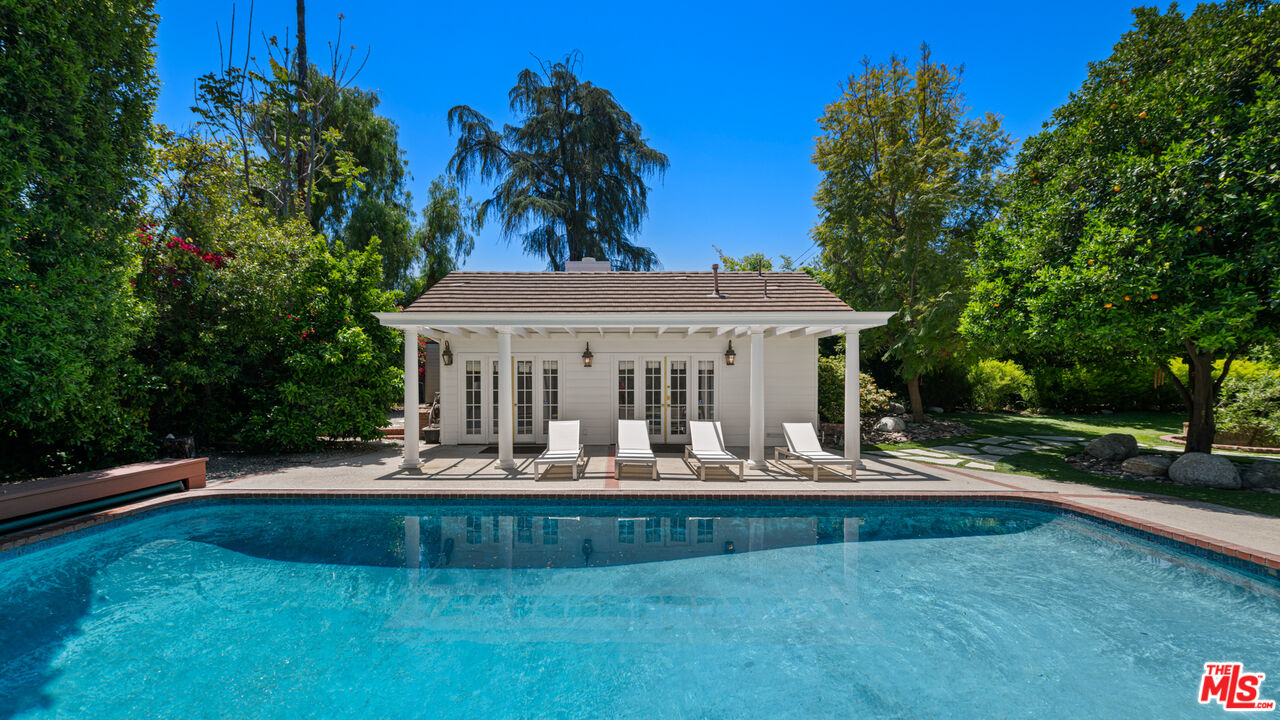 A rare entertainer's paradise in the heart of Tarzana. This gated 4500+sf Classic Georgian sits on an almost 1/2 acre flat lot S. of the boulevard offering both privacy and so much space that it's sure to become THE venue for every gathering. Step through the red front door into the grand foyer and immediately you'll notice the 10'ft ceilings throughout, meander through the formal living and dining rooms to the spacious family room leading to the covered porch, ideal for SoCal's indoor-outdoor lifestyle and casual outdoor parties. The inviting chef's kitchen offers tons of cabinet space, high-end appliances and a butler's pantry. Upstairs, the primary suite is a serene retreat with a spa-like en-suite bathroom and a large terrace overlooking the incredible backyard and gleaming pool. Two additional bedrooms each have en-suite bathrooms, and the study/library, also with terrace access, is an ideal home office or study space. The absolute showstopper is the lush, flat, park-like backyard with its fruit trees, ranging from pomegranate, avocado, apple, walnut and 7 types of citrus, and its sparkling pool and outdoor grilling area. House guests may decide to stay a while thanks to the approx. 400sf guest house that can double as a pool cabana. A beautifully maintained rose garden and an enclosed garden area for vegetables with raised beds complete the picture. Close to great schools and just off Ventura Blvd, this property has a 3-car garage and a full attic with 8' ft ceilings. Be ready to become the favorite home for birthdays, showers and weddings. You may even get a location scout knocking on your door!Interested in this Listing?
