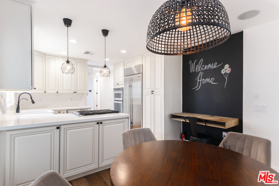 Nestled serenely South of Ventura Boulevard, this remarkably upscale, contemporary Craftsman Bungalow welcomes you with mature landscaping and a lovely gated driveway, fostering quiet privacy to begin your unique experience within this modern retreat. As you approach, a classic front porch invites you in. Upon entering, you are immediately struck by the clean lines, open spaces and thoughtful artistic touches throughout the home. Designer finishes abound, with wood floors, vaulted ceilings and large double-paned windows bathing the effortless flow of the Living Room, Dining, and Kitchen areas in natural light. The kitchen is a chef's dream, boasting shaker-style cabinetry, stainless steel appliances including a Subzero refrigerator and a custom-built desk. This thoughtfully designed bungalow offers two spacious bedrooms, that include a Primary Suite and beautifully remodeled bathrooms, accommodating all your needs with simplicity and grace. Additional features include central heating and air conditioning, a convenient laundry room with utility sink and a Nest thermostat. The lush, expansive outdoor spaces present endless possibilities, with multiple areas for dining, entertaining, and socializing, including a delightful pergola. Enjoy the convenience of many nearby local dining and coffee favorites, Whole Foods Market, and the scenic Corbin Canyon Park hiking trails, offering a beautiful lifestyle. This sanctuary creates a harmonious experience that will make it difficult to leave, offering the ultimate in ease and lifestyle. A beautifully taken care of home that embodies exquisite taste and style, offering the ultimate and best of modern living in a prime location. Other Amenities include: Tesla EV Charger in the Garage and Storage Space in the Garage.Interested in this Listing?