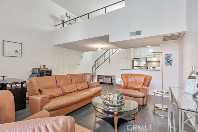 Welcome to this bright and modern 1-bedroom, 1-bath loft-style condominium located in the gated community of California Place. This unique two-level unit features soaring high ceilings and an open-concept layout that creates a spacious and airy atmosphere. The main bedroom and full bathroom are privately located on the upper level, with an open view overlooking the living and dining areas below, giving the home a stylish loft-like appeal. Carpeted stairs lead up to the second floor, where you ll find the master bedroom, a generous closet and abundant natural light. Downstairs, dark laminate flooring adds a sleek, contemporary touch throughout the living and dining spaces. The kitchen is well-equipped with granite countertops, a stainless steel refrigerator and stove, and a white microwave perfect for comfortable and functional everyday living. Step out onto your private balcony and unwind to the soothing sounds of a tranquil water feature just outside in the beautifully landscaped common area. This condo includes two assigned tandem parking spaces and access to a wide range of resort-style amenities, including a sparkling pool and spa, a clubhouse for social gatherings, a BBQ area, a fitness center, a sauna, and convenient on-site laundry facilities. Ideal for the first-time buyer ready to stop renting and start building their real estate portfolio, this home offers a rare combination of comfort, convenience, and community in one of the area's most sought-after gated neighborhoods.Interested in this Listing?