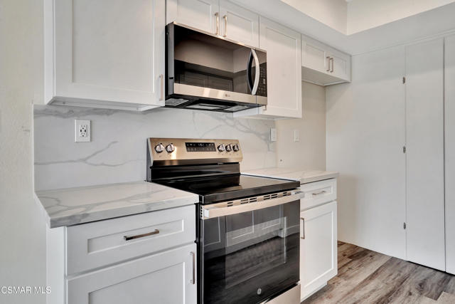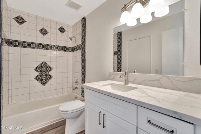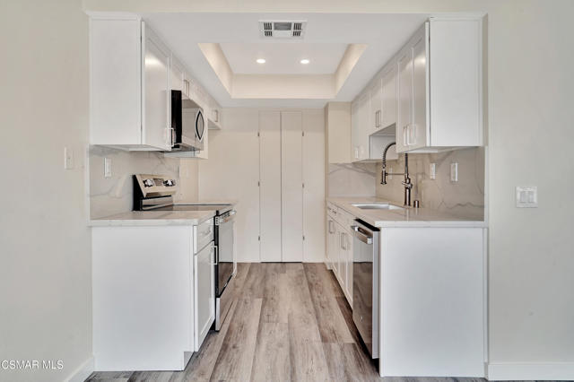 Completely Remodeled Top-Floor Condo in the Heart of Tarzana. Welcome to this beautifully remodeled, top-floor 2-bedroom, 1-bathroom condo, offering 866 sq. ft. of modern living space with high vaulted ceilings and peek-a-boo mountain views.Everything is brand new - from the stylish kitchen cabinets, sleek quartz countertops with full backsplash, to the stainless steel appliances including a dishwasher, stove, and microwave. Gorgeous new laminate flooring flows throughout the home, while the primary bedroom features new mirrored closet doors for a contemporary touch.The bathroom has been fully updated with a new vanity, matching quartz countertops, and dual access from both the hallway and primary bedroom, making it ideal for both guests and privacy.Step out onto the large private patio off the dining area--perfect for enjoying California evenings. The unit also includes a 2-car tandem garage with a garage door opener and a private storage room.The community is fully gated, including guest parking, and features beautifully landscaped grounds with a pool and spa. HOA dues cover water, trash, sewer, and access to amenities, providing great value.Located in a quiet and well-maintained complex, units like this rarely come on the market--especially top-floor units with vaulted ceilings and complete remodels. Just minutes from shopping, dining, public transportation, and all the best that Tarzana has to offer.Don't miss this rare opportunity--schedule your showing today!Interested in this Listing?