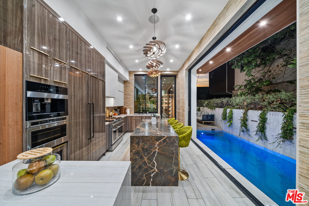 Presenting the iconic "Maya, Lady of Botanica," one of three newly built "Glass Ladies Houses" by acclaimed designer Alon Zakoot. This tropical zen Tulum-inspired trophy property, has been featured in over fifty publications globally, and is known for its harmonious blend of tropical jungle elements and botanical accents. Step into Maya's realm, where she seamlessly transports you to a world of natural beauty and tranquility. Upon arrival, prepare to be captivated by the grandeur of the towering glass-and-steel entrance, complemented by sloped overhead lines and meticulously curated drought-tolerant flora. The living room features a decadent fireplace, shimmering accent wall, and sliding glass doors that open onto the enchanting patio and walls of glass onlooking the sparkling saltwater pool and spa.The masterfully designed kitchen boasts a double-waterfall island, state-of-the-art appliances, custom cabinetry, and a convenient pass-through to sparkling saltwater pool and spa and the main-level indoor/outdoor lounge, complete with fire pit and additional bar seating. The dining room is adorned with a staircase-turned-art-piece. Ascend to the upper level, where the primary suite awaits, offering a private balcony with stunning views, a floating dual-sink vanity, rainwater shower, separate tub, and a brilliant clerestory window framing vistas of mature palms. The additional bedrooms and bathrooms showcase the finest fixtures and finishes, ensuring a luxurious living experience. Upstairs awaits a stunning rooftop deck with an outdoor kitchen, dining area, lounge furniture and oversized firepit. The rooftop features breathtaking 360-degree views of the cityscape, mountains, downtown Los Angeles and beyond. Descend to the lower level, where a junior primary suite awaits, featuring its own fireplace and an exceptional outdoor living room adorned with a botanical wall and open-air elegance. On this level you will also find a beautiful theater, equipped with a built-in mini bar and blackout shades, as well as an atrium letting in natural elements and light, and an additional guest suite. Maya, Lady of Botanica stands as an extraordinary architectural feat, presenting a rare opportunity to own a slice of tropical Tulum paradise in Silicon Beach. Conveniently located blocks from the best shopping, nightlife and entertainment Venice has to offer on Abbott Kinney and Rose Ave, and moments from the beach, this residence epitomizes a seamless blend of luxury living and Venice lifestyle.