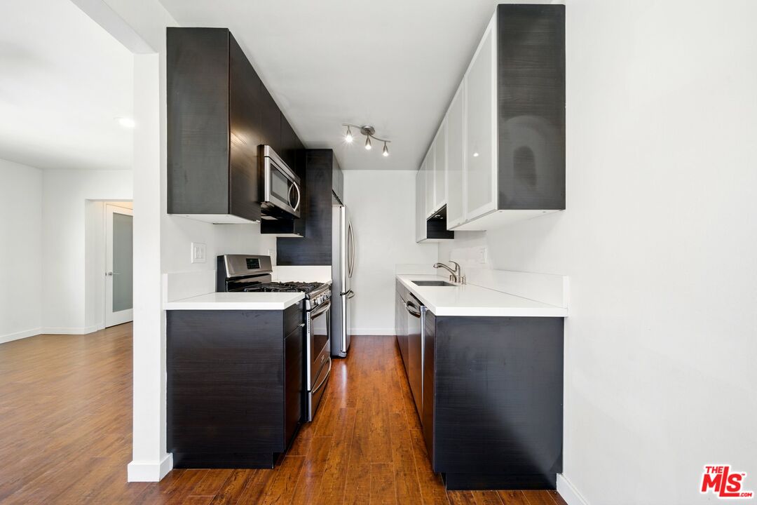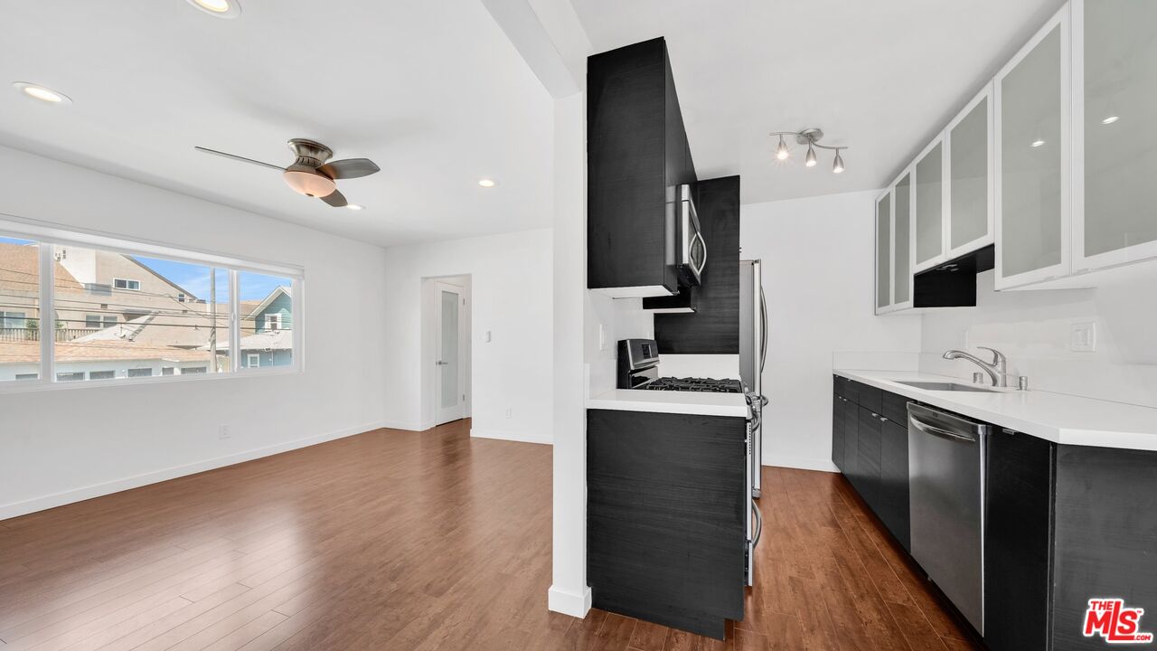 TOP FLOOR light & bright corner unit with only one common wall, and only one block from the beach, right off of Main Street and super close to Abbot Kinney. This beautiful top floor one bedroom has an updated kitchen with stainless steel appliances and lots of cabinet space, a remodeled bathroom with tub & shower and a spacious bedroom. Other features include, AC, wood laminate floors and a generous closet in the hallway between the living room and bedroom. No pets.