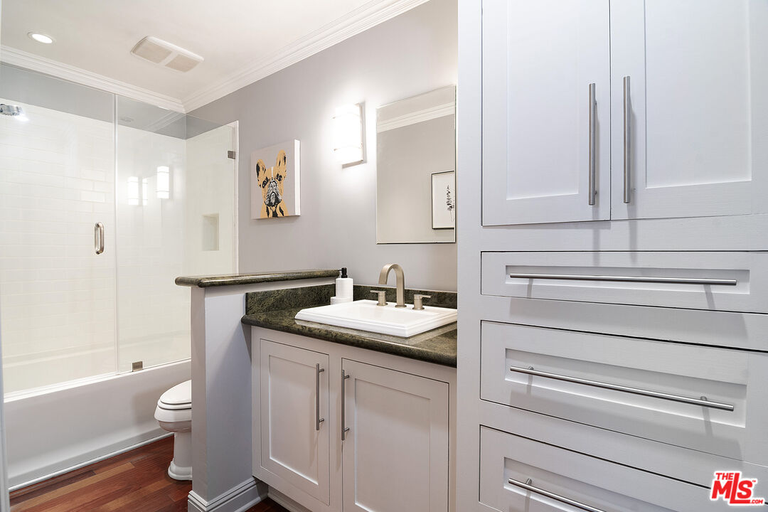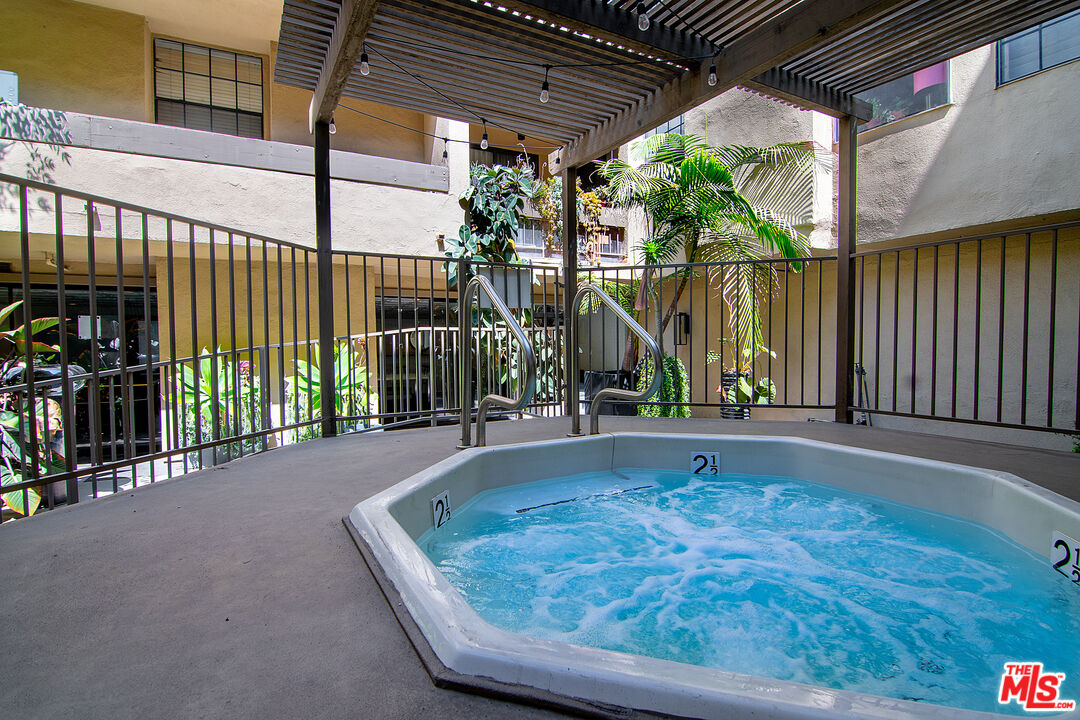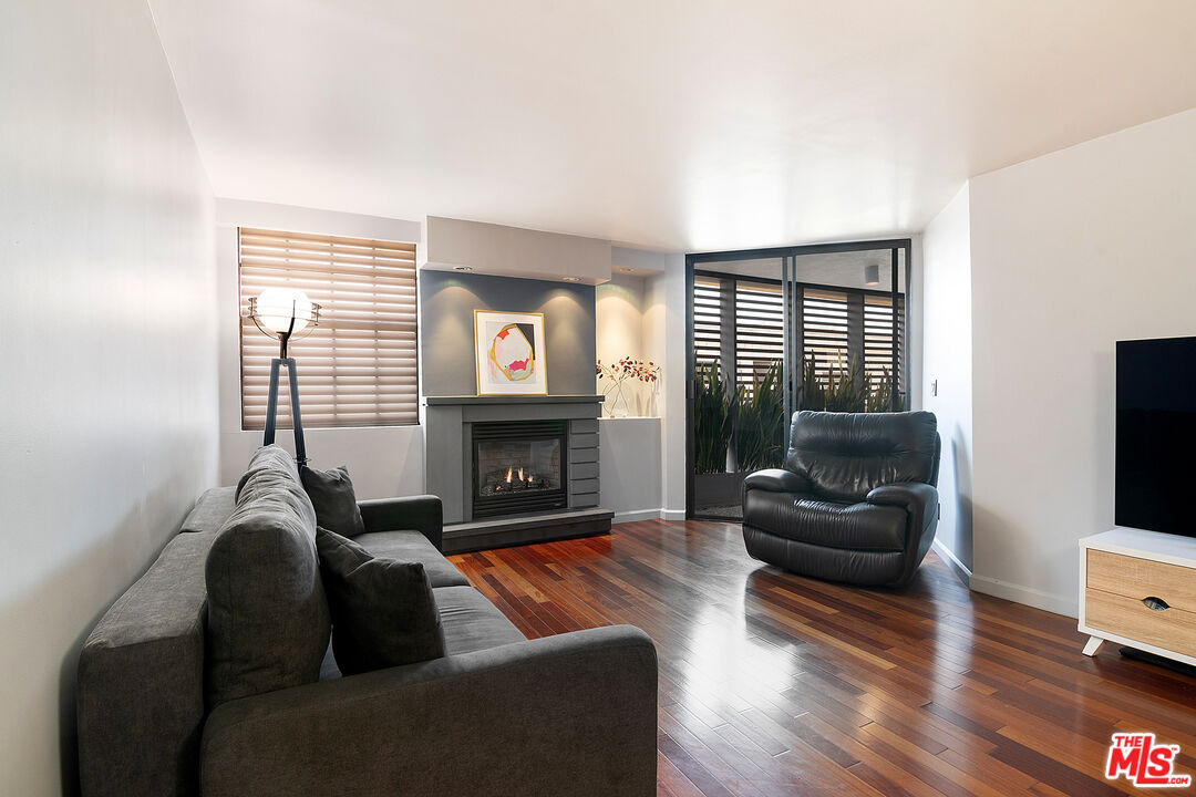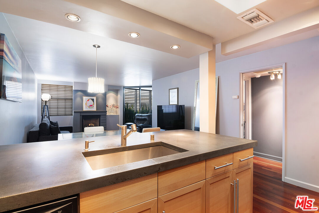 Top-floor south-facing 1-bedroom, 1-bathroom condo on tree-lined Kings Road in the heart of West Hollywood! The kitchen features stainless steel appliances, concrete countertops, recessed lighting, and generous cabinet space. Enjoy an open-concept dining and living area with a cozy gas fireplace and sliding glass doors that lead to a private patio. The spacious primary bedroom boasts a walk-in closet and direct access to the patio. The updated bathroom includes granite countertops and a tub/shower combo. Additional highlights include hardwood floors throughout and central AC and heat. Community amenities include secure garage parking, a fitness center, two spas, laundry facilities on each floor, and a rooftop sun deck with BBQ area and stunning mountain and treetop views. Just steps from West Hollywood's top shops, restaurants, and nightlife!Interested in this Listing?
