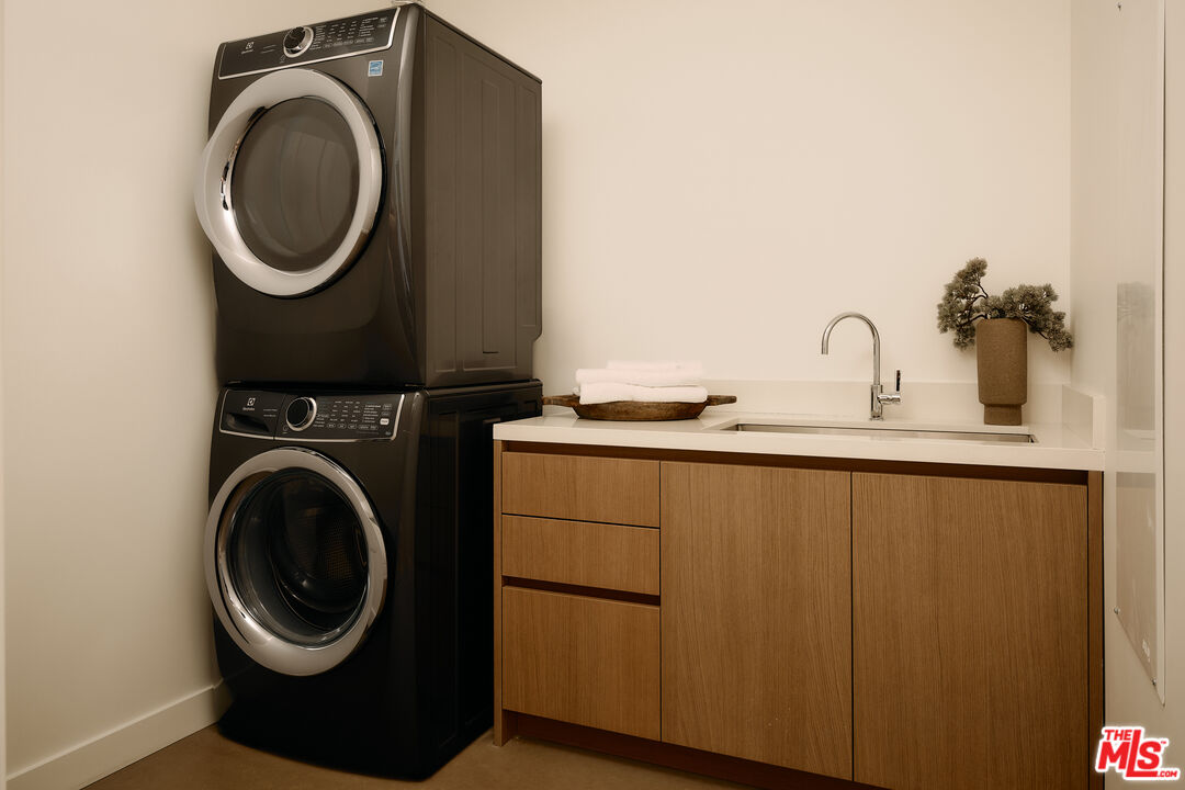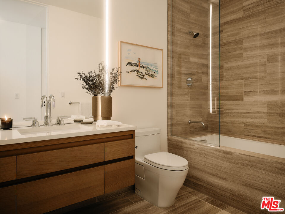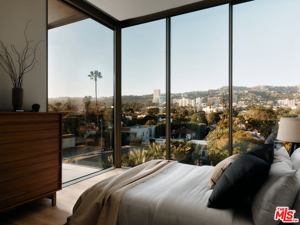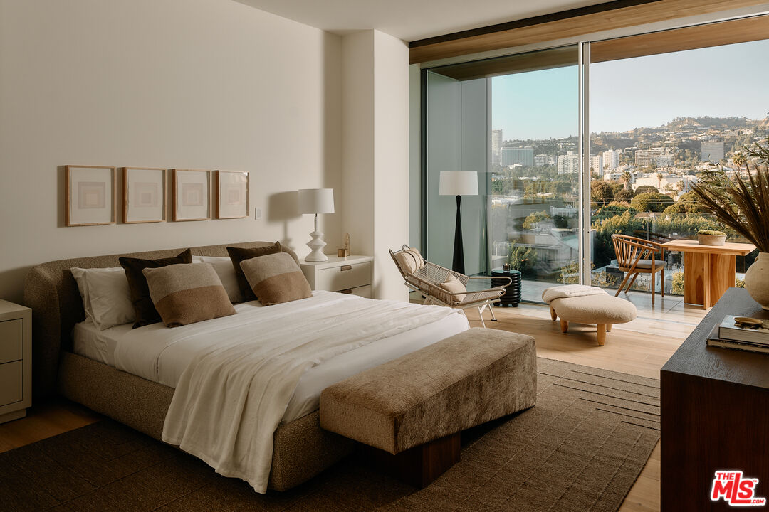 Residence 5E | One of the final north-facing residences offered new from the developer at 8899 Beverly - the coveted Olson Kundig-designed landmark in West Hollywood's Design District. Prized for its serene ambiance, privacy, and unobstructed Hollywood Hills views, this 2-bedroom, 2.5-bath home spans 2,423 square feet, blending timeless craftsmanship with modern sophistication.A bronze-framed walnut entry door leads into an expansive living space, where floor-to-ceiling, triple-glazed ultra-clear glass walls seamlessly integrate indoor and outdoor living. Soaring 11-foot ceilings and wide-plank French White Oak flooring enhance the home's warmth and openness, while custom cove lighting adds a refined ambiance. The private terrace, framed by capless Starfire glass railings and accessable from both the living areas and primary suite, ensures uninterrupted sightlines to the hills beyond.The custom-designed chef's kitchen is a masterclass in form and function, featuring white oak cabinetry and Italian Calacatta gold marble countertops. Outfitted with Gaggenau, Miele, and Sub-Zero appliances, including a Gaggenau 400 Series cooktop, dual Miele wall ovens, built-in espresso maker, Sub-Zero refrigerator, full-height wine refrigerator, and double dishwashers, this space is designed for culinary excellence and effortless entertaining.The primary suite offers a generously sized walk-in closet and a spa-inspired bathroom clad in Italian travertine, featuring a glass-enclosed shower, dual sinks, and an Agape Spoon XL extra-deep soaking tub positioned against floor-to-ceiling glassa tranquil escape with breathtaking views. The second bedroom also features a walk-in closet and ensuite bath.Additional highlights include a dedicated laundry room equipped with Electrolux front-load washer and vented dryer, adding convenience and functionality to the layout.As an award-winning, LEED-certified architectural landmark, 8899 Beverly offers unparalleled full-service living, including 24-hour concierge and valet services, a state-of-the-art fitness center, and a quarter-acre outdoor retreat with a resort-style pool, spa, fireplaces, and an open-air kitchen. Steps from world-class dining, shopping, and entertainment, residents also VIP access to Stella Restaurant, located within the building.
