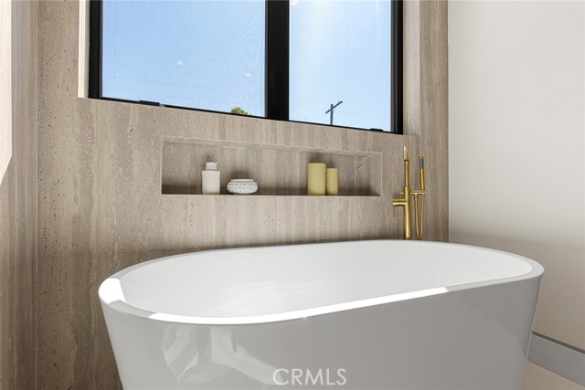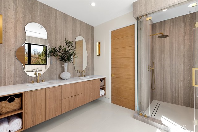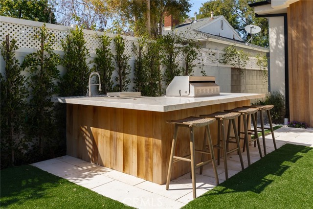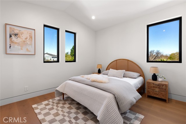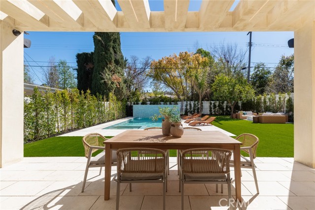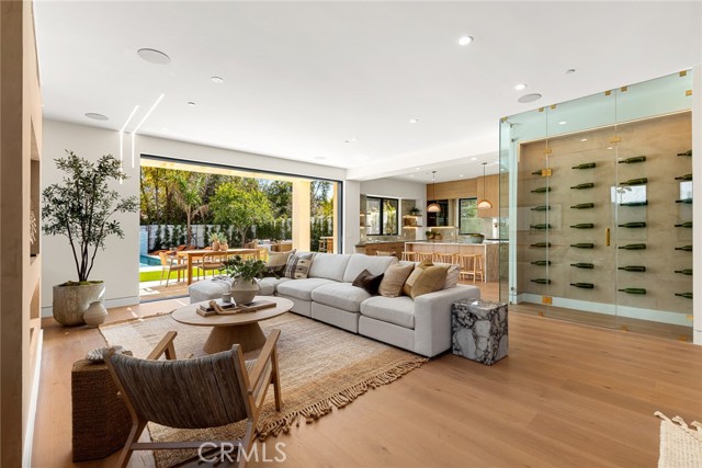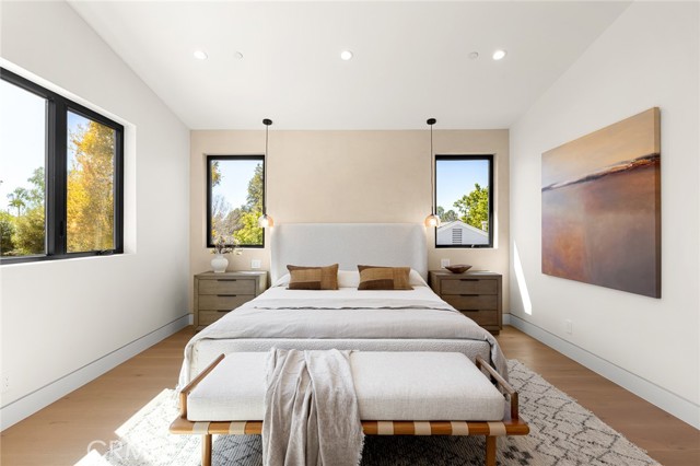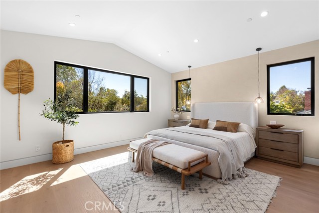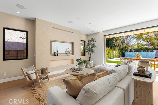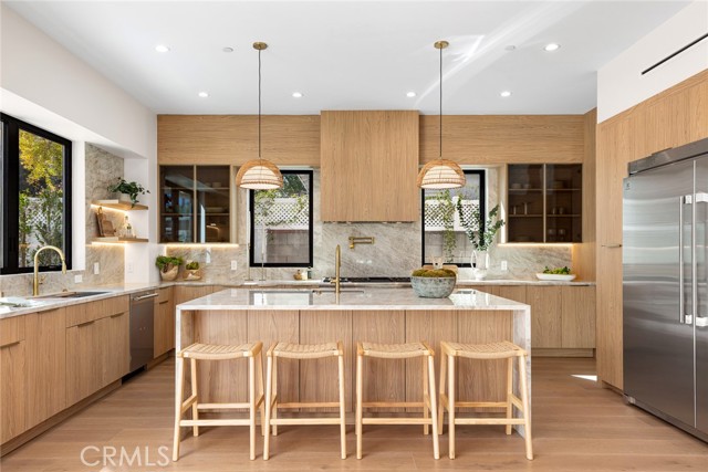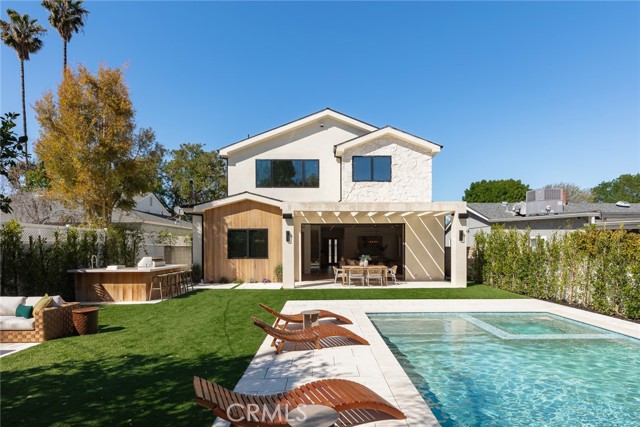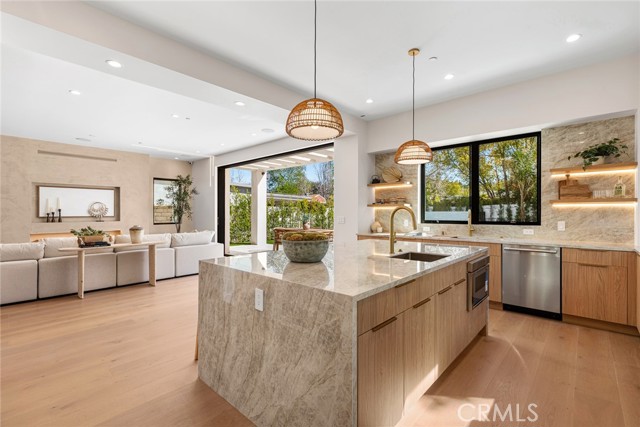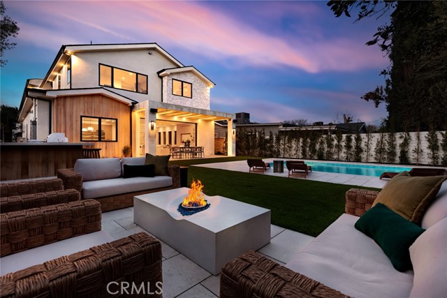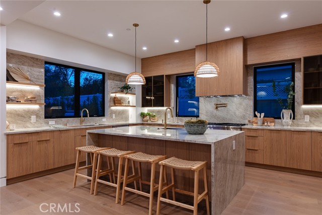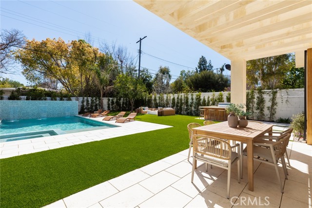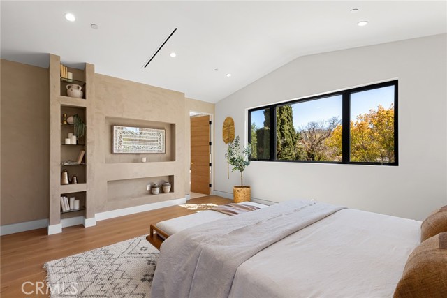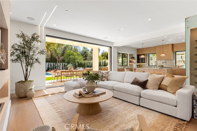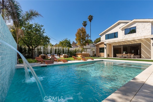 A Modern Sanctuary in the Heart of Woodland Hills. Step into elevated living with this stunning new construction in Woodland Hills where modern design meets serene sophistication. Thoughtfully crafted to feel both luxurious and livable, this 2-story masterpiece offers 5 bedrooms, 5.5 bathrooms, with engineered white oak floors spanning both the first and second levels creating a cohesive, modern elegance. From the moment you walk in, your eye is drawn to the home s most striking feature: a wall of expansive pocket sliding doors that immediately reveal the lush backyard, serene pool and tranquil waterfall. This dramatic entry moment creates a sense of openness and tranquility, blurring the line between interior and exterior. Rich wood accents throughout seen in the ceiling details and exterior tones add warmth and elevate the overall aesthetic. At the heart of the home is a chef s dream kitchen outfitted with high-end Thermador appliances, a porcelain slab island, and sleek European-style light oak cabinetry. A cozy reading nook and a spacious laundry room add warmth and function to the thoughtful design. A versatile downstairs bedroom offers the perfect space for guests or a private office. An illuminated staircase adds ambiance and architectural interest. 3 generously sized bedrooms, including 2 with walk-in closets, provide ample space for rest and retreat. The primary suite is a standout, featuring a fireplace, oversized windows, a spa-like bath with soaking tub, and a large walk-in closet that feels more like a boutique dressing room. The outdoor space is an entertainer s dream complete with a built-in BBQ, fridge, burner, and multiple lounge areas, all framed by elegant landscaping and natural stone hardscape. Additional features include, 2-car garage with epoxy floors & EV charger outlet, Fully paid solar system, Dual AC units & electric gate, Smart home tech, built-in speaker system & security cameras. Every corner of this home has been thoughtfully designed with timeless finishes, soft neutral tones, and an effortless sense of calm. All nestled in one of Woodland Hills most desirable pockets this is more than a home; it s a lifestyle. Situated minutes from Calabasas Commons, Westfield Topanga, and top-rated public and private schools like Sierra Canyon, Viewpoint, and Woodland Hills Private, this home checks every box for elevated, family-friendly living.