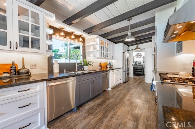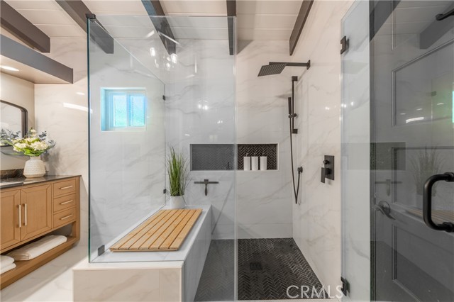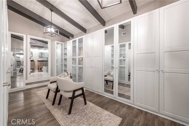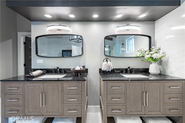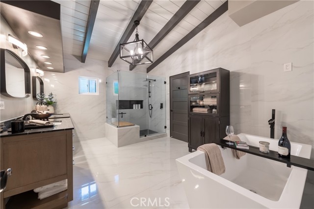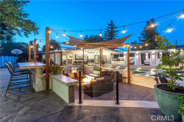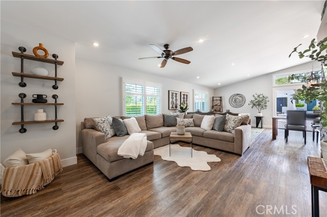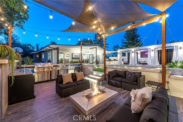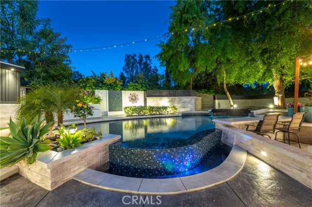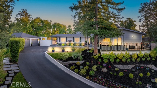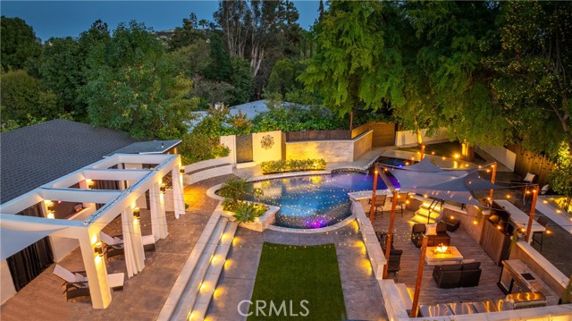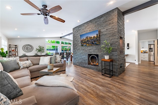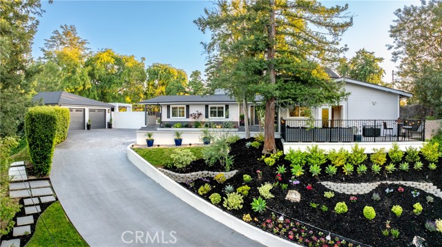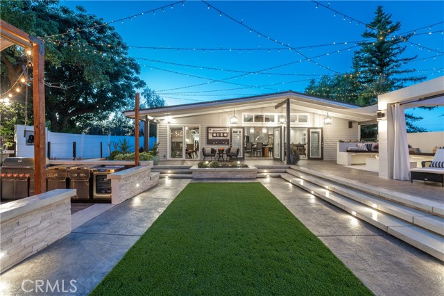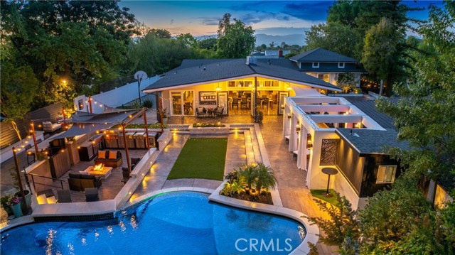 Tucked at the end of a peaceful cul-de-sac in the coveted Vista De Oro neighborhood, this breathtaking single-level gated estate is a rare gem that effortlessly fuses mid-century modern elegance w/today s most luxurious upgrades. Reimagined w/high-end designer finishes & curated architectural details, this home offers an extraordinary lifestyle of comfort, privacy, & resort-style living. From the moment you step through the gates, you re welcomed into a sanctuary of serenity. Inside, soaring vaulted & beamed ceilings, gleaming wood floors, & natural light from multiple skylights create a warm & sophisticated ambiance. The expansive living room showcases a stacked stone fireplace, custom plantation shutters, & French doors open to an entertainer s dream backyard, creating the quintessential California indoor/outdoor experience. Host unforgettable dinners in the formal dining room, enhanced by a stylish corner fireplace & statement pendant lighting. The chef s kitchen is a showstopper, featuring SS appliances including a professional-grade Thermador stove & hood, stone countertops, soft-close cabinetry w/glass inserts, beadboard ceilings, & a walk-in pantry. The adjoining breakfast nook, complete w/matte slate walls & sliding doors to the yard, adds charm & functionality. A custom espresso bar w/wine fridge & a sliding barn door add the perfect finishing touch for entertaining. Retreat to the approx. 1,000 sq ft primary suite an absolute haven with its own sitting area, vaulted ceilings, fireplace, private balcony, massive custom walk-in closet, & a spa-inspired ensuite that rivals any five-star resort. Indulge in Italian porcelain tile, dual vanities, a soaking tub, a two-person rain shower w/seating, & a private water closet. Step outside into a true backyard paradise: sunken outdoor living room w/vinyl wood floors, a full kitchen, ¾ bath cabana, firepit lounges, glistening pool, infinity spa, water features, a sport court, dog run, artificial turf zones, storage sheds, & an outdoor shower surrounded by lush landscaping & enhanced w/ambient lighting for evening entertainment. Add'l features include beautifully updated secondary beds & baths, a chic powder room w/Venetian plaster walls, ceiling fans, interior laundry, automatic sprinklers, & drip irrigation. Every detail has been thoughtfully executed to ensure style, privacy, & timeless sophistication. This Vista De Oro masterpiece is more than a home, it s a lifestyle.