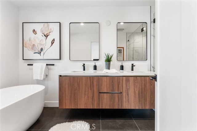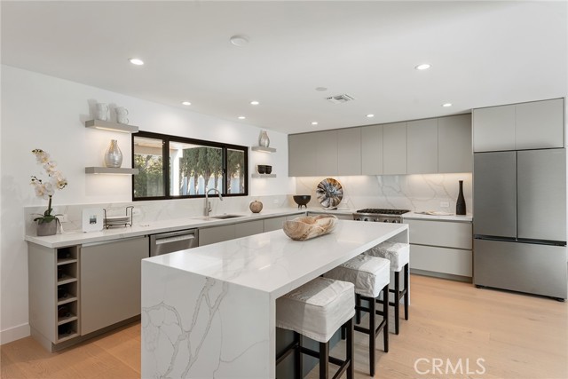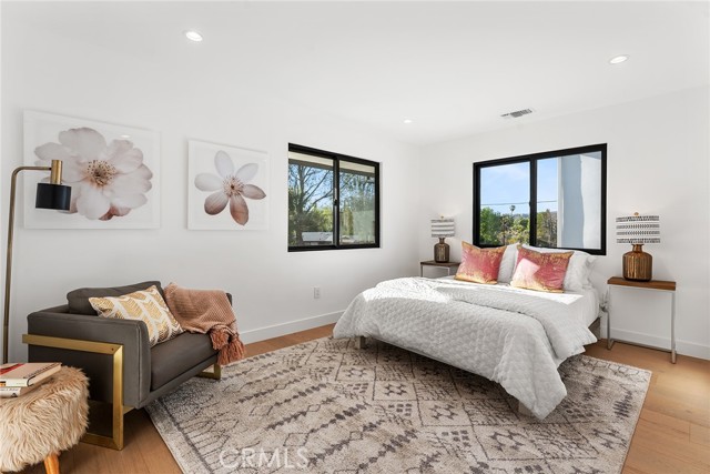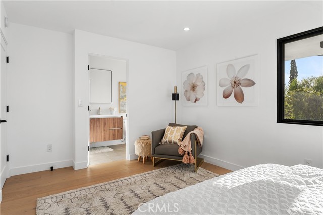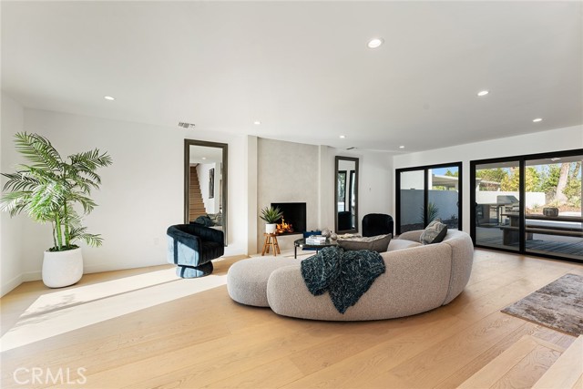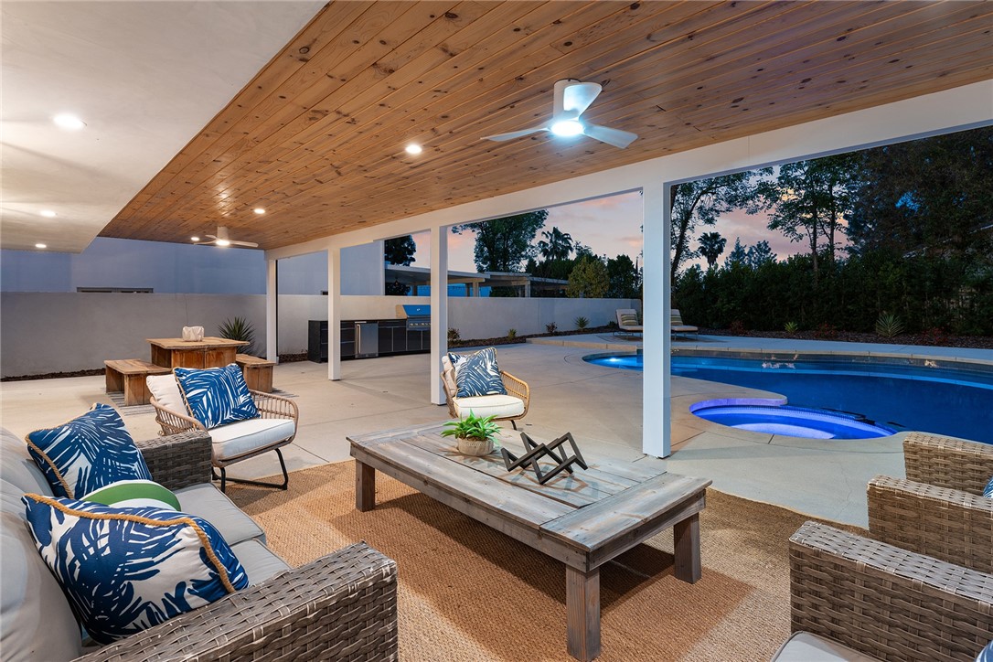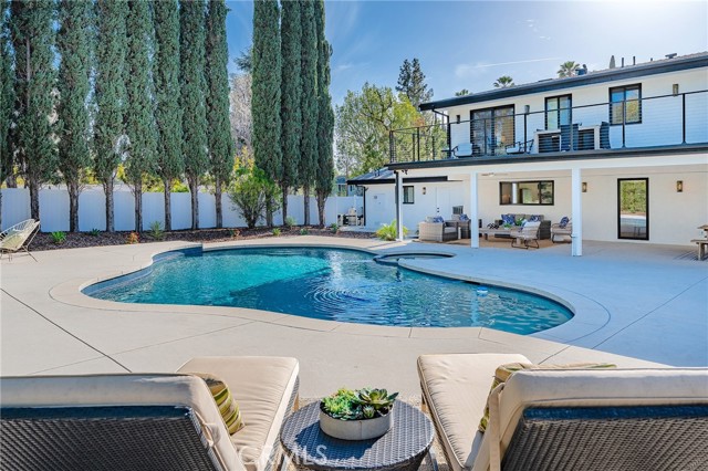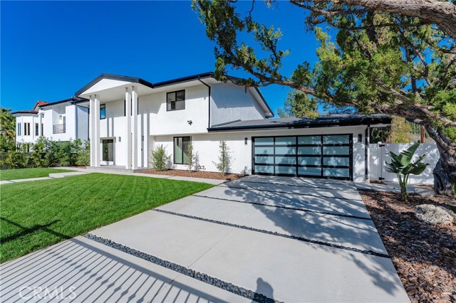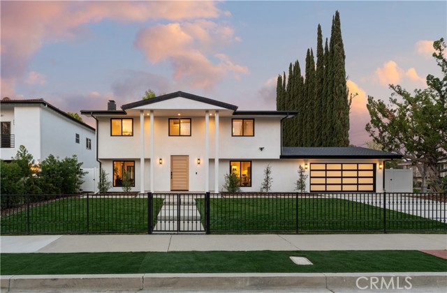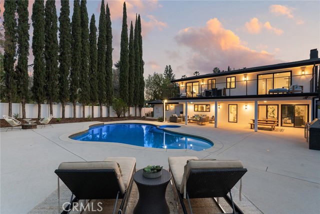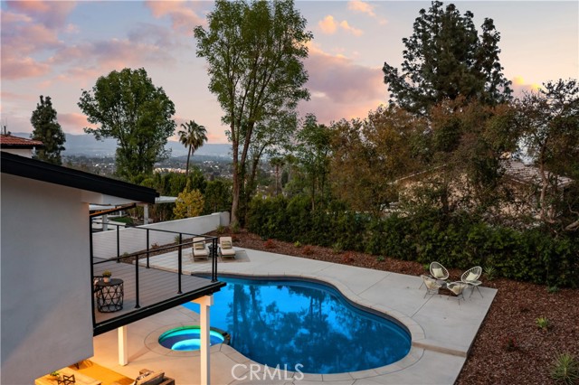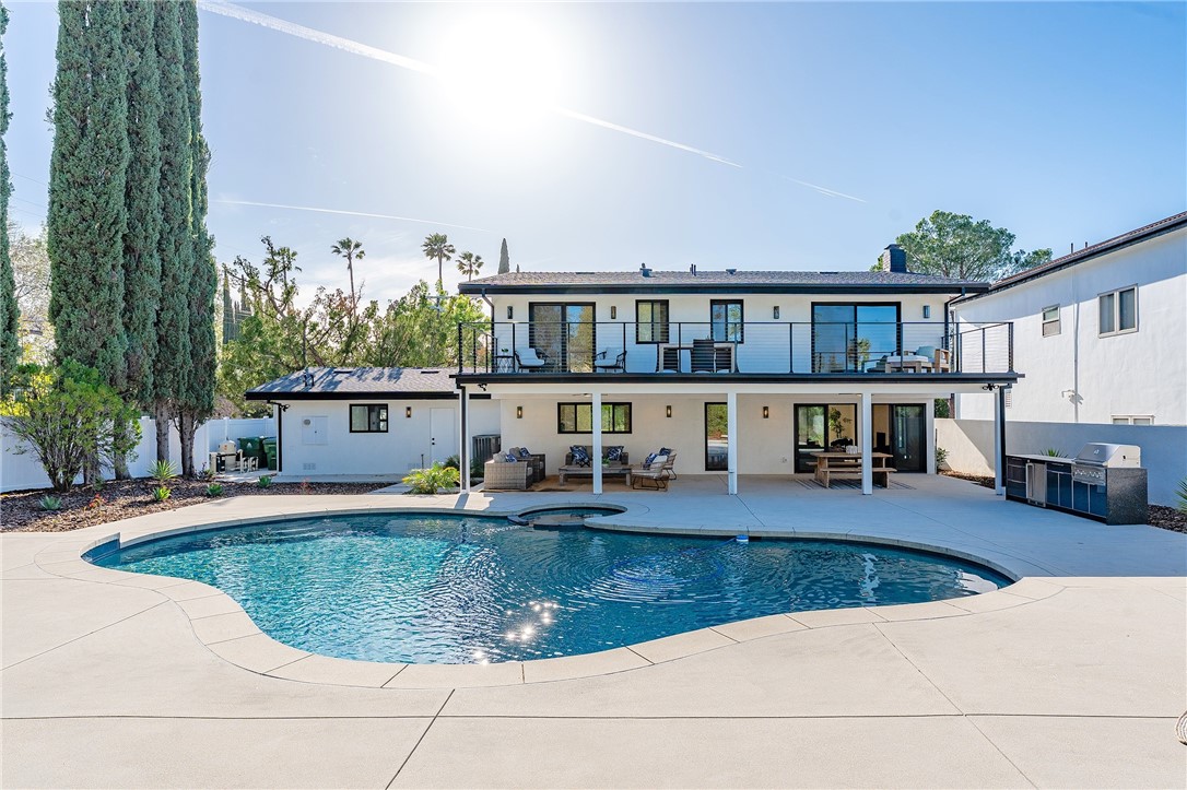 Completely reimagined & privately gated Mid-Century modern pool home located West of Valley Circle on a quiet street boasting mountain & city light views! Designer quality interiors feature a rare floor plan with 4 bedroom suites each with their own private bathrooms. No expense was spared in remodeling this home top to bottom featuring: brand new plumbing, electrical panel, HVAC, water heater, roof & gutters, pool equipment & heater, exterior hardscape + landscaping, and the list goes on! (all upgrades per seller). The gated front yard features sprawling grass lawns, newly designed pathways, & new long driveway that leads to the finished 2-car garage with direct access, new motor & door, recessed lighting, & epoxy flooring. Step inside to find a formal entry that opens to the large sunlit living room featuring expansive picture windows, limestone plastered fireplace with accent lighting, two sets of sliding glass doors that open to the covered patio ideal for indoor/outdoor flow, and wide plank oak wood flooring found throughout. The chef s kitchen opens to all living spaces and features a large center island with quartz waterfall edge counters with breakfast bar seating, stainless appliances including Viking range, custom soft close cabinetry, floating shelves with accent lighting, & oversized walk-in pantry. The kitchen opens to a separate den as well as a separate formal dining area that overlooks the backyard. A convenient powder bathroom for guests has floating vanity with accent lighting. Upstairs you will find all four bedroom suites each featuring walk-in closets with built-ins & private en-suite bathrooms with floating vanities, quartz counters, and designer tiling. The primary suite is a true sanctuary featuring access to a massive balcony deck overlooking the mountain & city light vistas and private gorgeous bathroom with dual sinks, soaking tub, and separate walk-in shower. An upstairs laundry area is located near all the bedrooms for ultimate convenience. The stunning, entertainer s backyard features a completely renovated pool and spa with pebble finish, BBQ center with fridge and storage, fire pit, sweeping covered patio with recessed lighting and ceiling fans, and ample play space with new vinyl fencing and high privacy hedging. Adjacent to Westfield Mall/Village, Calabasas Commons, Warner Center & zoned for award-winning El Camino & Hale charter schools.Interested in this Listing?
