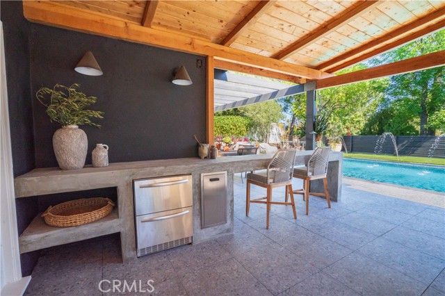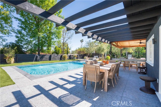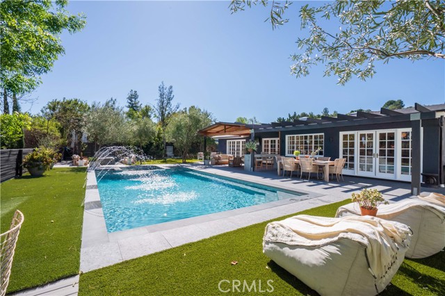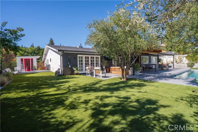 Nestled in a quiet, picturesque Woodland Hills neighborhood, this stunning mid-century ranch seamlessly blends timeless charm with modern elegance. This is an interior designer s home, every detail of this home has been carefully curated for style and functionality. A beautifully landscaped front yard sets a serene tone as you approach this 3,080-square-foot home, situated on an expansive 11,286-square-foot lot. Offering five bedrooms and four bathrooms, the layout is both spacious and versatile. The fifth bedroom and bath are privately positioned apart from the others, making it ideal for guests, extended family, or home office. The primary suite is a true retreat, featuring a walk-in closet plus an additional floor-to-ceiling closet space and French doors looking at the backyard. Its newly renovated ensuite bathroom boasts double sinks and a stunning marble shower. The additional bedrooms are generously sized, each offering ample closet space. One bedroom features a custom-built bunk bed, perfect for kids or anyone seeking a cozy, private space to read and relax. At the heart of the home, the open-concept kitchen is a chef s dream. Designed with soaring ceilings, an exposed beam, and custom cabinetry adorned with unlacquered brass handles, this space is both elegant and practical. Premium Thermador appliances, including a six-burner stove, extensive counter space, a custom wood center island, and an inviting eat-in kitchen area. The kitchen seamlessly flows into the great room, featuring a custom fireplace surround, and built-in dry bar, and French doors that open to the backyard creating a warm and inviting atmosphere. Step outside into your private backyard retreat, where a sparkling pool with water jets, a relaxing spa, and a cozy firepit await. Multiple seating areas, a covered patio designed for outdoor dining and relaxing, and lush drought-tolerant landscaping including stunning olive trees make this space both breathtaking and low maintenance. Adding to the home s versatility, a detached studio offers endless possibilities as a home office or creative space. Additionally, an outdoor craft area provides the perfect spot for hands-on projects. Located within the highly sought-after El Camino Charter School District, this exceptional property is just minutes from the freeway, Hidden Hills, Calabasas, and Warner Center. A rare blend of mid-century charm and modern luxury that must be seen to be fully appreciated.Interested in this Listing?