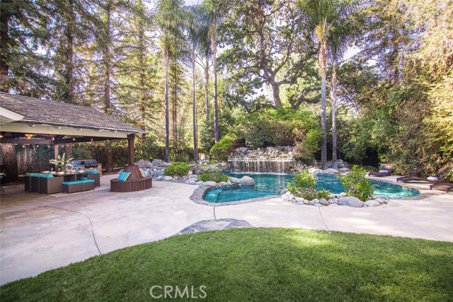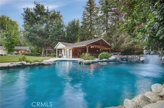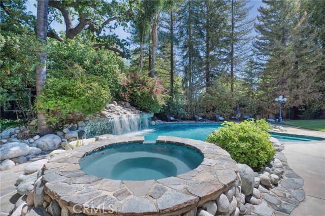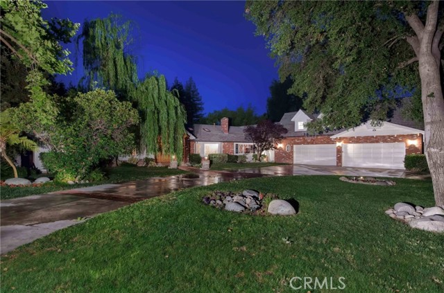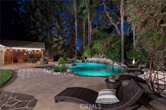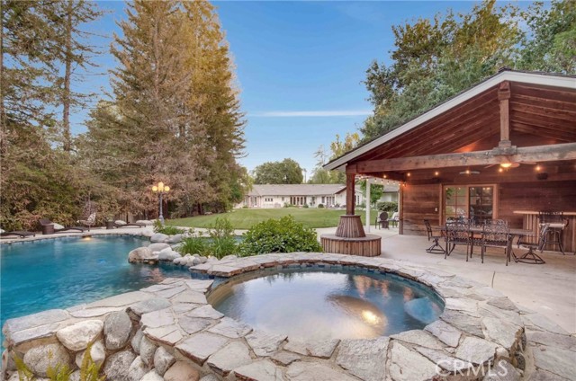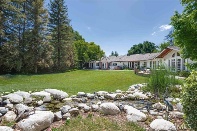 Absolutely magical Walnut Acres single story 7,000 SF estate with separate 400 SF pool house/guest unit situated on over an acre flat of land and located at the very end of a private cul-de-sac adjacent to Hidden Hills. This property is one of the largest estate lots ever offered in the neighborhood, boasting jaw dropping parklike grounds that truly take your breath away. The property sits back from the street with wide sweeping circular driveway and 4-car garage offering ample parking for large events. The sprawling custom built single story ranch offers grand living spaces featuring vaulted wood beamed ceilings with skylights and large picture windows that let in wonderful natural light. Interiors include a grand entry foyer, formal living room with fireplace, formal dining room with 1,000 bottle subterranean wine cellar and butler s pantry, separate family room with fireplace and wet bar, oversized kitchen with stainless appliances and walk-in pantry, executive office with custom built-ins, and massive upstairs bonus room ideal for movie theater/game room/play area. There are 6 spacious bedrooms in the main house, including the luxurious primary suite featuring fireplace, French doors that open to the yard, two walk-in closets, and spa bathroom with sauna. A convenient powder bathroom for guests is located at the entry and there is a separate guest quarters wing with laundry room. The stunning backyard is unlike no other you have ever seen featuring expansive rolling lawns with mature trees that make you feel like you own your own private park where you can host wedding sized events. There is a mammoth custom beach entry pool with waterfall, spa, fire pit, covered pavilion with bar, 2 BBQ centers, Koi pond with bridge, children s play area with tree house and actual jungle gym, rose garden, and wraparound patios. There is also a separate 400 SF pool house/guest unit with full bathroom. Adjacent to dining/shopping at The Calabasas Commons and Westfield Mall & Village, & zoned for award-winning El Camino & Hale charter schools. Don t miss this spectacular offering!Interested in this Listing?