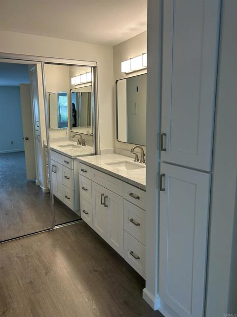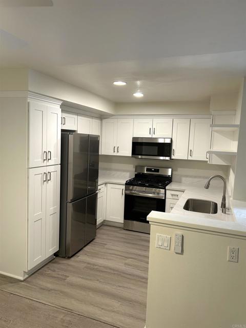 Ready June 13th. Resort style living at The Lakes in prime Carmel Valley/East Del Mar off High Bluff, walking distance to the new One Paseo shops and restaurants, parks, and an easy commute location. This downstairs one-story condo unit near the tennis courts features an all new kitchen with white Shaker cabinets, quartz countertop & stainless steel appliances, all new bathroom vanity & storage cabinets, newer gray wood-laminate flooring throughout, and a newer stacked washer/dryer. Relax on the lovely patio overlooking a babbling stream and lush landscaping. There is one covered carport parking space and a storage locker. Minimum one year lease and available for long term occupancy. Non-smoking inside and outside. No pets. Must have good credit 700 score ++ and good rental history.