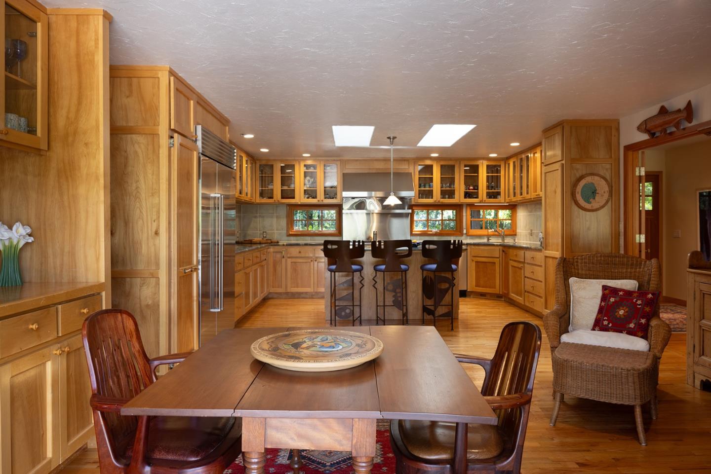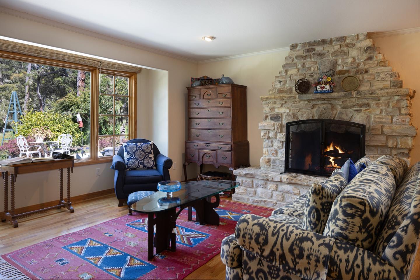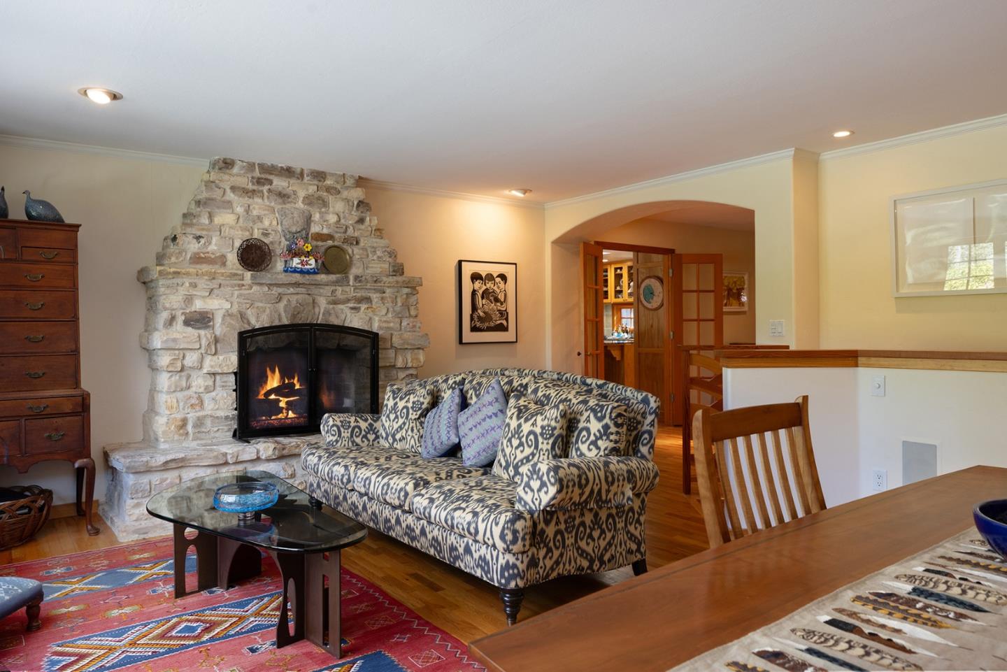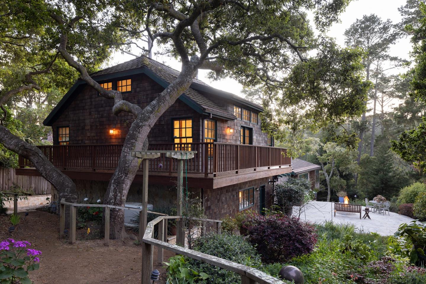 A Big Sur feeling greets you on this wooded setting with a custom built electric gate. The exterior of stone and wood invite you into this craftsman style home. Hardwood floors, unique granite countertops and two unique fireplaces are earmarks of the main floor. The kitchen and breakfast area are of a generous size and open out to a sun-drenched patio. The living/dining room features spacious picture windows with forest views. There are three bedrooms and two baths on the main floor, one of which is being used as a custom fitted office. Downstairs there are two more bedrooms, one with access to the wrap around stone patio overlooking the forest. A top floor studio of over 600 sq. ft. provides space for a home office/family room or artist studio. And its just a few blocks to the center of town.Interested in this Listing?