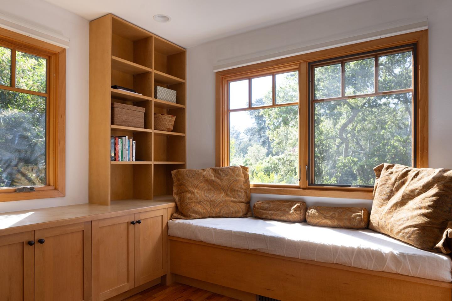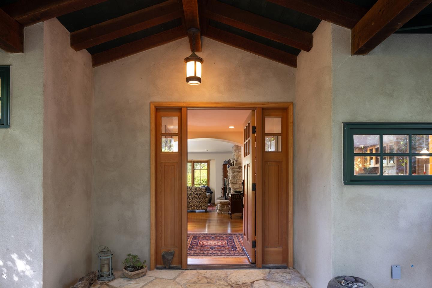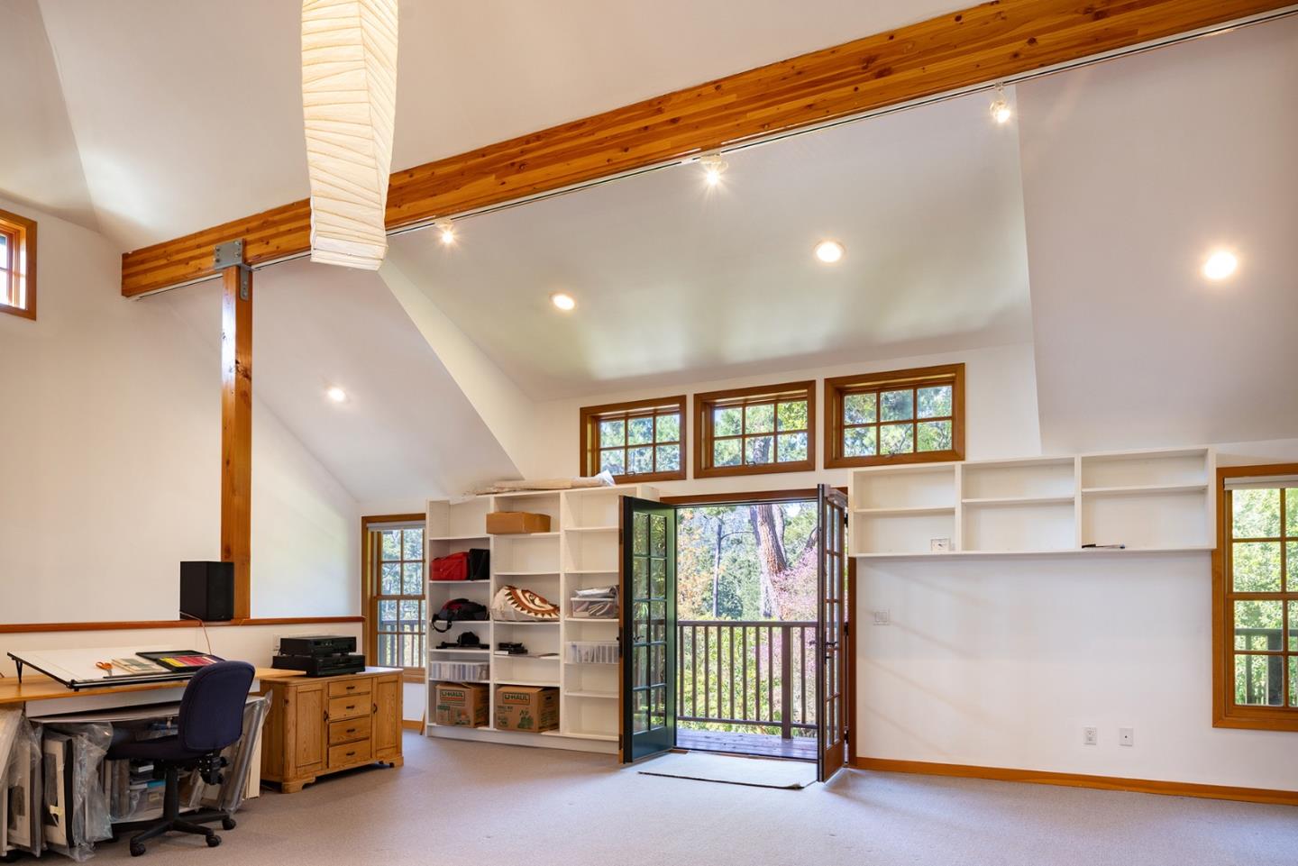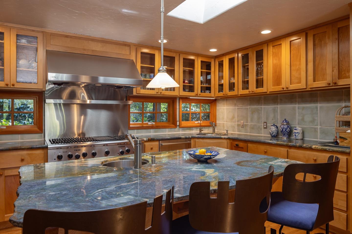 A Big Sur feeling greets you on this wooded setting with a custom built electric gate. The exterior of stone and wood invite you into this craftsman style home. Hardwood floors, unique granite countertops and two unique fireplaces are earmarks of the main floor. The kitchen and breakfast area are of a generous size and open out to a sun-drenched patio. The living/dining room features spacious picture windows with forest views. There are three bedrooms and two baths on the main floor, one of which is being used as a custom fitted office. Downstairs there are two more bedrooms, one with access to the wrap around stone patio overlooking the forest. A top floor studio of over 600 sq. ft. provides space for a home office/family room or artist studio. And its just a few blocks to the center of town.Interested in this Listing?