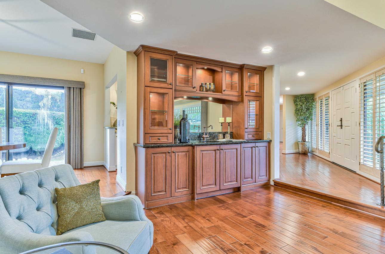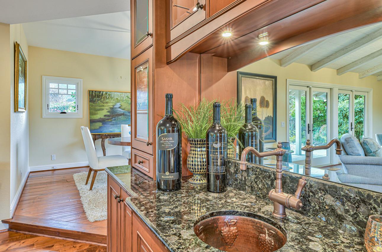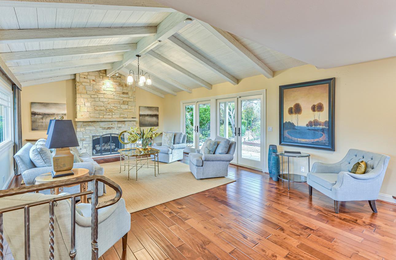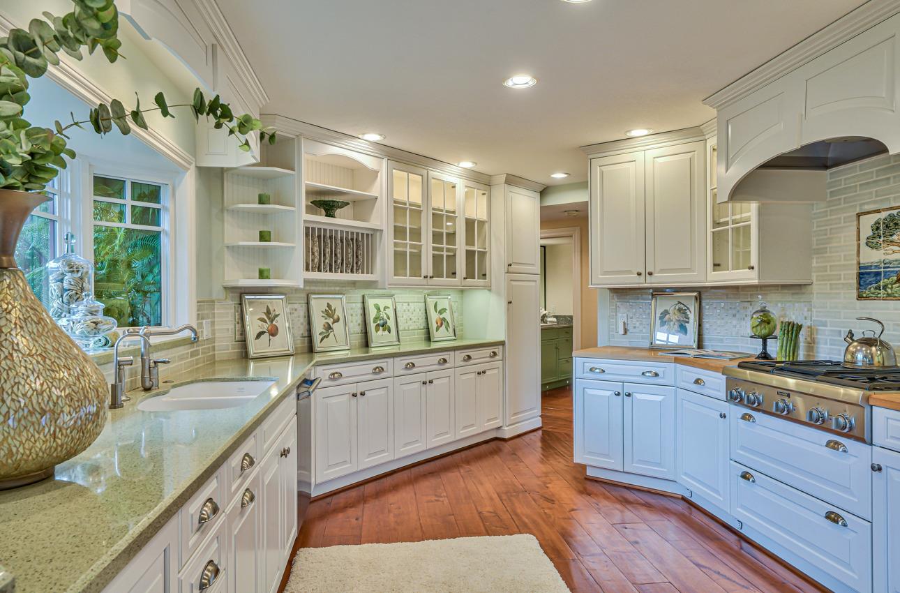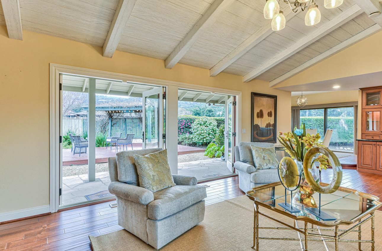 Fall in love with this enchanting home, ideally situated just steps away from Quail Lodge Golf Course. Boasting a south-facing orientation, the residence offers breathtaking mountain views and is nestled on a private cul-de-sac. This single-level home comprises three bedrooms and two bathrooms, featuring vaulted ceilings and glass doors that invite an abundance of natural light, creating a warm and inviting atmosphere. The chef's kitchen has been thoughtfully updated with Viking appliances and showcases charming white cupboards adorned with lighting. Each bedroom in the home offers a glass door opening to a private patio, providing a seamless connection between indoor and outdoor living. Elegant hardwood floors grace the entirety of the home, adding a touch of sophistication to the interior. Step outside to discover a mature garden that serves as a true oasis. Adorned with fruit trees, roses, and a wisteria-draped gazebo, the outdoor space feels like a private paradise. A pond and wateInterested in this Listing?