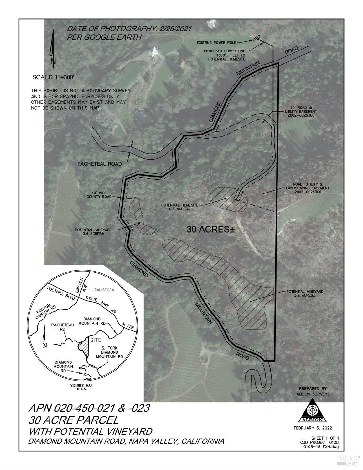 Located in the renowned Diamond Mountain District AVA just south of charming Calistoga in the upper Napa Valley, this 30+/- acre parcel boasts @4.4 acres potentially plantable to vineyard (per slope survey). Not too far up Diamond Mountain an close to esteemed wineries like Diamond Creek Winery and Wallis Estate Vineyard, this well-situated parcel has two potential building sites each with private-feeling hillside-vineyard and dramatic Mount St. Helena views. There is a 30-GPM well (per 2017 report) and potential access to utilities from an existing power pole on Seller's neighboring property. Come see this appealingly acreage with potential for a dream estate vineyard in one of the best parts of Napa Valley's wine mecca -- legendary Diamond Mountain.