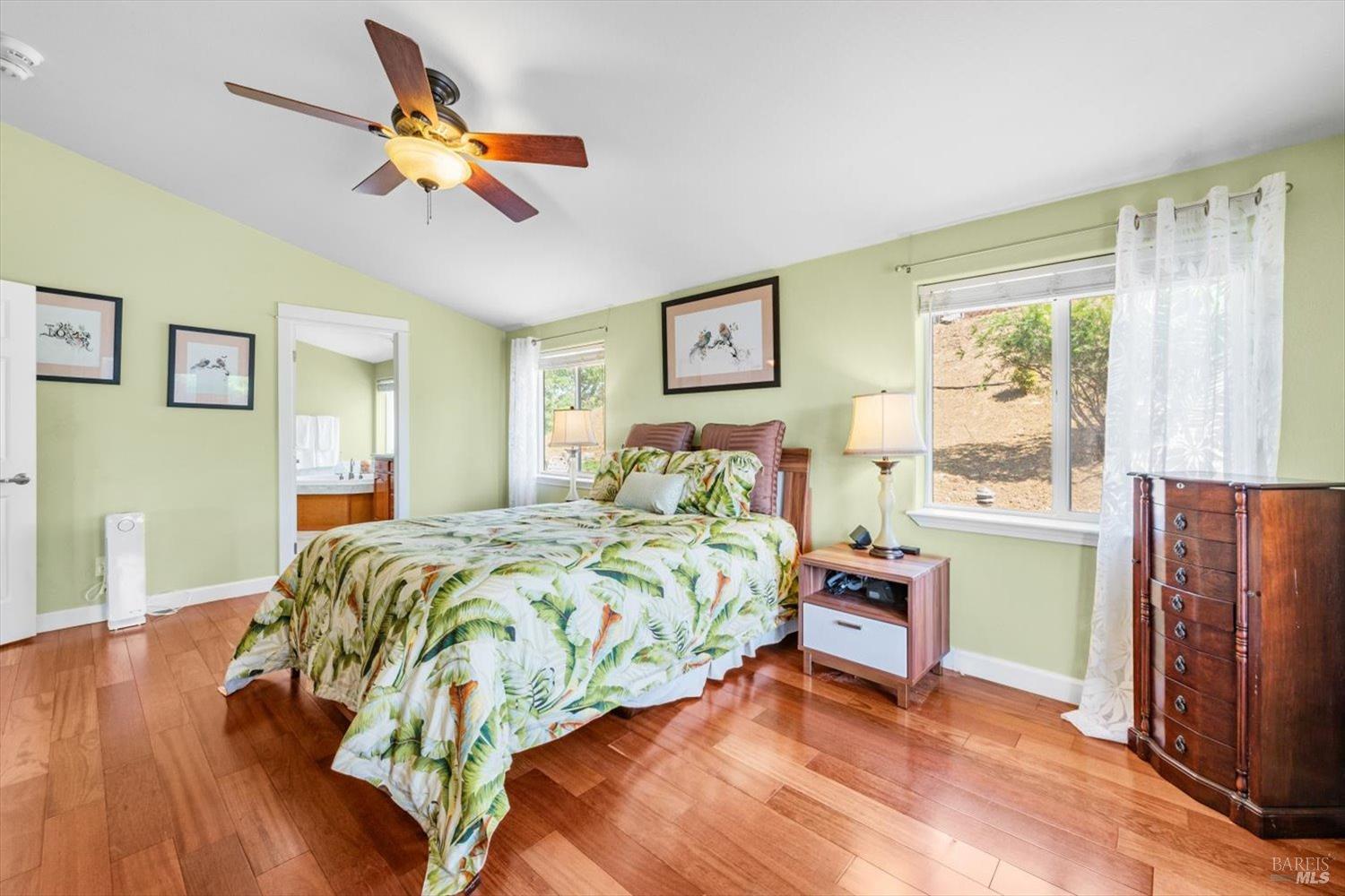 Best Price per Square Foot in Berryessa Highlands! Lake Views, Light & Versatility! Nestled on a prime corner lot with panoramic views of Lake Berryessa and picture-perfect sunsets, this exceptional custom residence delivers style, space, and smart design. Inside the main home, you'll find 3 spacious bedrooms and 2 full baths, soaring ceilings, warm Brazilian cherrywood floors, and an entertainer's dream kitchen complete with quartz countertops, soft-close cabinetry, and an oversized island that flows into the open-concept family room with fireplace. The private primary suite feels like a spa retreatfeaturing heated flooring, a jetted tub, and French doors that open to a serene covered patio with lake views. Need room for guests or extra income? Use the home as a 4BD/3BA or take advantage of the detached rec room above the garage, complete with its own bedroom, bathroom, and kitchenetteideal for visitors, tenants, or multigenerational living. The beautifully landscaped lot offers custom brickwork, terraced planting areas, RV/boat parking with power, a full-house generator, and owned solar. Whether you're gathering on the patio, relaxing indoors, or soaking in the views, this property offers a unique blend of privacy and flexibility.Interested in this Listing?