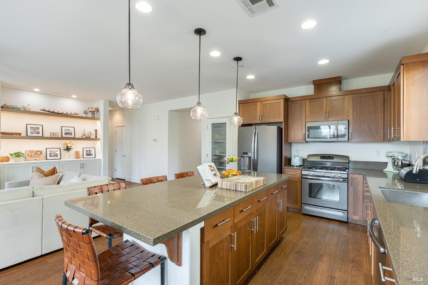 Single level living in Napa Valley's Amber Leaf community. This 2013 DeNova home offers energy-conscious solar and custom built-in cabinetry in the family room, blending efficiency with elevated design. The Craftsman-inspired floor plan places the primary suite on its own wing for privacy and comfort. A spacious kitchen stands at the heart of the home, featuring a generous island and high-end appliances that make cooking and entertaining a pleasure. The backyard is beautifully landscaped with a pergola-shaded patio, ideal for outdoor dining or gathering with friends. The quiet, dead-end street and inviting front porch create a relaxed Wine Country setting. Light, open, and thoughtfully designed, this home has been gently lived in and well cared for since new. Close to downtown Napa, world-renowned wineries, shopping, and restaurants, this property offers a rare combination of convenience, style, and single-level comfort in one of the valley's most desirable neighborhoods. A wonderful opportunity to enjoy the Napa lifestyle.Interested in this Listing?