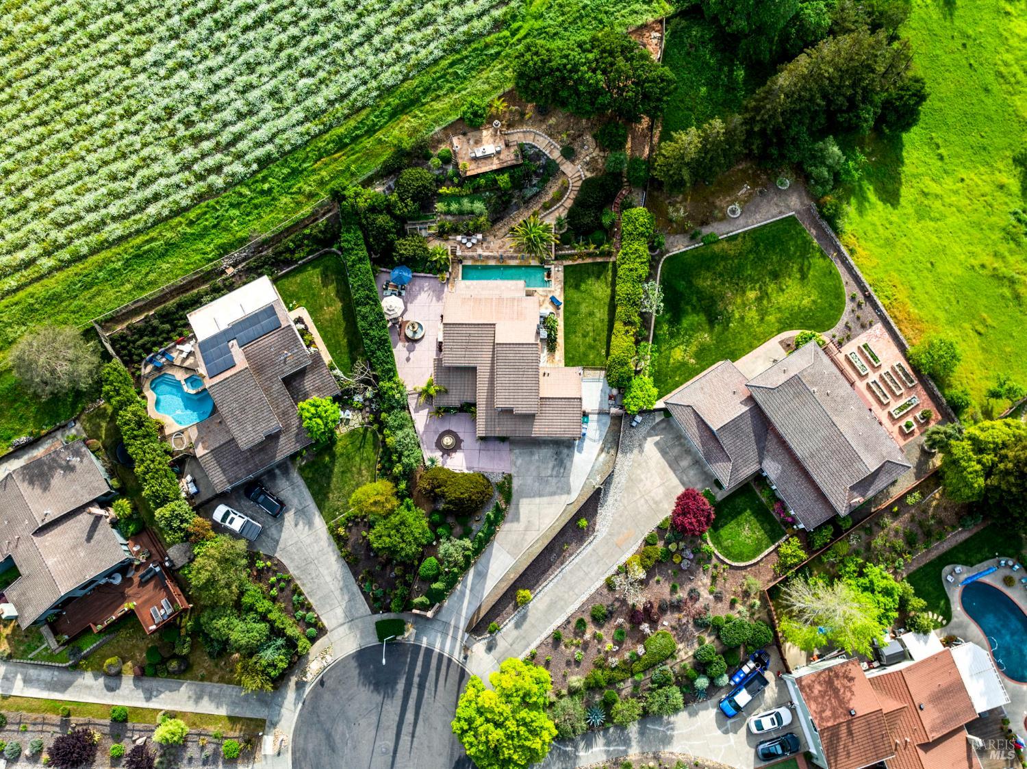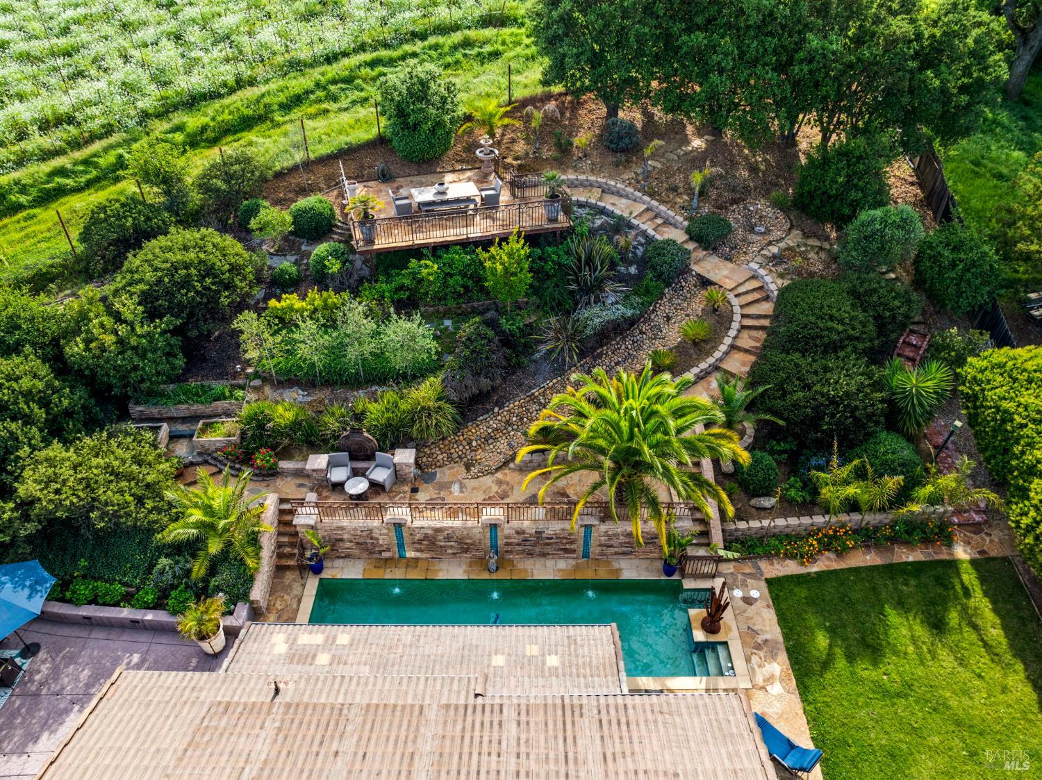Perched atop a private knoll in one of Browns Valley's most coveted enclaves, this view oriented residence offers a rare sense of privacy, scale, and classic Napa Valley living. Set at the end of a quiet cul de sac on approximately half an acre, the property captures sweeping hillside and valley vistas while feeling worlds away. The grounds unfold like a private retreat, framed by mature olive trees, layered landscaping, tranquil water features, and winding garden paths. Multiple outdoor living spaces invite both intimate moments and larger gatherings, with a pool, sunset view deck, and inviting areas for al fresco dining, gardening, and evenings under the Napa sky. Inside, a flexible four bedroom, three bathroom layout balances comfort and function, with formal living and dining rooms complemented by a welcoming family room centered around a fireplace. The home transitions effortlessly between indoor and outdoor spaces, designed for both everyday living and entertaining. The kitchen offers stainless steel appliances, generous storage, and a built in breakfast nook. Upstairs, spacious bedrooms take in surrounding hillside views, while the primary suite features a spa inspired bath with soaking tub, steam shower, and dual vanity. The original three car garage has been thoughtfully adapted to include a two car garage, private office with direct backyard access, and additional storage, creating versatility for today's lifestyle needs. A courtyard entry with fountain sets a gracious tone on arrival. Ideally located near Browns Valley School, Browns Valley Market, and local favorites. A rare offering defined by privacy, views, and the enduring appeal of Napa Valley living.Interested in this Listing?