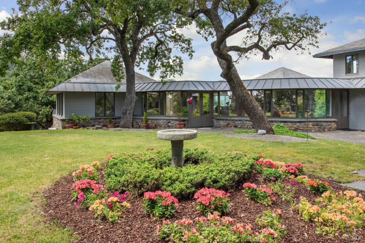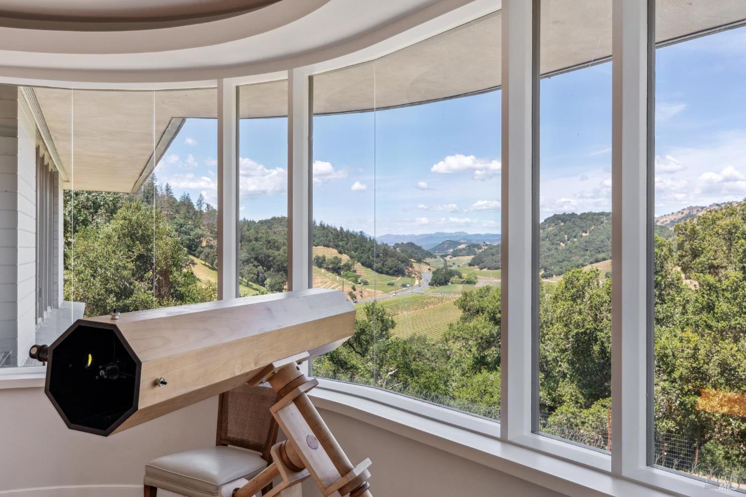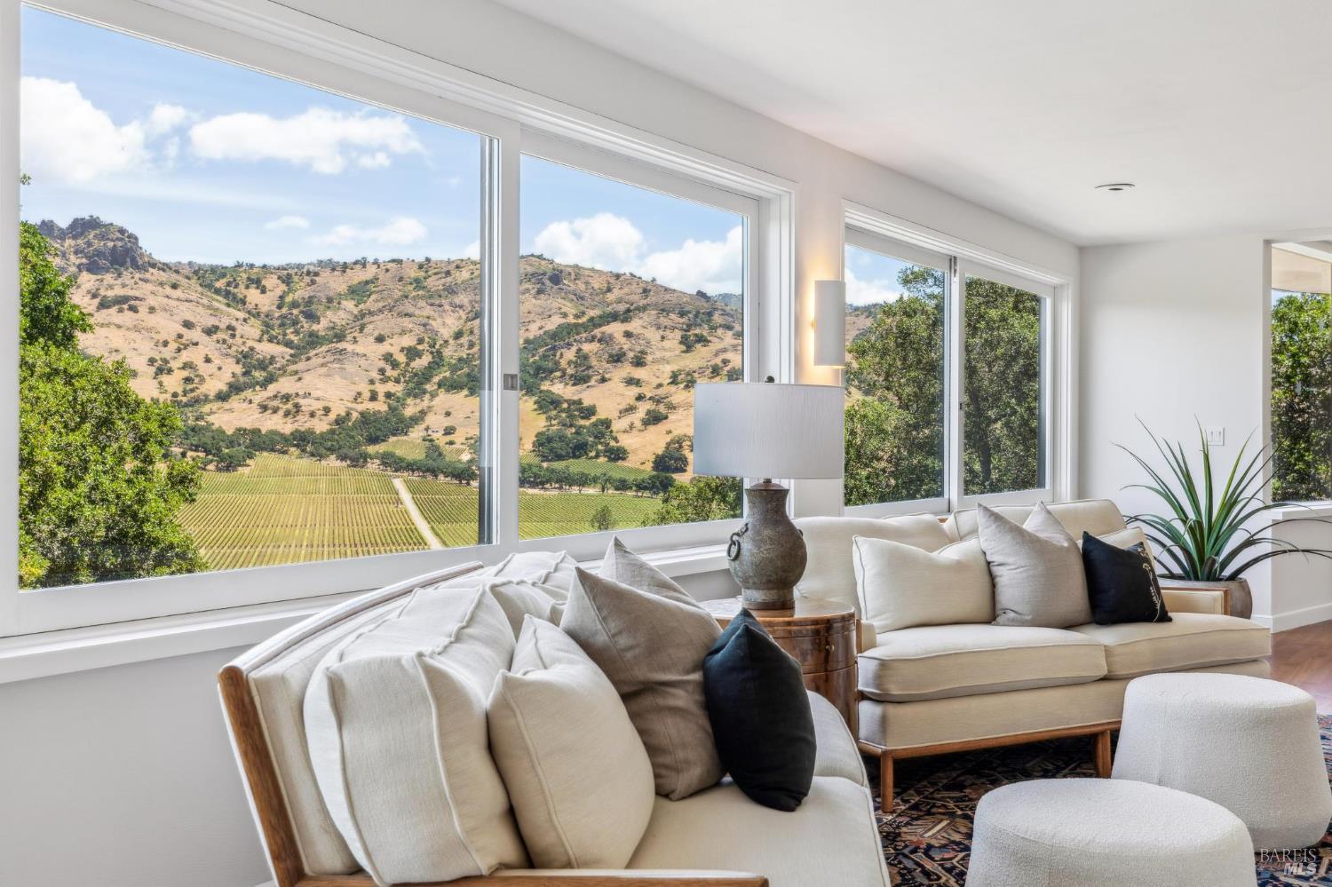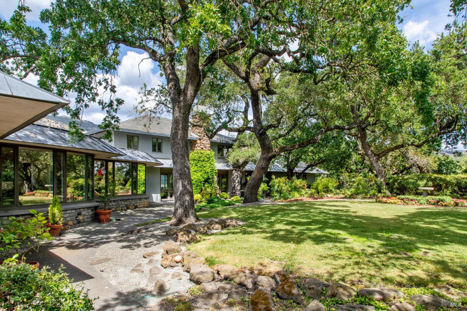 The incredible legacy of this estate will capture your imagination, while the beauty of the setting and the style and comfort of the home will capture your heart. Perched atop a knoll and anchored in bedrock, this 7,912 SF, 6-bedroom home commands views of Napa Valley with Stags Leap Palisades as the backdrop. Designed to take in the ever-changing light on the peaks, the home blends strength and artistry with restrained elegance. The glass-paneled doors open to amber wood floors and a gallery of windows. The warm bookshelf lined library is tucked down the hall, while the living room with open beams, stone fireplace, built-ins and hidden glass doors that partition it from the window gallery, then flows seamlessly to the bar & dining room with gorgeous views. The chef's kitchen features butcher block counters, a six-burner Wolf range, skylight, and is open to the family room. The west-facing primary suite offers a marble bath, deep soaking tub, and spacious dressing room. The lower level includes a former dance studio, additional bed & bath, woodworking shop, wine cellar, and guest suite with its own outside patio. Upstairs, three charming bedrooms feel like a secret retreat. Surrounded by gardens, and heritage oaks this 8.19 acres is history waiting to be loved and reimagined.Interested in this Listing?